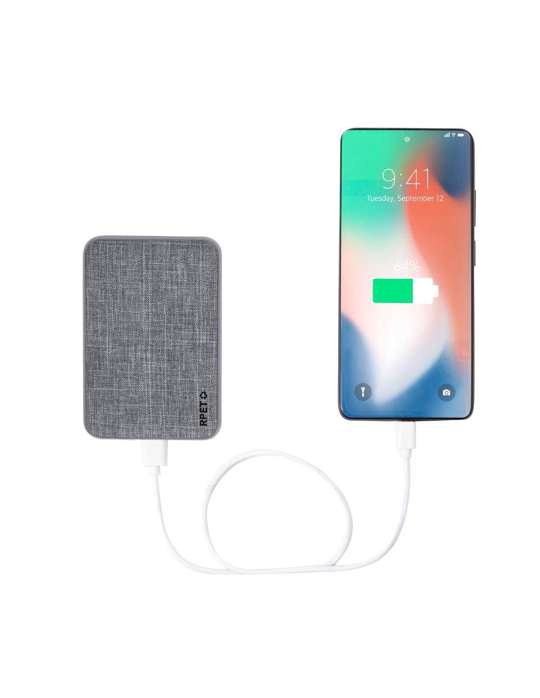 Batería auxiliar externa recubierta de suave poliéster RPET. De 5.000 mAh de capacidad, con conexión de entrada y salida Tipo C + 2 salidas USB. Indicador de estado de carga y cable de carga Micro USB incluido. Con amplia superficie de marcaje y con logotipo RPET. Presentado en atractiva caja de diseño kraft.El material RPET se elabora a partir de plástico reciclado, para así fomentar la reutilización de residuos plásticos y ayudar a la sostenibilidad del planeta.Las capacidades mostradas en todas nuestras baterías auxiliares externas son reales, incorporando todas ellas baterías de grado A y no recicladas, con una vida útil de al menos 500 ciclos de carga y según normativa CE.Además, están fabricadas conforme a los estándares RoHS y en cumplimiento con los siguientes requisitos de seguridad:Sistema de protección contra sobrecarga del power bank.Sistema de protección contra descarga completa que proporciona una mayor durabilidad del power bank.Sistema de bloqueo para evitar cortocircuitos.Sistema de transferencia de carga constante, acorde con la capacidad del dispositivo de destino.