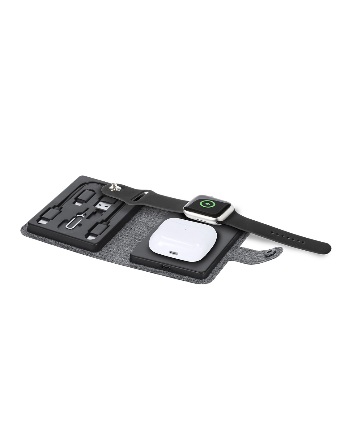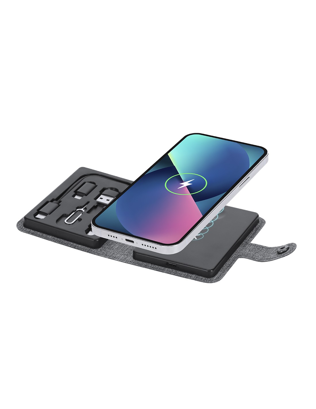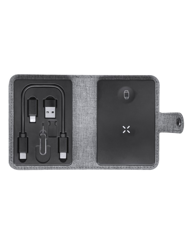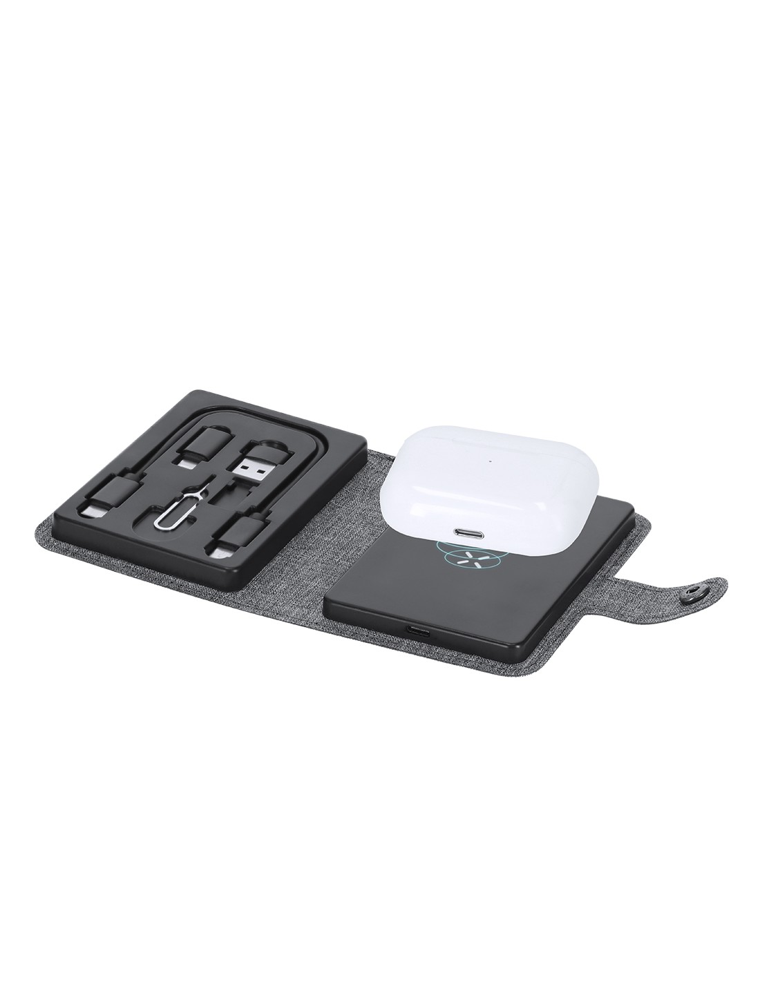 Completa base cargadora fabricada en 300D RPET. Estuche con cierre de corchete incluyendo base cargadora inalámbrica Qi para smartphone, auriculares y smartwatch. Contiene cable de conexión Tipo C en ambos extremos, además de adaptadores USB y lightning/micro USB. El set lo completa un eyector de tarjeta SIM y un compartimento para guardar una tarjeta Micro SIM. Con distintivo RPET.El material RPET se elabora a partir de plástico reciclado, para así fomentar la reutilización de residuos plásticos y ayudar a la sostenibilidad del planeta.