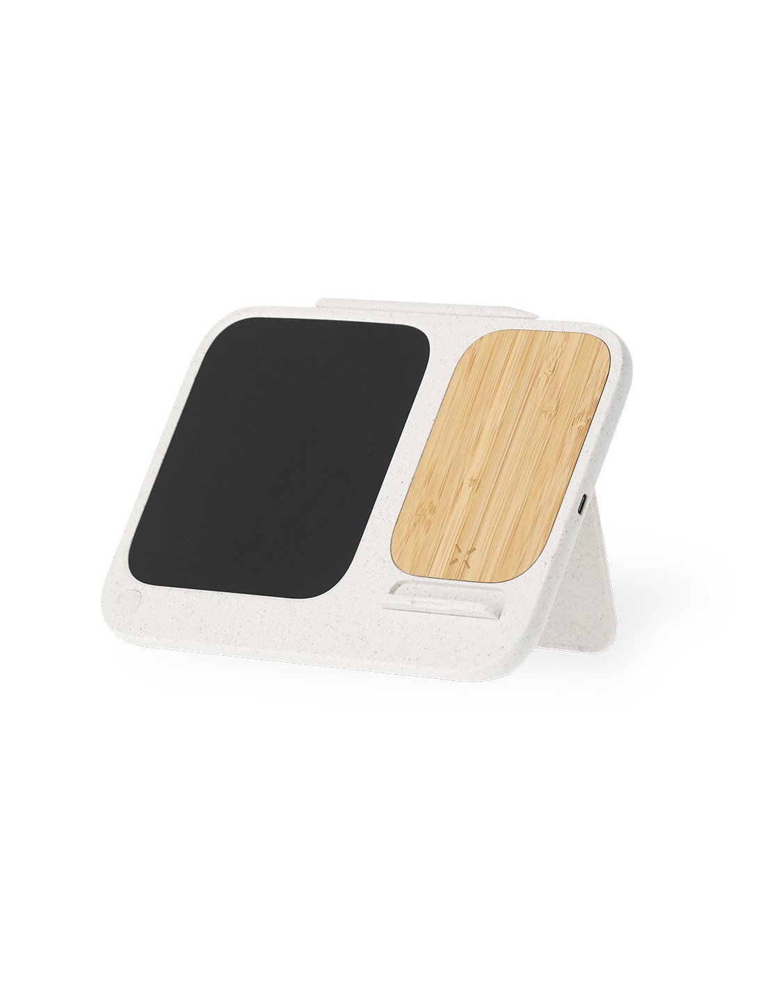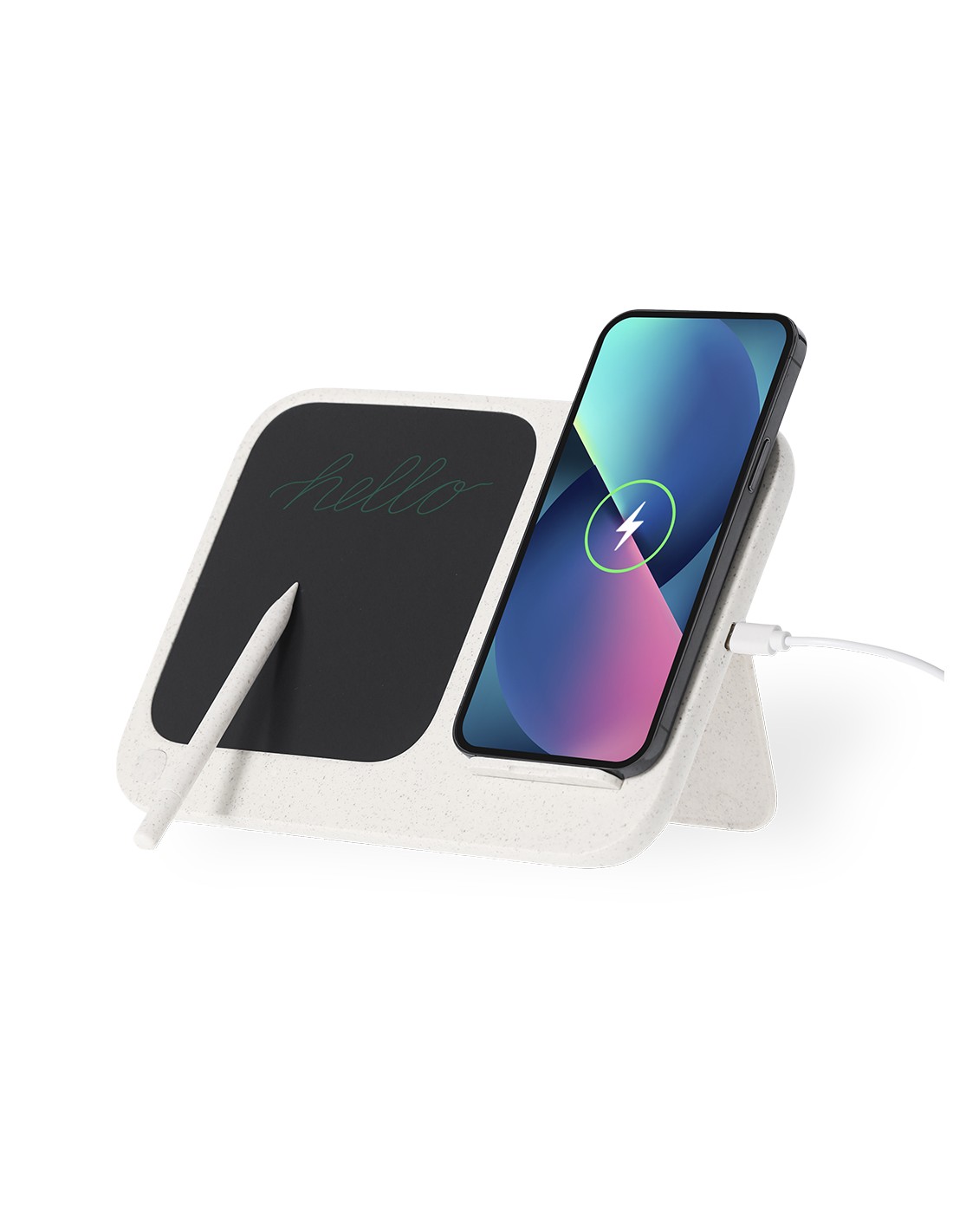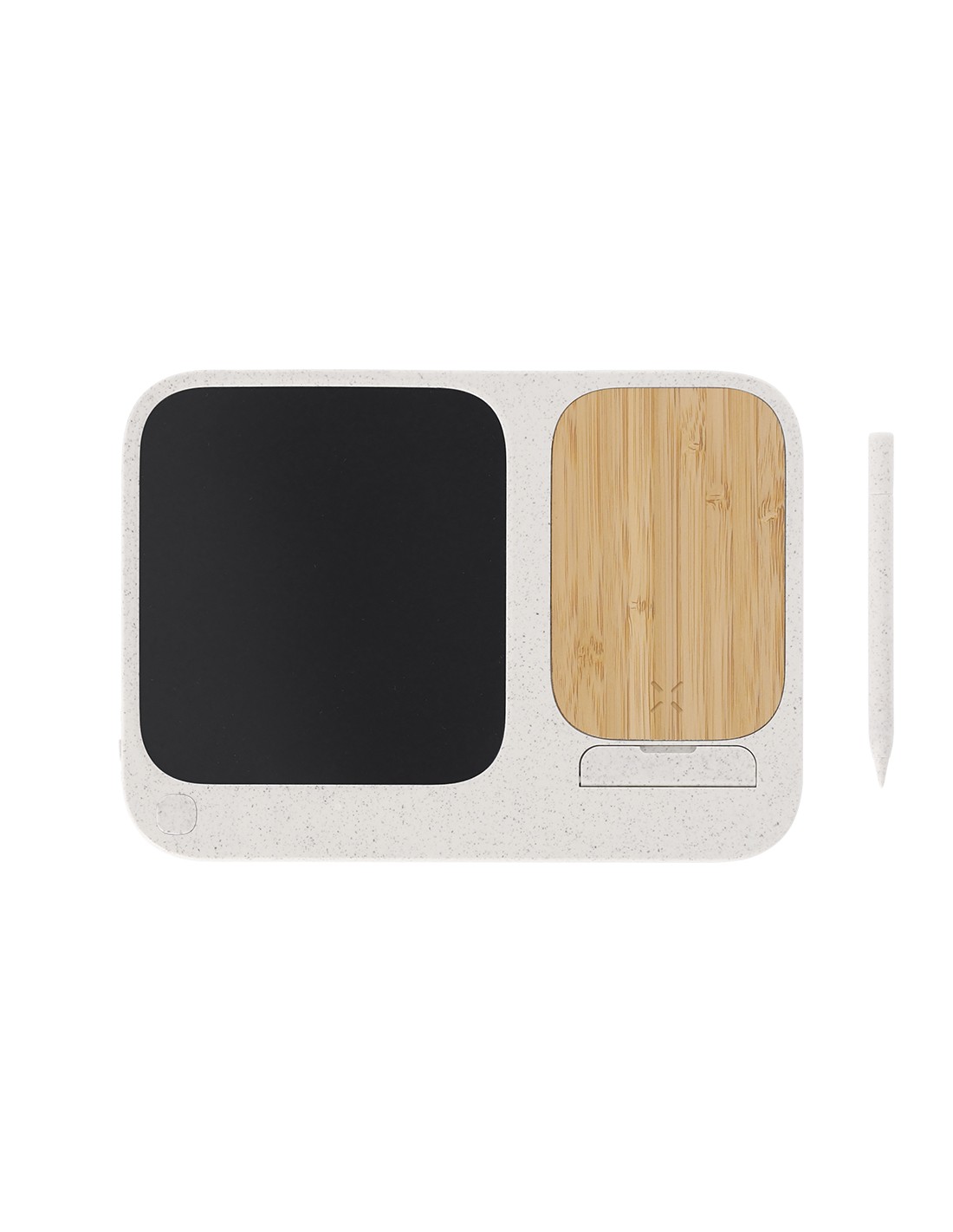 Cargador inalámbrico de 15W con pizarra digital integrada, fabricado en caña de trigo y bambú. Con función de soporte para smartphone compatible con dispositivos equipados con tecnología de carga inalámbrica Qi e indicador de estado de carga. Cuenta con pizarra tablet LCD de 6 pulgadas e incluye lápiz , botón de borrado y bloqueo anti borrado. Materiales como el bambú fomentan la utilización de materias primas naturales reduciendo las emisiones contaminantes. Además, el bambú proviene de una planta de gran resistencia y versatilidad, con crecimiento y regeneración rápida, siendo una excelente alternativa al uso de madera tradicional.La caña de trigo fomenta la utilización de materias primas naturales, reduciendo así las emisiones contaminantes.Fabricado conforme a los estándares RoHS y en cumplimiento con los siguientes requisitos de seguridad:Sistema de protección contra sobrecalentamiento. Sistema de protección contra sobrecarga. Sistema de bloqueo para evitar cortocircuitos.