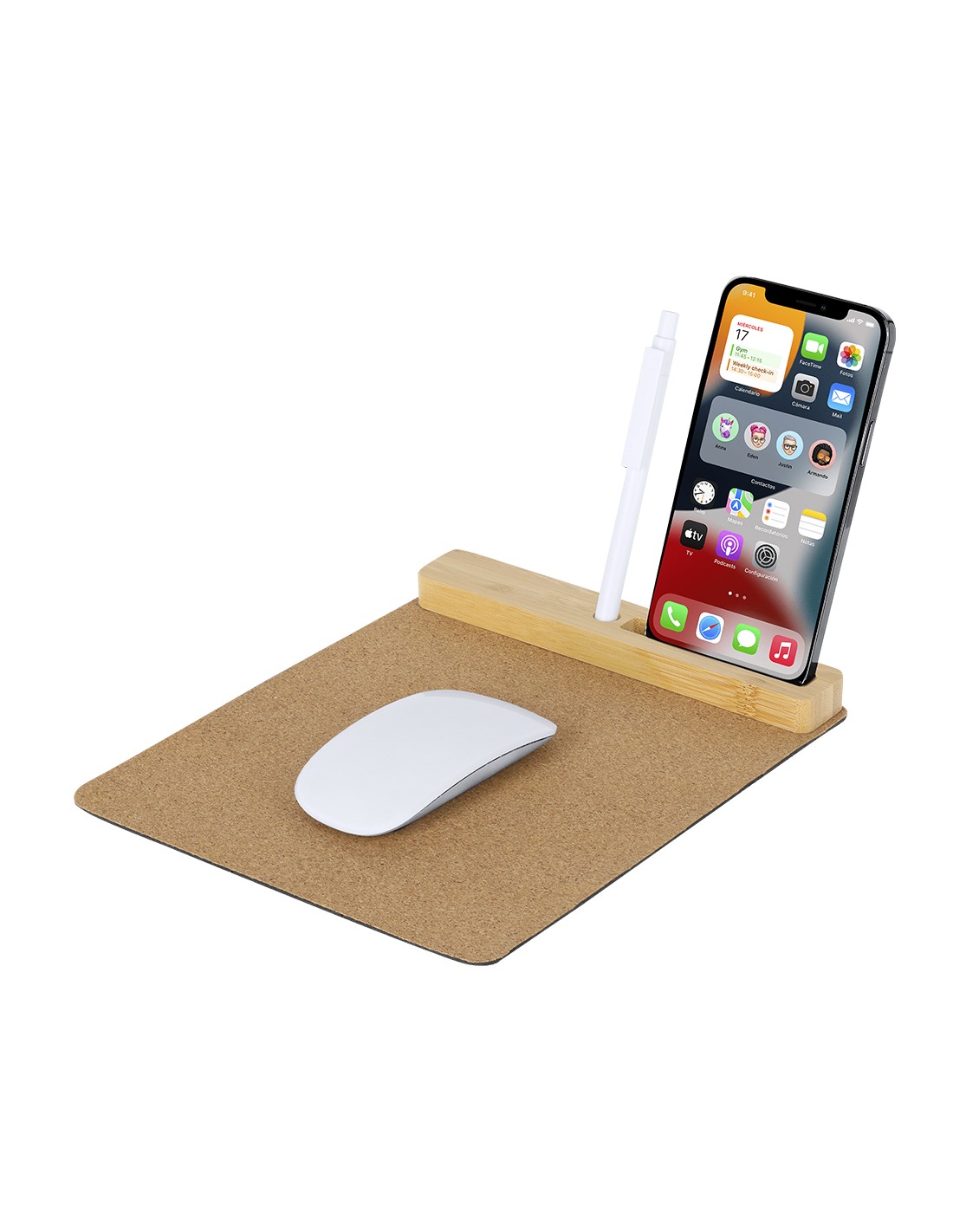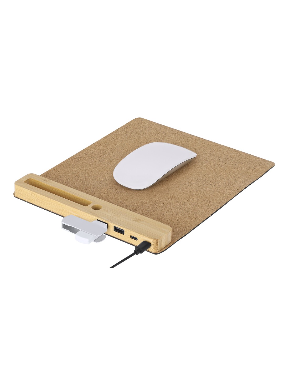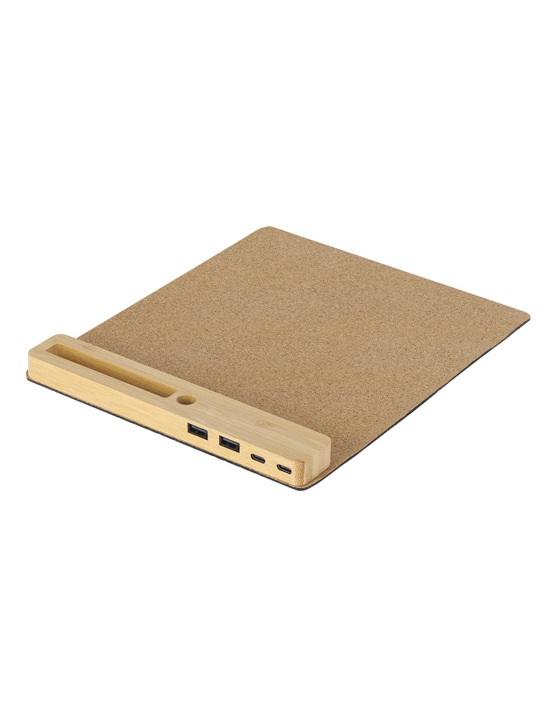 Alfombrilla multifunción fabricada en combinación de suave corcho y bambú. Flexible y con entrada Tipo C -cable incluido-, una salida Tipo C, y dos salidas USB; con función de sincronización de datos. Incluye soporte para smartphone y soporte para bolígrafos en la base de bambú. Es antideslizante y estable, garantizando una confortable experiencia de uso.Elaborado con elementos vegetales para así fomentar la utilización de materias primas naturales y reducir las emisiones contaminantes.Materiales como el bambú fomentan la utilización de materias primas naturales reduciendo las emisiones contaminantes. Además, el bambú proviene de una planta de gran resistencia y versatilidad, con crecimiento y regeneración rápida, siendo una excelente alternativa al uso de madera tradicional.