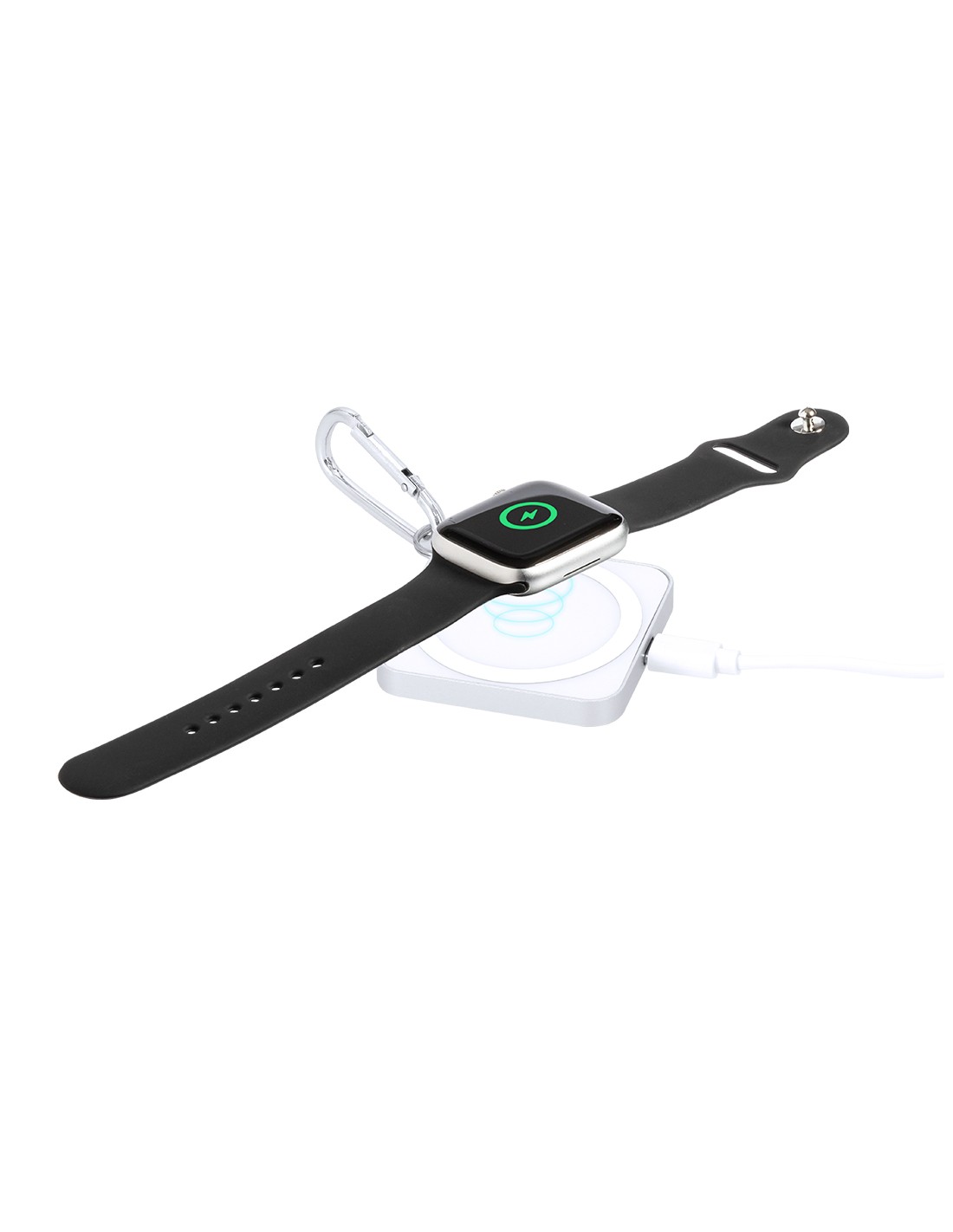 Cargador inalámbrico 15W fabricado en aluminio. Diseñado para la carga de smartphone, auriculares y smartwatch. Con fijación magnética. Incluye mosquetón metálico de transporte. Conexión tipo C.