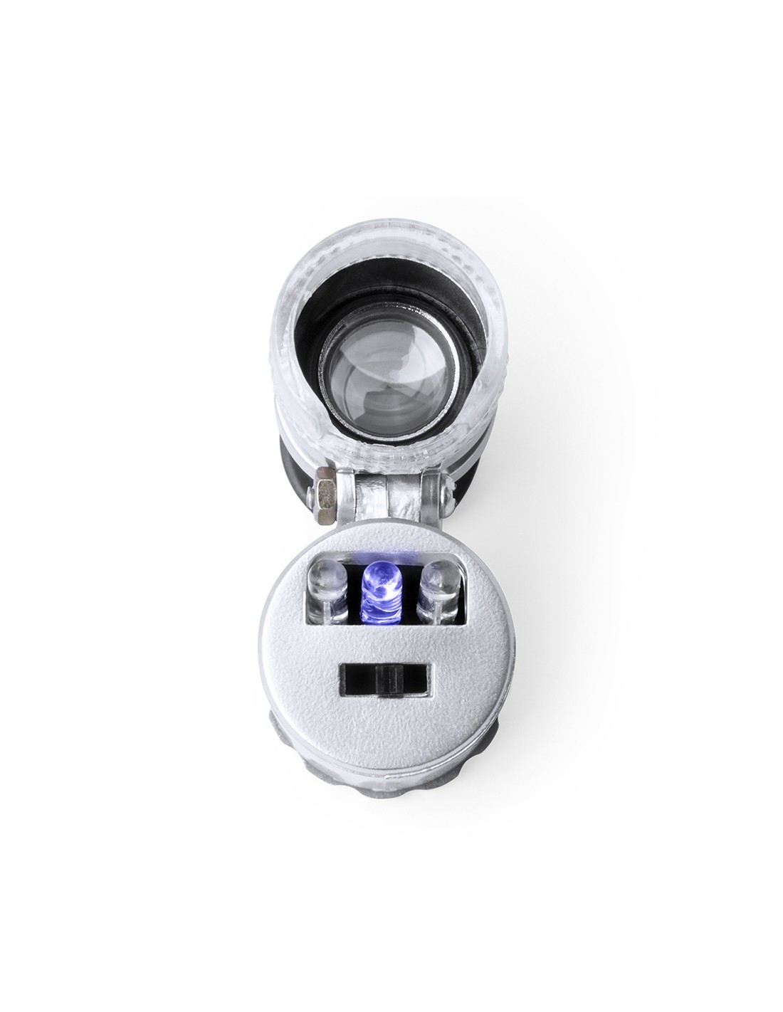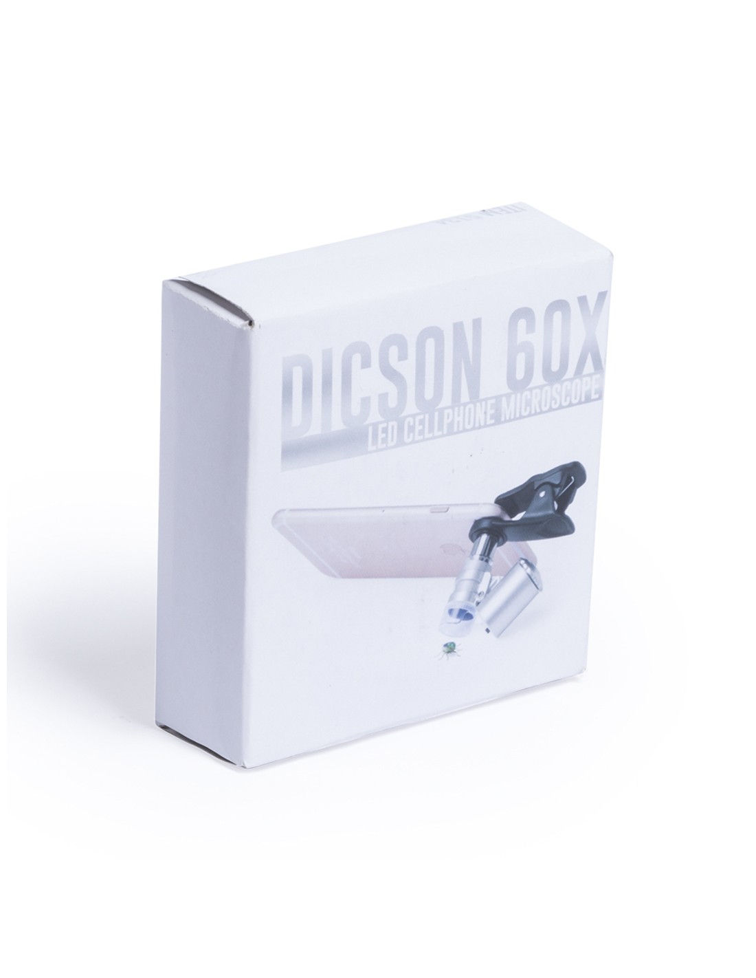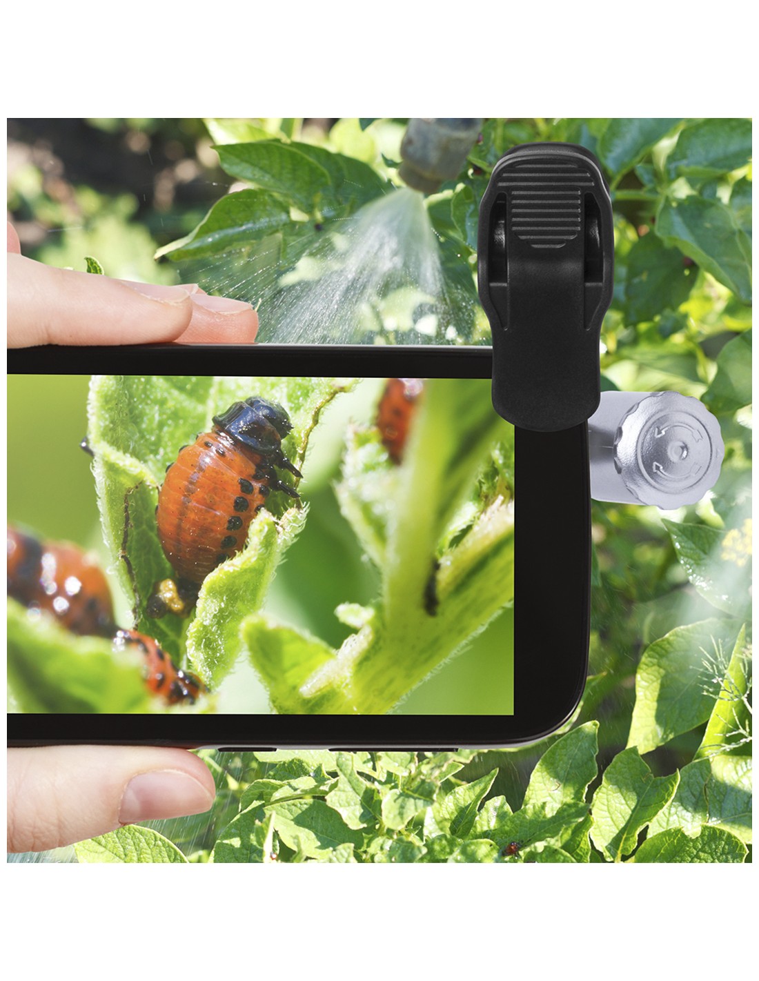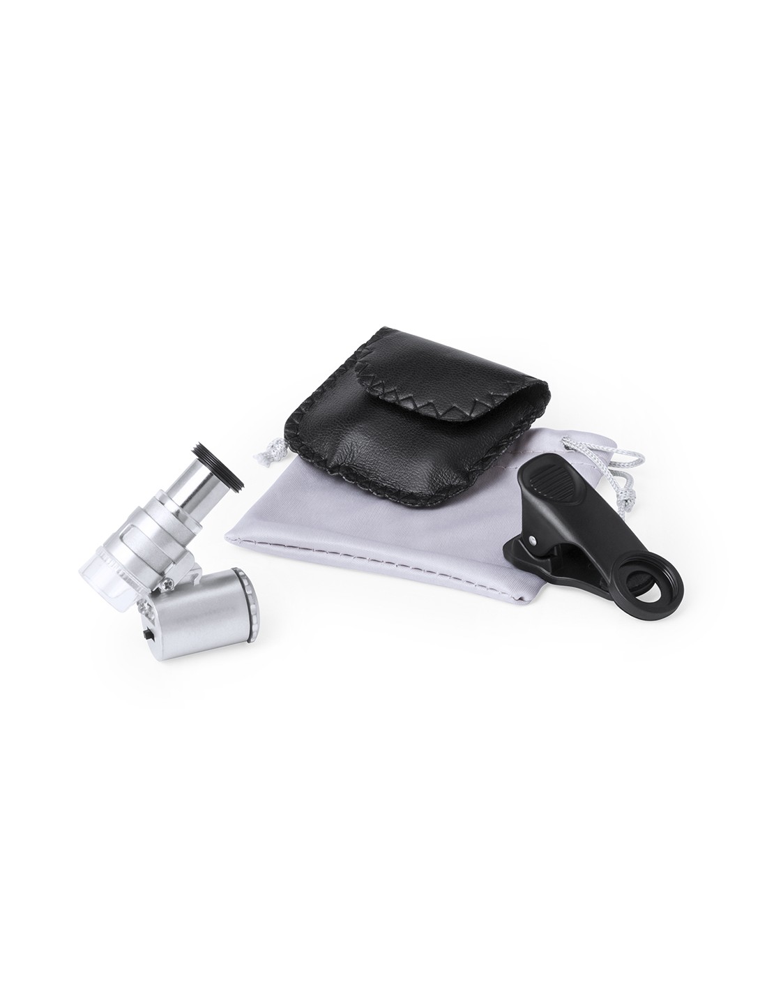 Microscopio para smartphone ajustable a la cámara mediante pinza. Con lentes de aumento de cristal de hasta 60x, 2 ledes y luz ultravioleta para una experiencia de aumento completa. Pilas de botón incluidas. Presentado en una elegante funda de polipiel y en bolsita de tela, todo ello dentro de una atractiva caja de presentación de diseño.