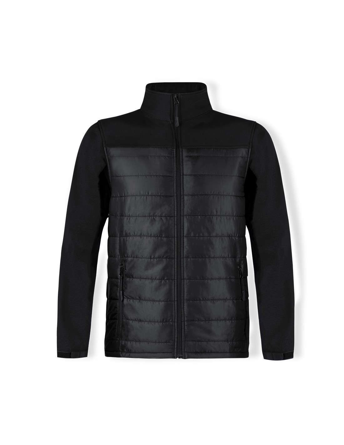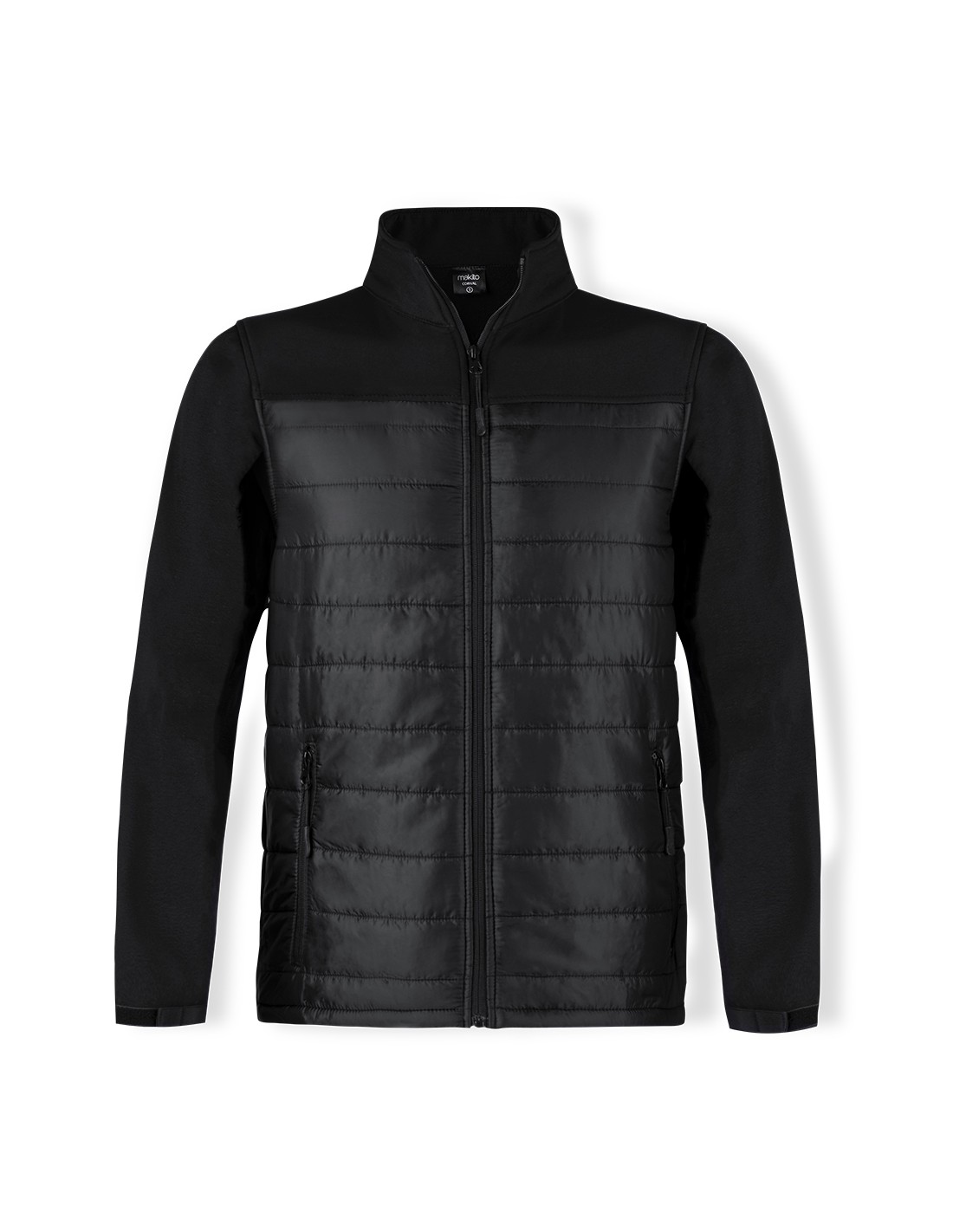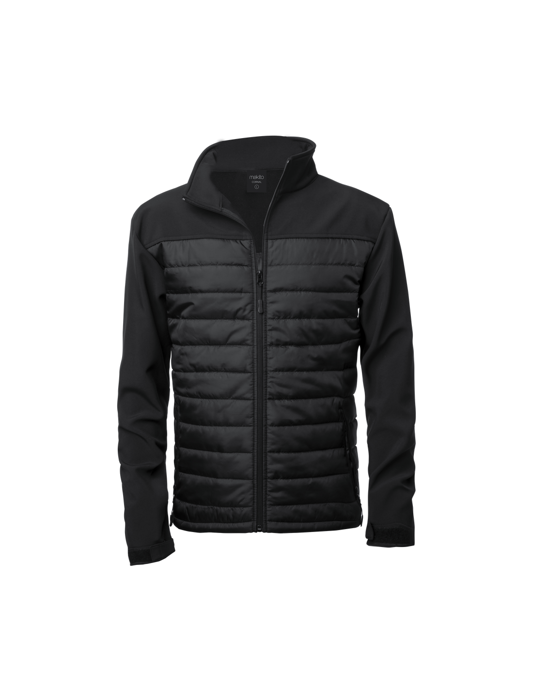 Chaqueta impermeable y transpirable en combinación de materiales soft shell y poliéster. De elegante construcción en color negro, con cierre de cremallera y bolsillos laterales de cremallera con tiradores para fácil apertura. Puños ajustables y disponible en tallas S, M, L, XL, XXL.