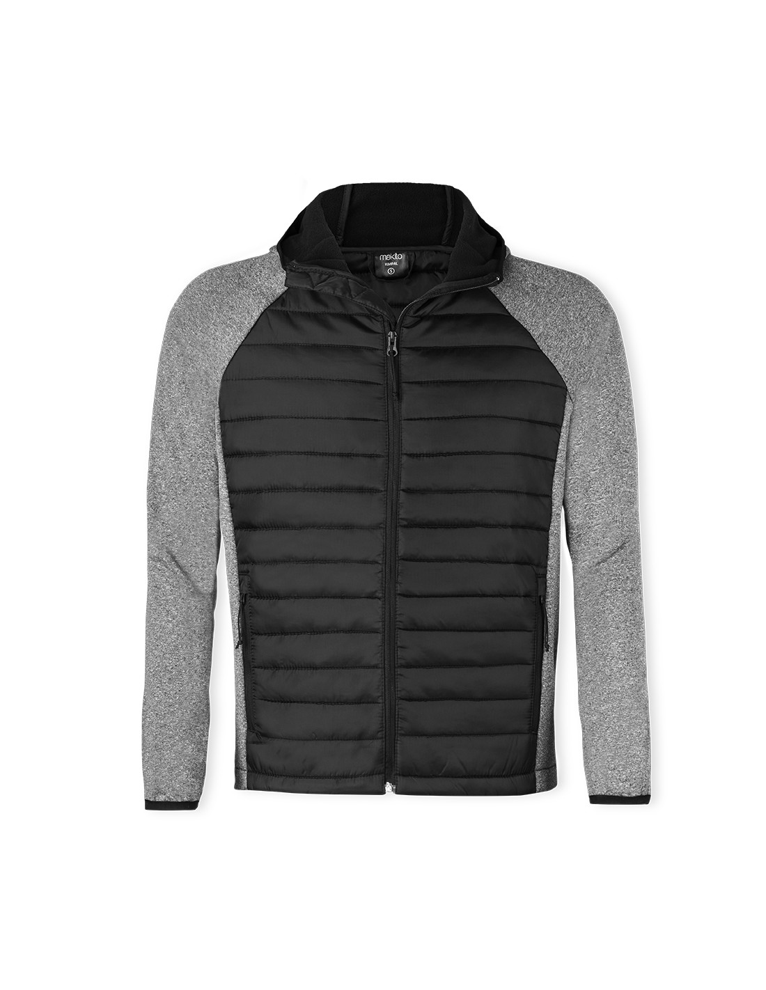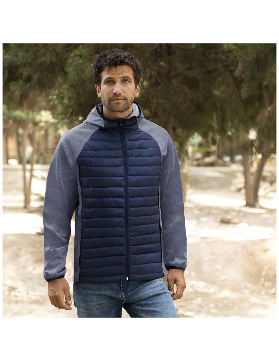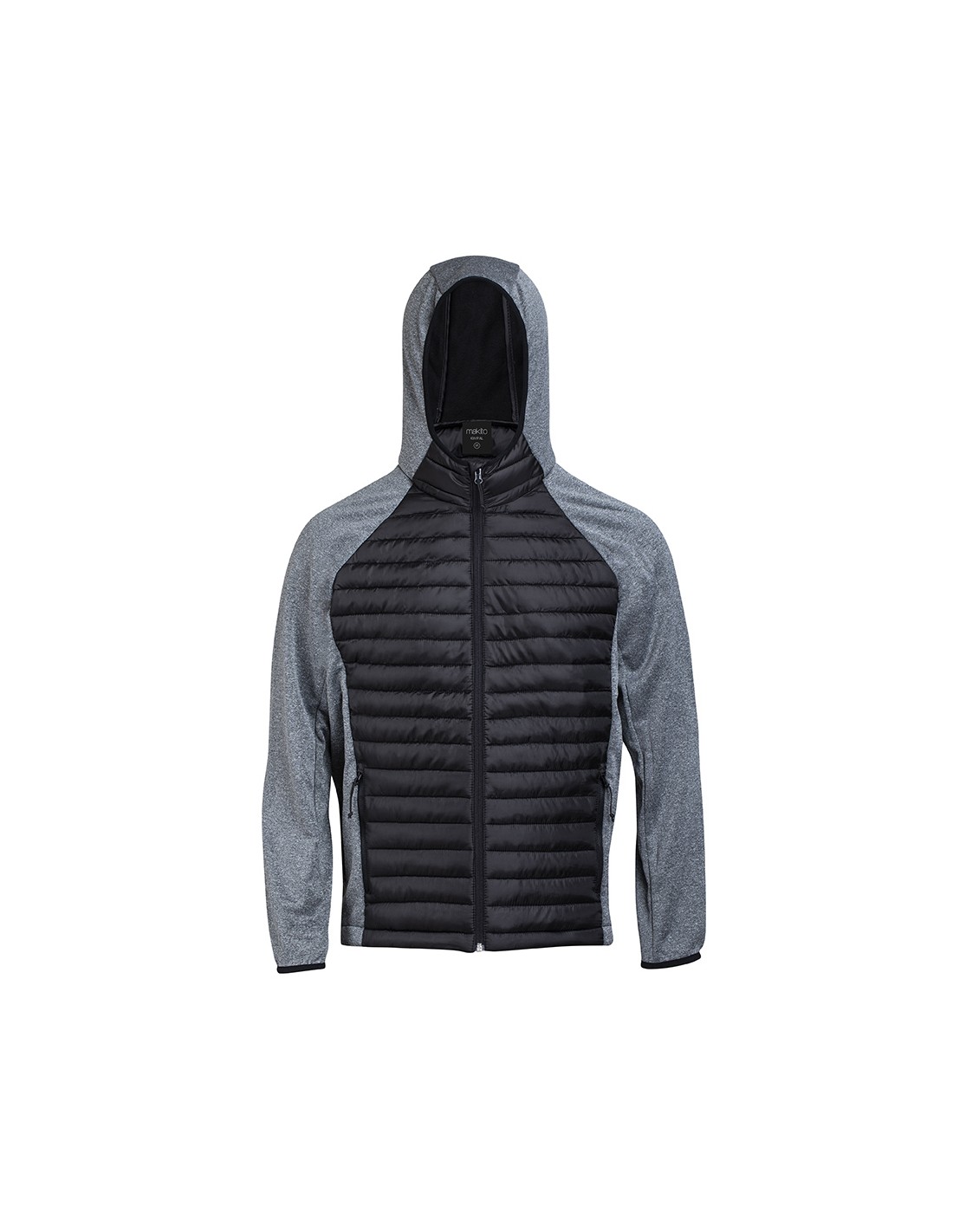Chaqueta unisex transpirable en combinación de materiales soft shell y poliéster, con tejido acolchado tacto pluma en frontal y espalda. Capucha y manga estilo ranglán con ribete elástico en cuello, puños y bajo . De elegante construcción en combinación de colores negro y gris, resistente al viento y al agua. Cierre de cremallera y bolsillos laterales de cremallera con tiradores para fácil apertura. Disponible en tallas S, M, L, XL, XXL.