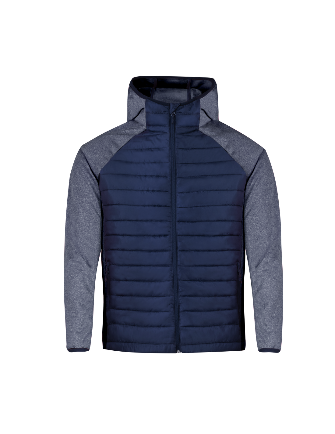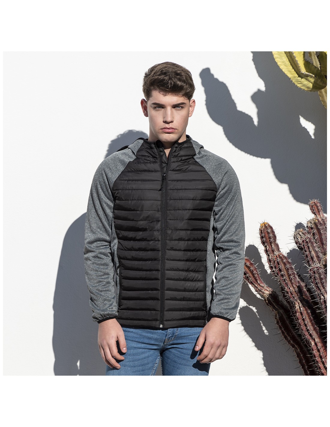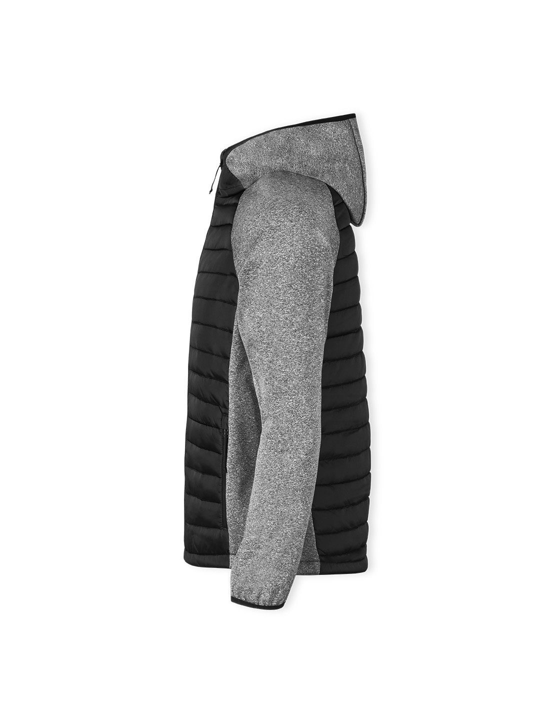 Chaqueta unisex transpirable en combinación de materiales soft shell y poliéster, con tejido acolchado tacto pluma en frontal y espalda. Capucha y manga estilo ranglán con ribete elástico en cuello, puños y bajo . De elegante construcción en combinación de colores negro y gris, resistente al viento y al agua. Cierre de cremallera y bolsillos laterales de cremallera con tiradores para fácil apertura. Disponible en tallas S, M, L, XL, XXL.