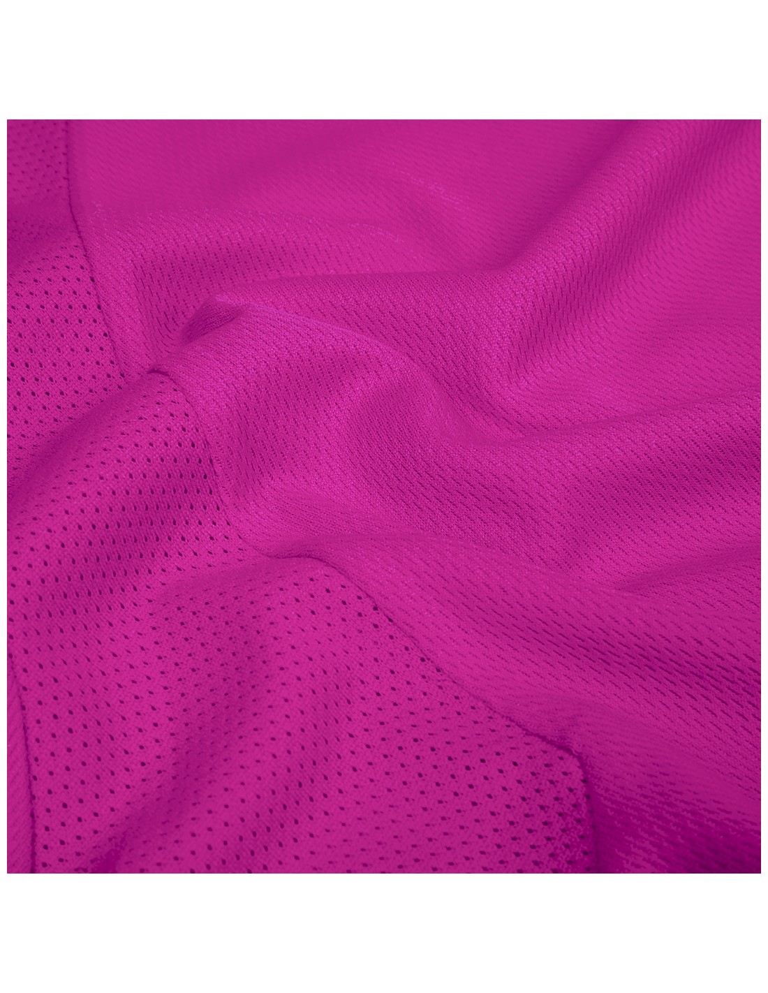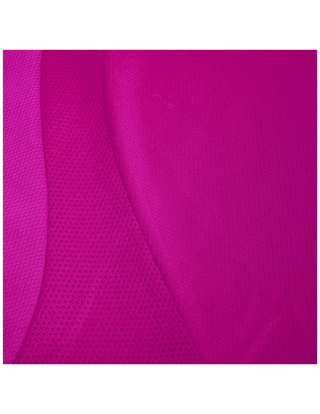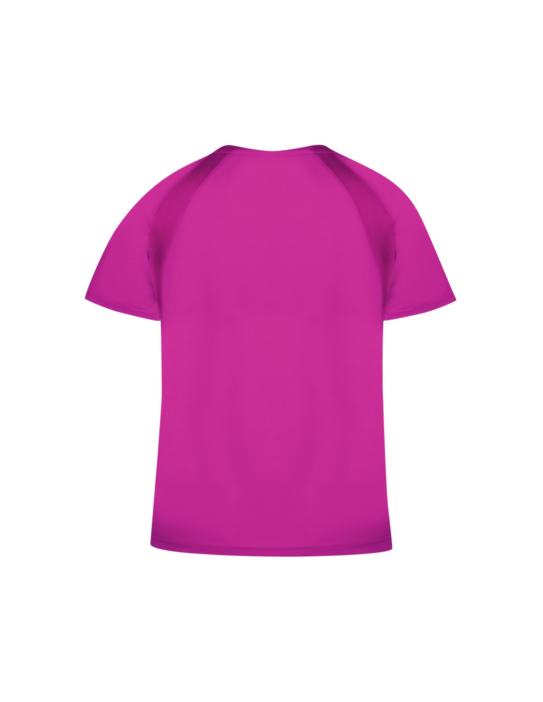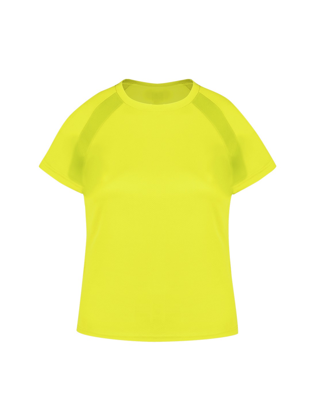 Camiseta técnica para mujer en material 100% poliéster transpirable de 135g/m2. Con manga ranglán, cuello redondo y con bandas frontales y laterales en tejido transpirable microperforado. Disponible en tallas S, M, L, XL.