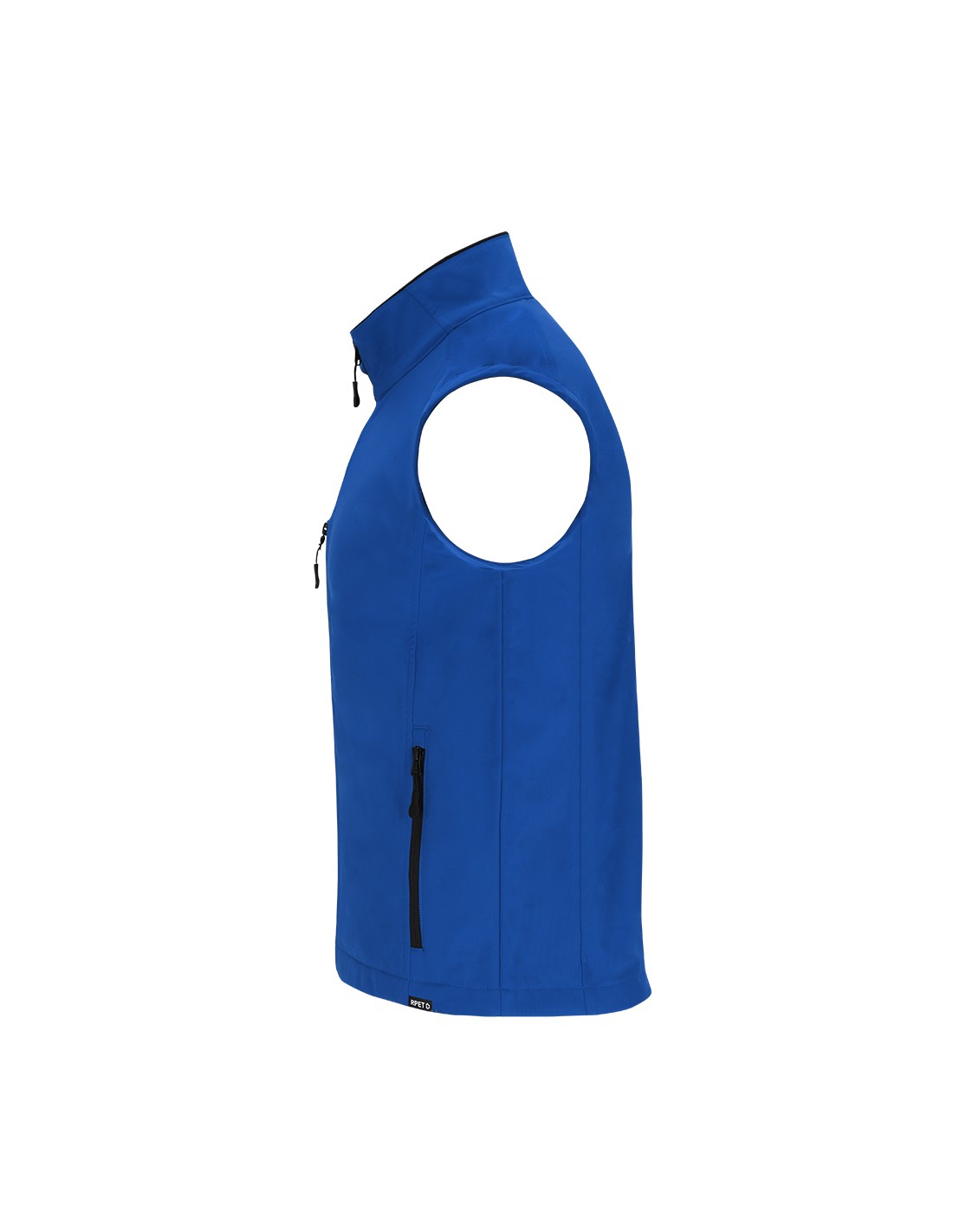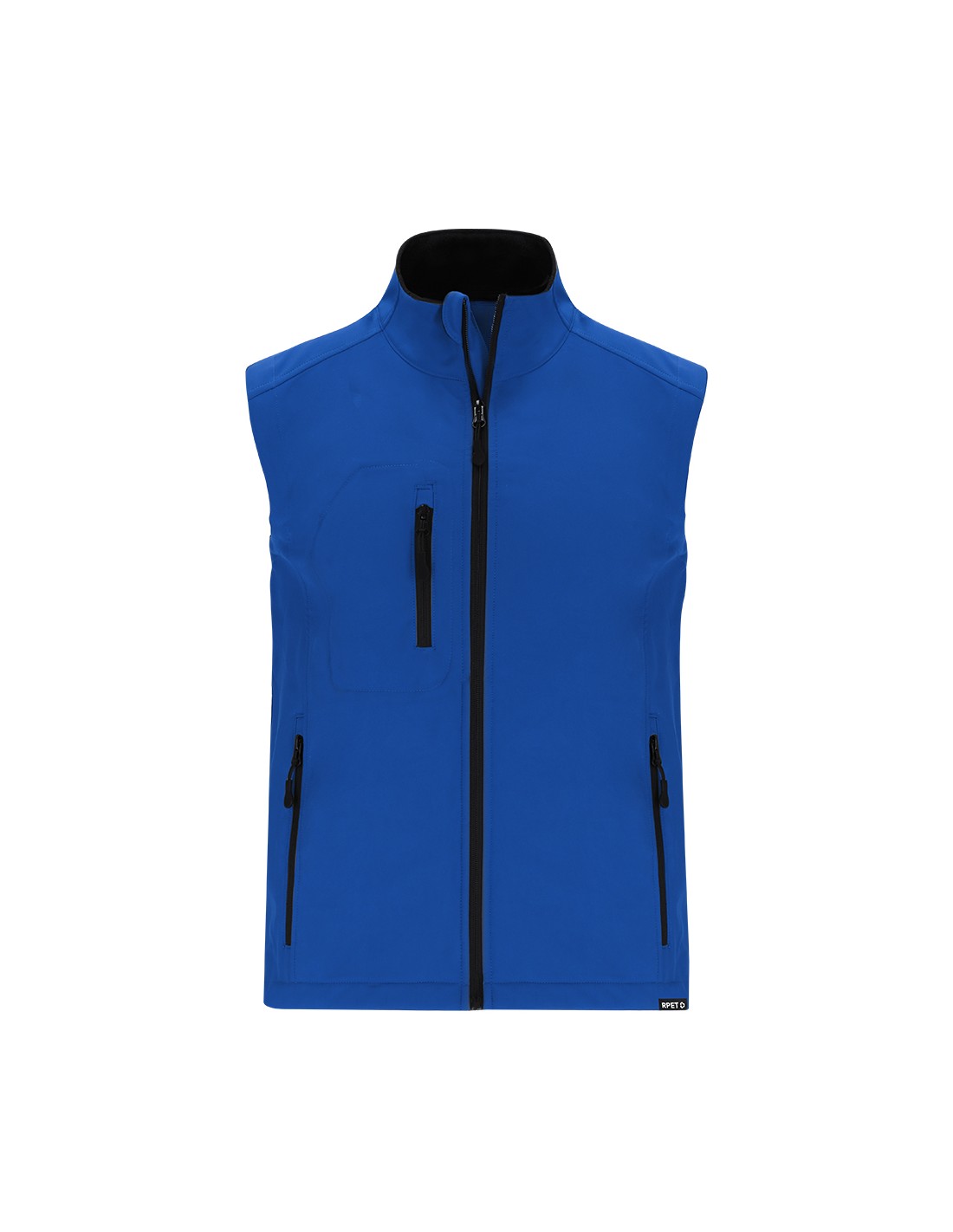 Chaleco Soft Shell RPET confeccionado en 3 capas, de 340 g/m2. Con membrana de 8000mm, impermeable y transpirable. Exterior en Soft Shell e interior en tejido polar microfleece en color negro. Con bolsillo exterior en pecho derecho y dos bolsillos laterales con cremalleras. Con cremallera central y cremalleras invertidas en bolsillos, incluyendo tiradores de cordón en color negro. Cuenta con protector de barbilla a juego y cintura ajustable, con cordón elástico y tope. Distintivo RPET en el ribete de la prenda.