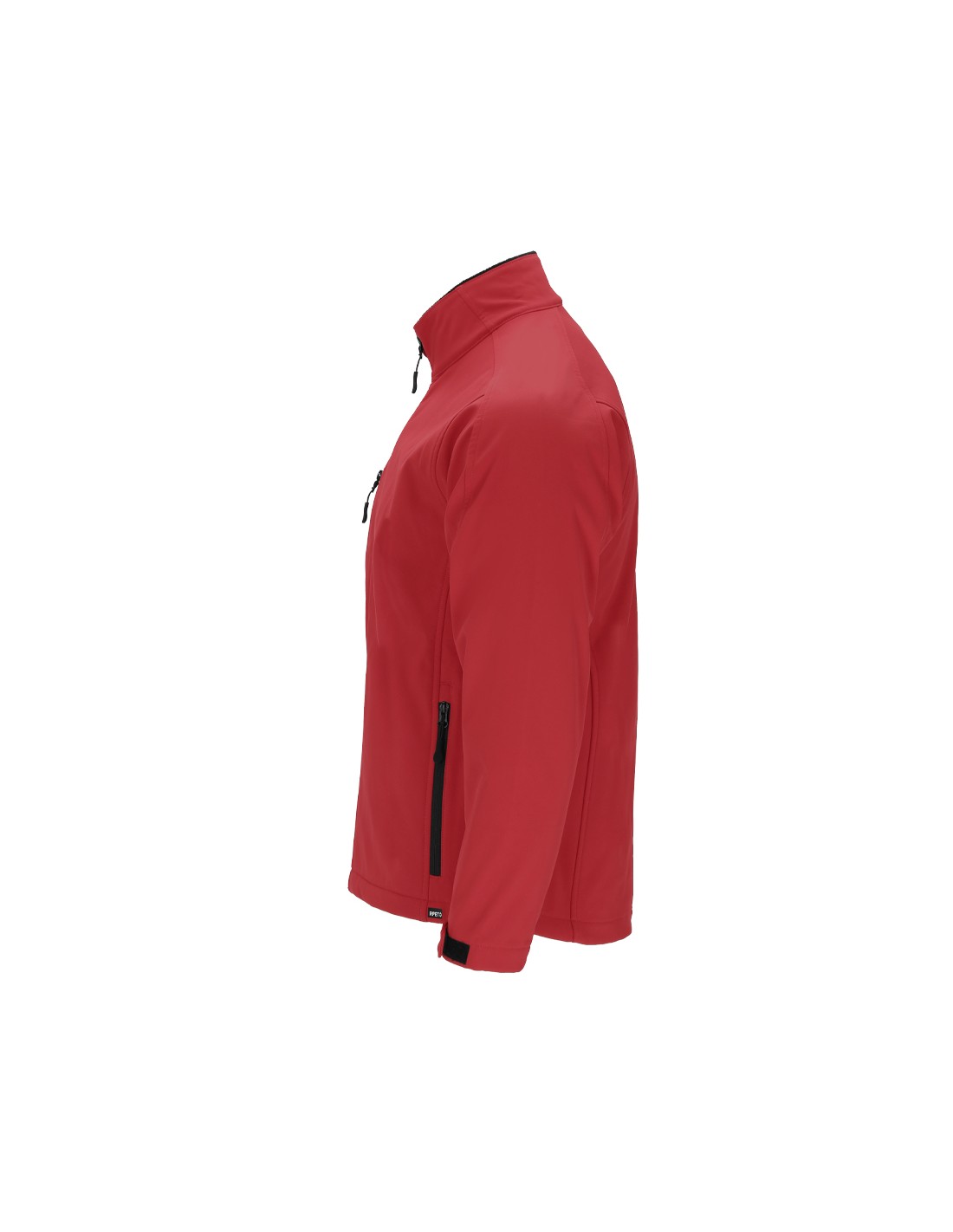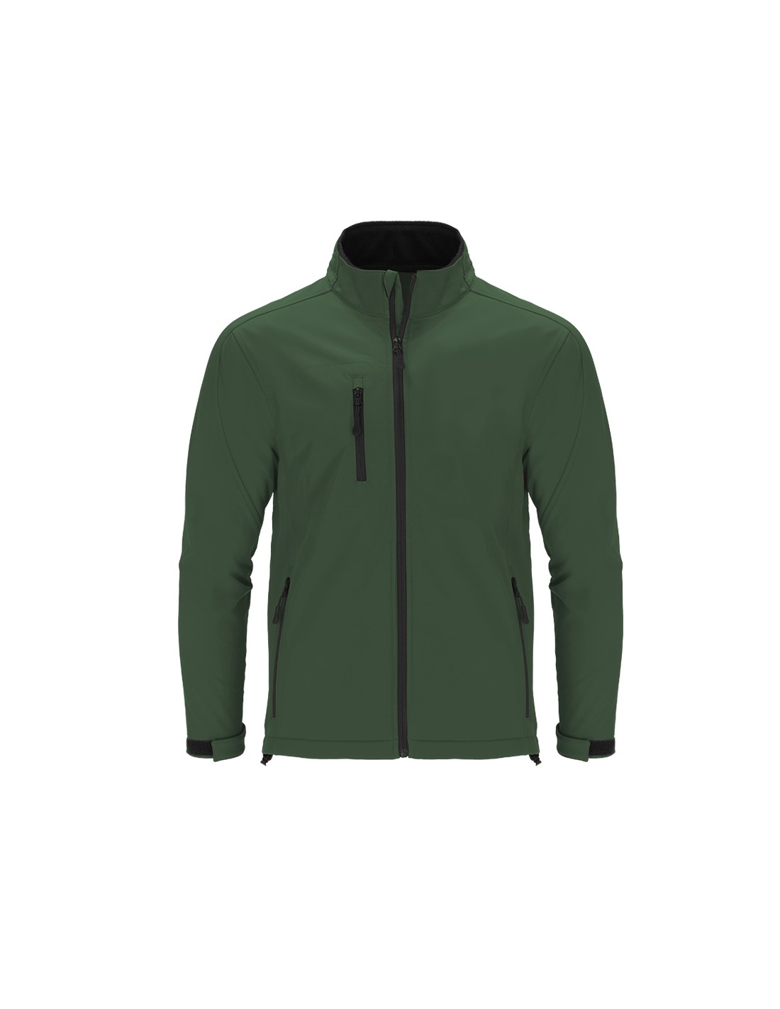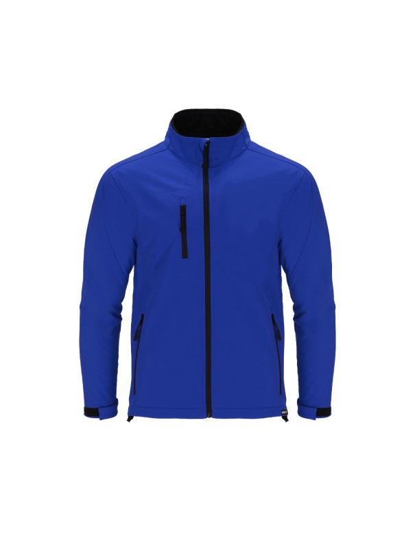 Chaqueta Soft Shell RPET confeccionada en 3 capas, de 340 g/m2. Con membrana de 8000mm, impermeable y transpirable. Exterior en Soft Shell e interior en tejido polar microfleece en color negro. Con bolsillo exterior en pecho derecho y dos bolsillos laterales con cremalleras. Con cremallera central y cremalleras invertidas en bolsillos, incluyendo tiradores de cordón en color negro. Mangas ranglán con sistema de ajuste de velcro en el puño en color negro. Cuenta con protector de barbilla a juego y cintura ajustable, con cordón elástico y tope. Distintivo RPET en el ribete de la prenda.