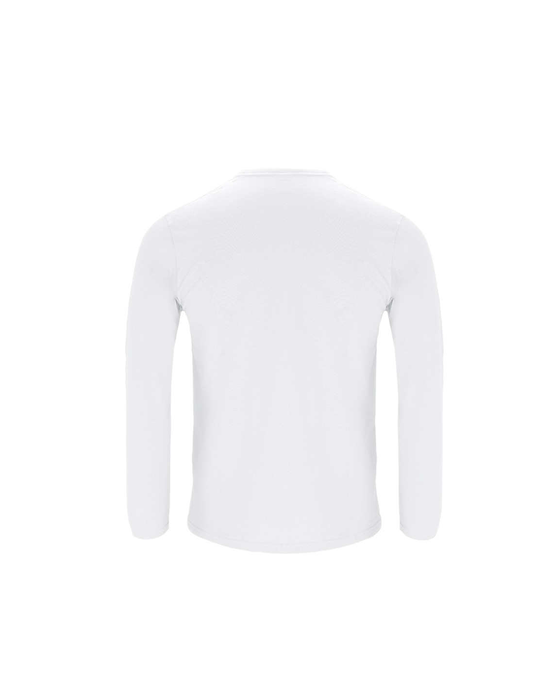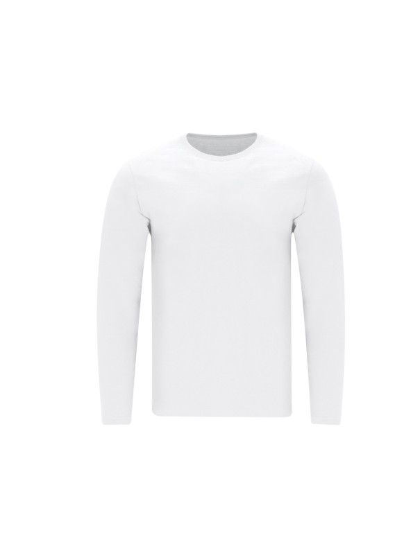 Camiseta de manga larga para adulto en color blanco de suave y agradable tacto en 100% algodón, punto liso de 160 g/m2. Confeccionada en tejido tubular, con cuello redondo acanalado 1x1 y con cubrecosturas reforzado a juego en color blanco.