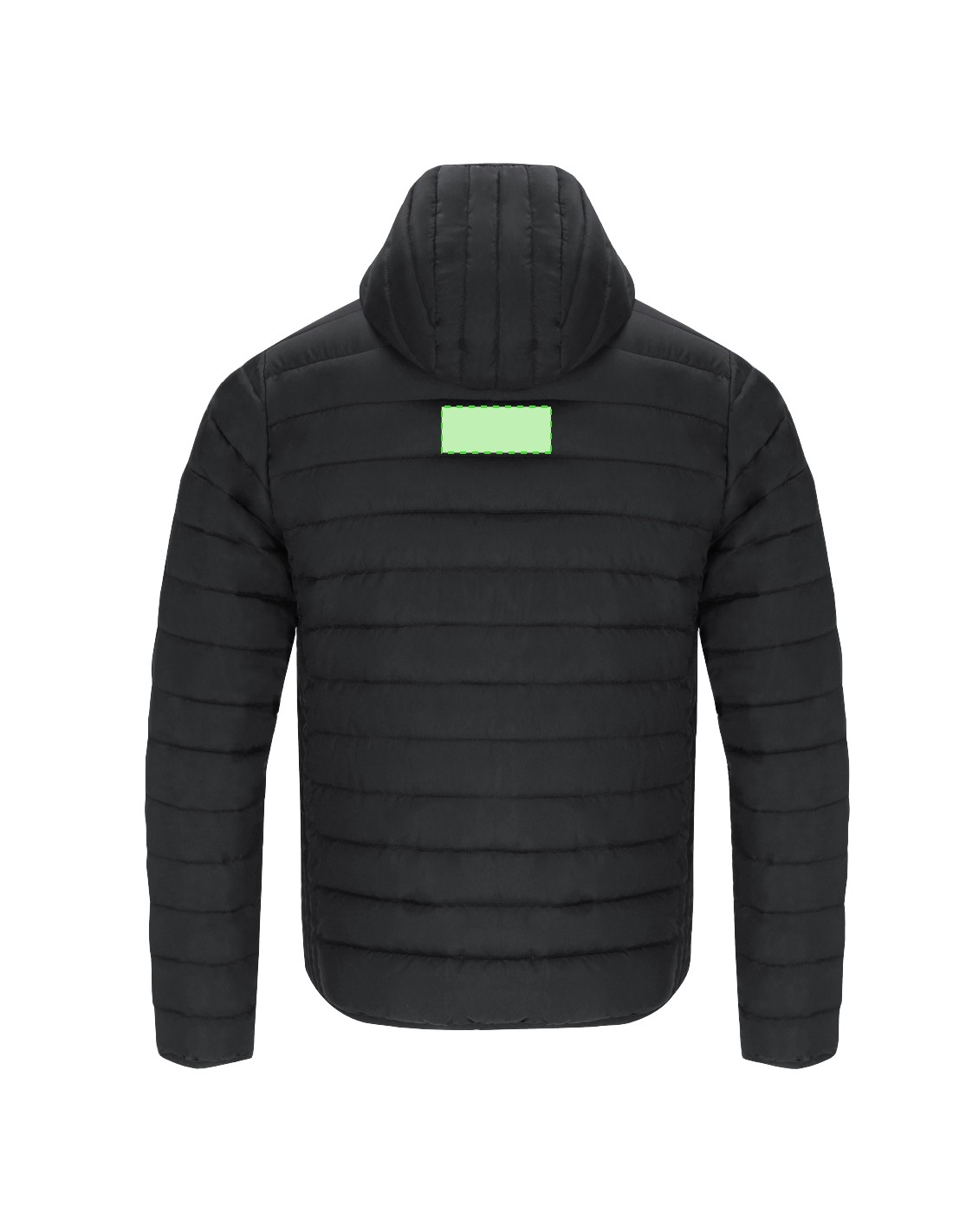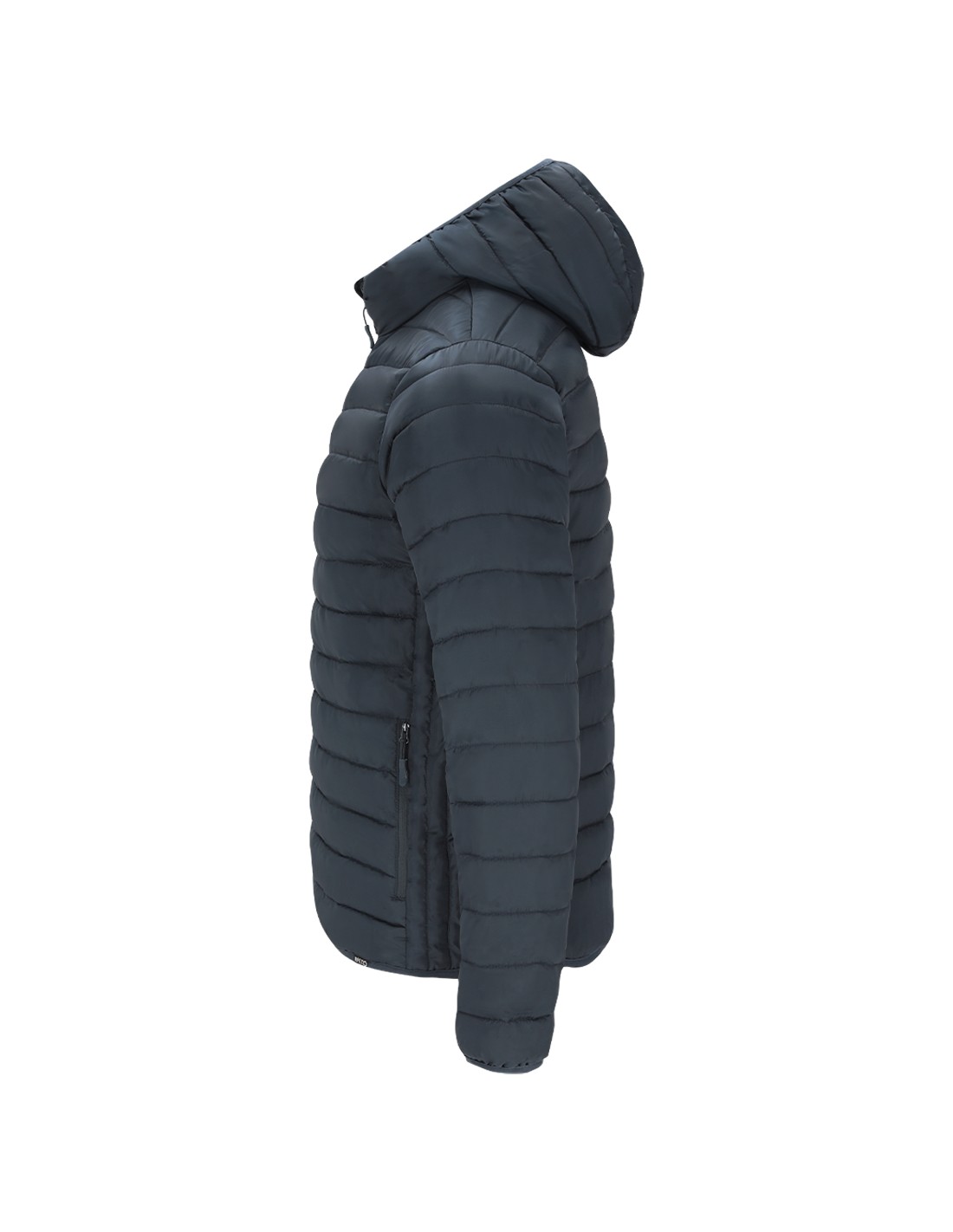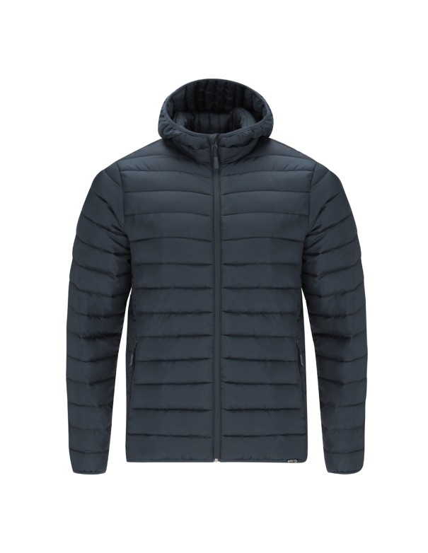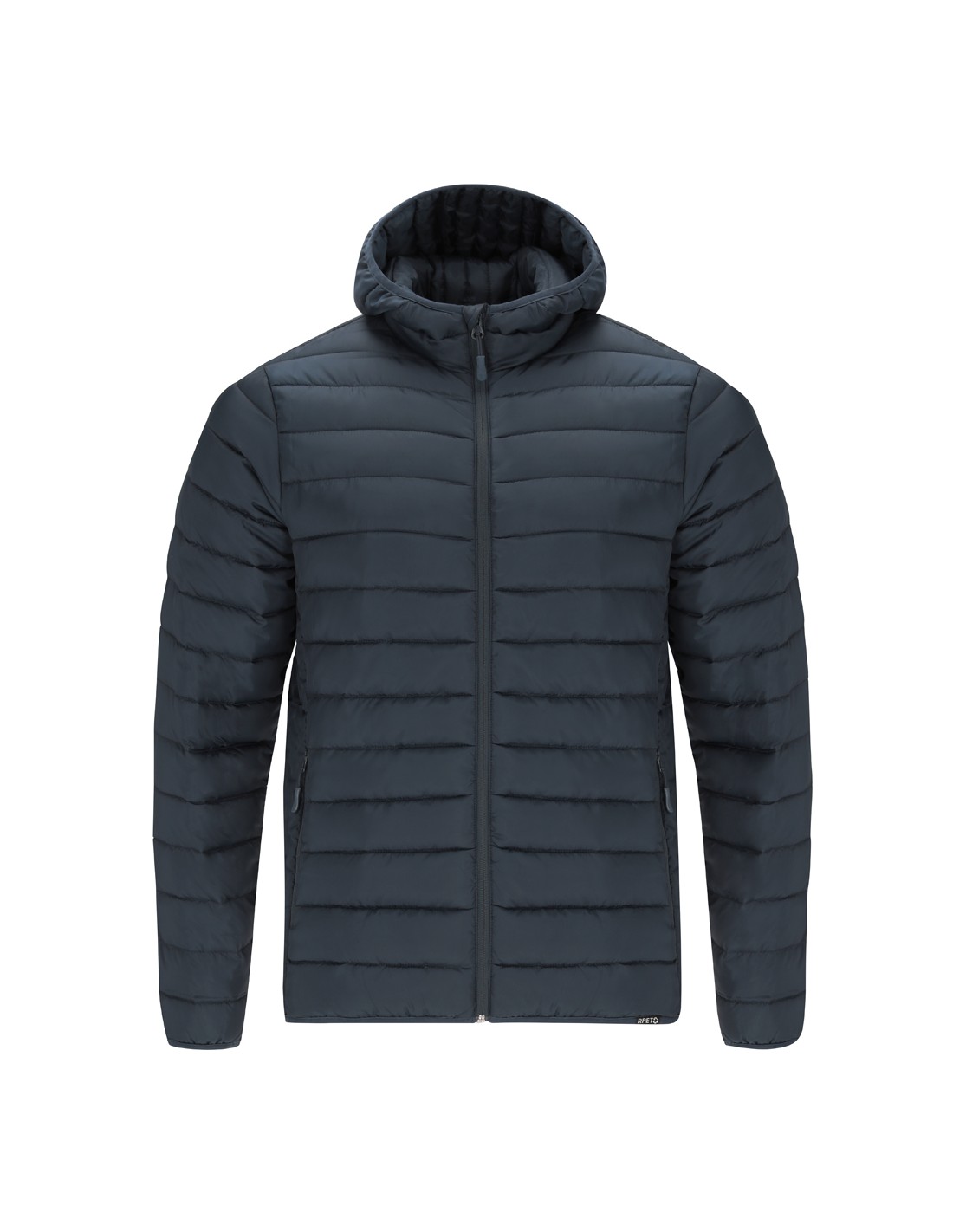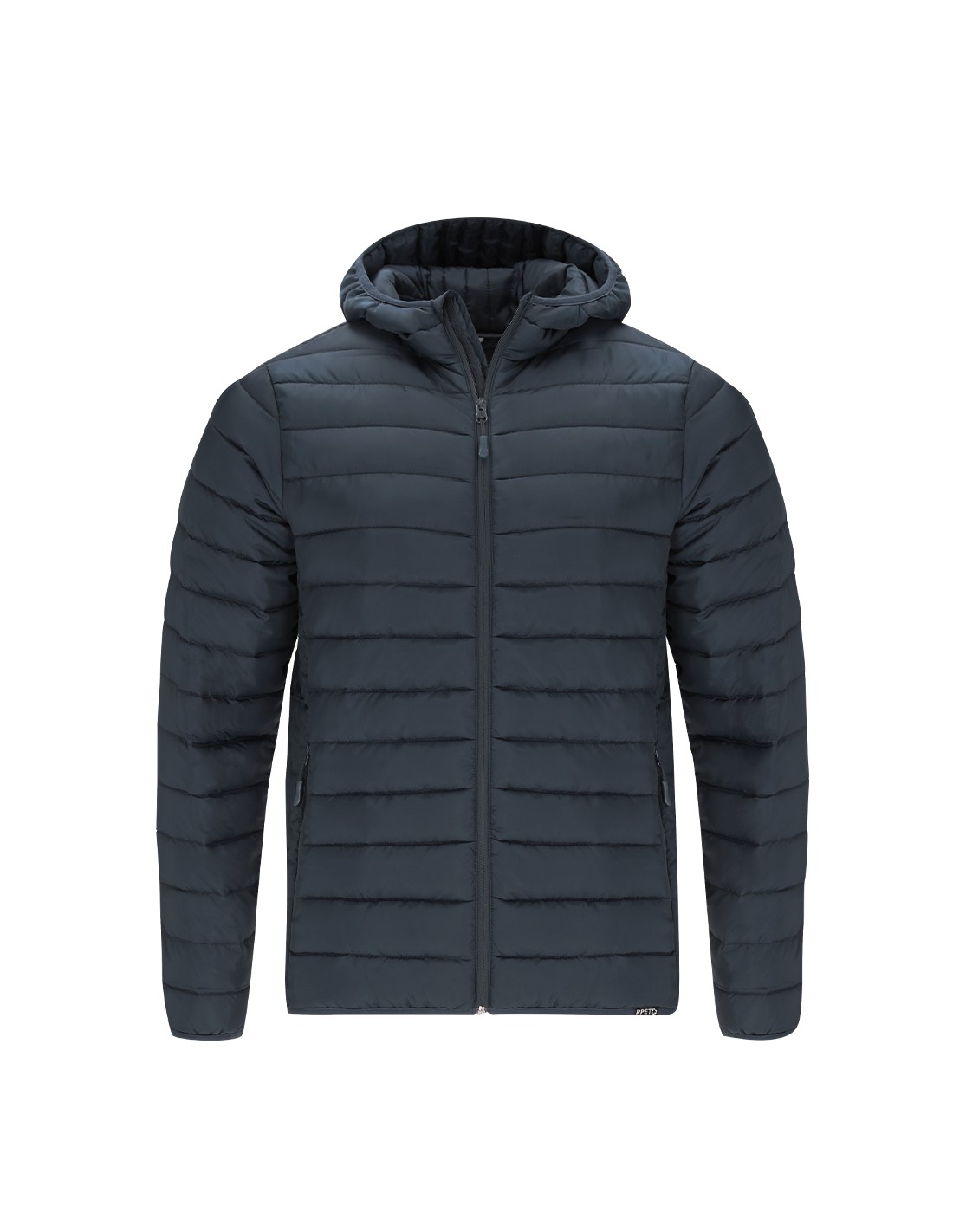 Chaqueta Unisex de RPET con capucha. En material extra ligero con acolchado efecto pluma y suave forro interior, resistente al agua y cortavientos. Puños, cintura y capucha con ribetes elásticos a tono. Apertura con cremallera invertida y tirador a juego, con protector de barbilla. Cuenta con 2 bolsillos exteriores laterales con cremalleras y tiradores a juego, y 2 bolsillos interiores. Etiqueta con distintivo RPET en el ribete de la prenda y práctica funda de transporte con cordón ajustable.