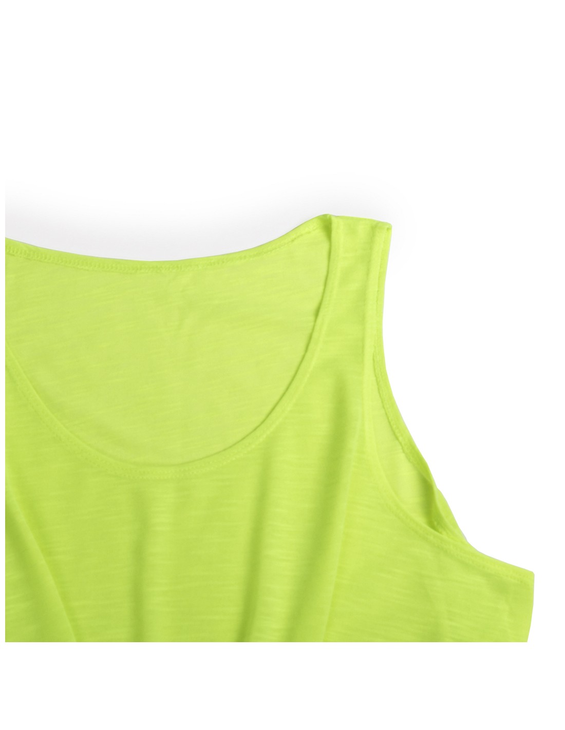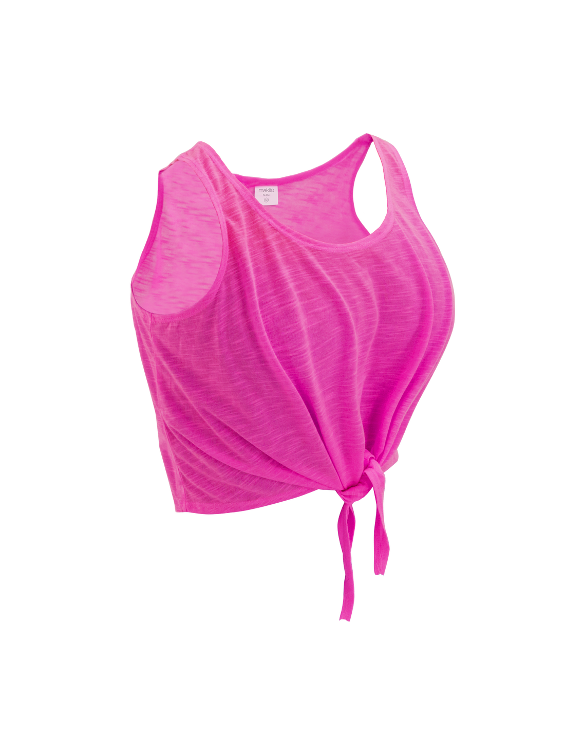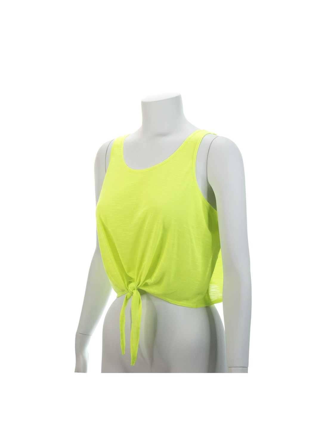 Camiseta para chica en suave poliéster de 130g/m2. Con diseño en tirantes y con cierre frontal de nudo. Disponible en blanco y variada gama de vivos colores fluorescentes. Tallas S, M, L.
