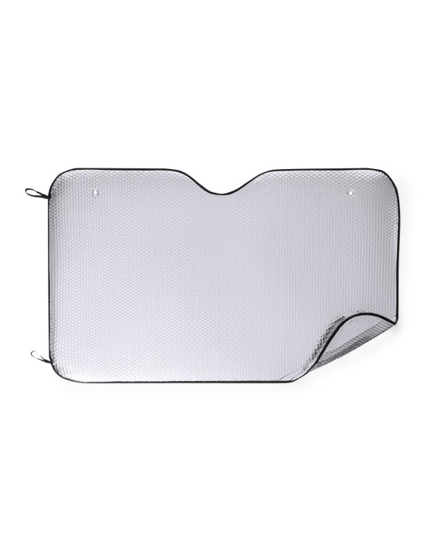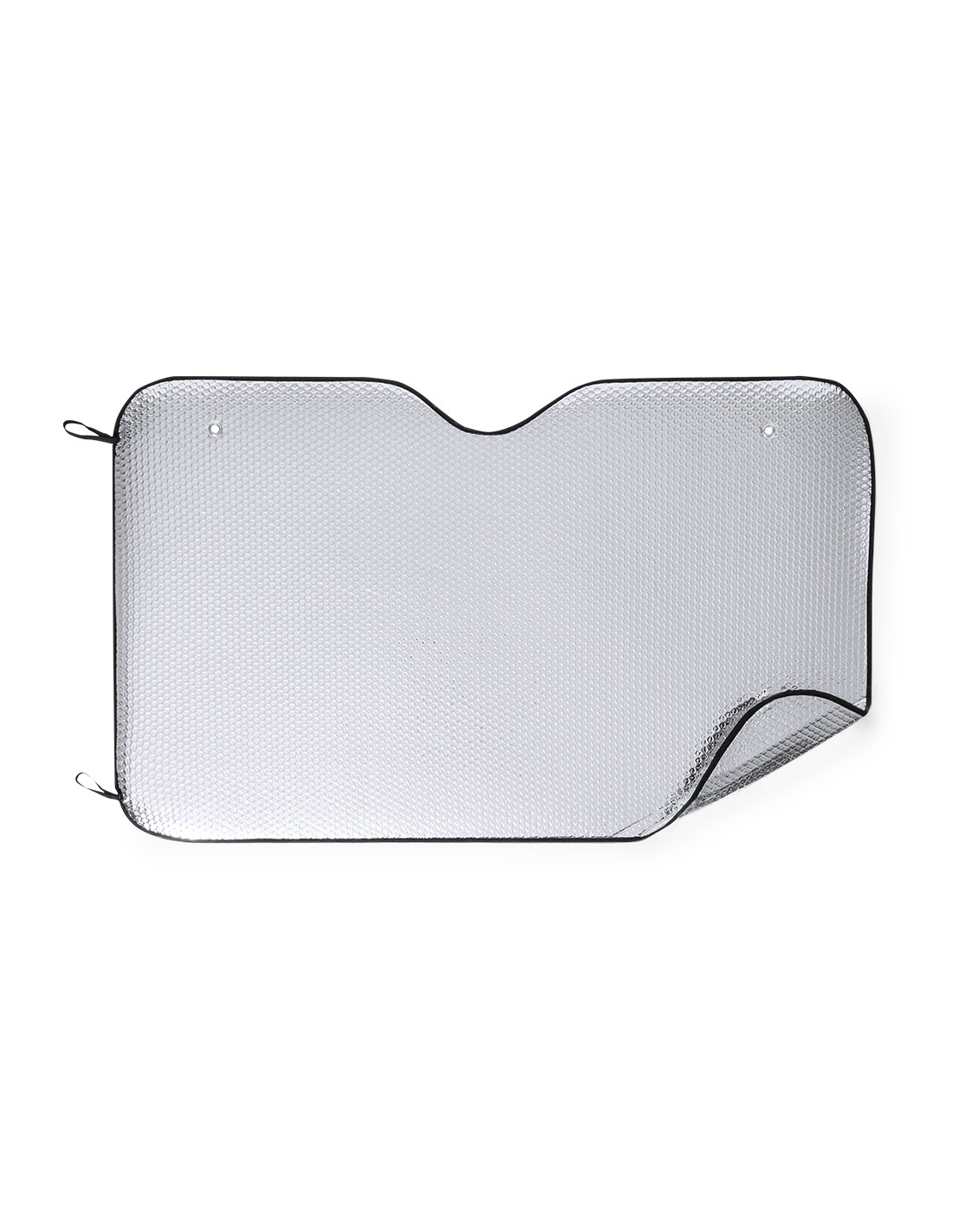 Parasol en aluminio con burbuja en ambas caras en color plateado de acabado metalizado con ribetes en color negro. De tamaño 130x80cm, con argollas metálicas de refuerzo, cintas elásticas para plegado, dos ventosas para ajuste en luna y presentación desplegado en plancha para fácil impresión.