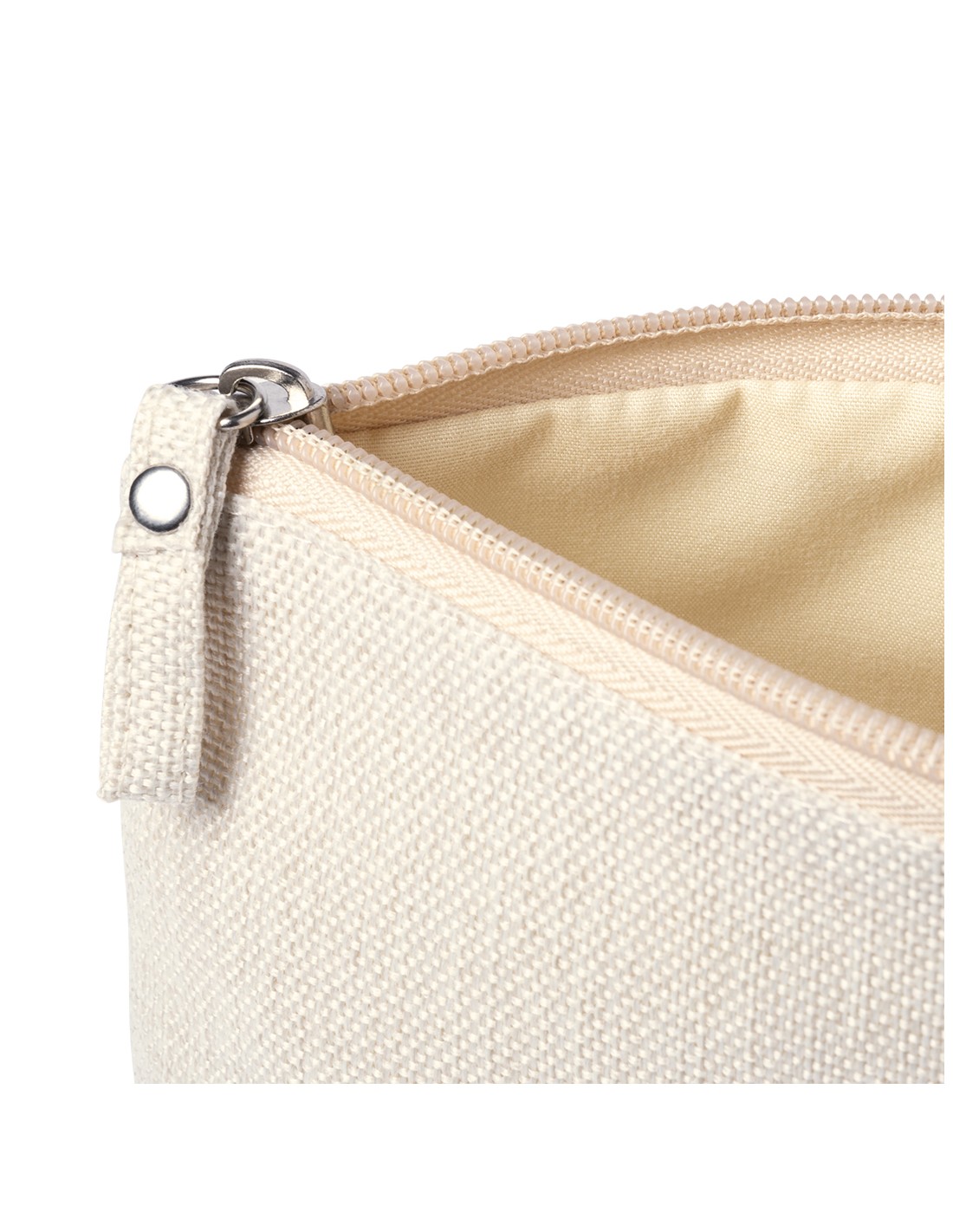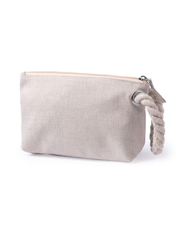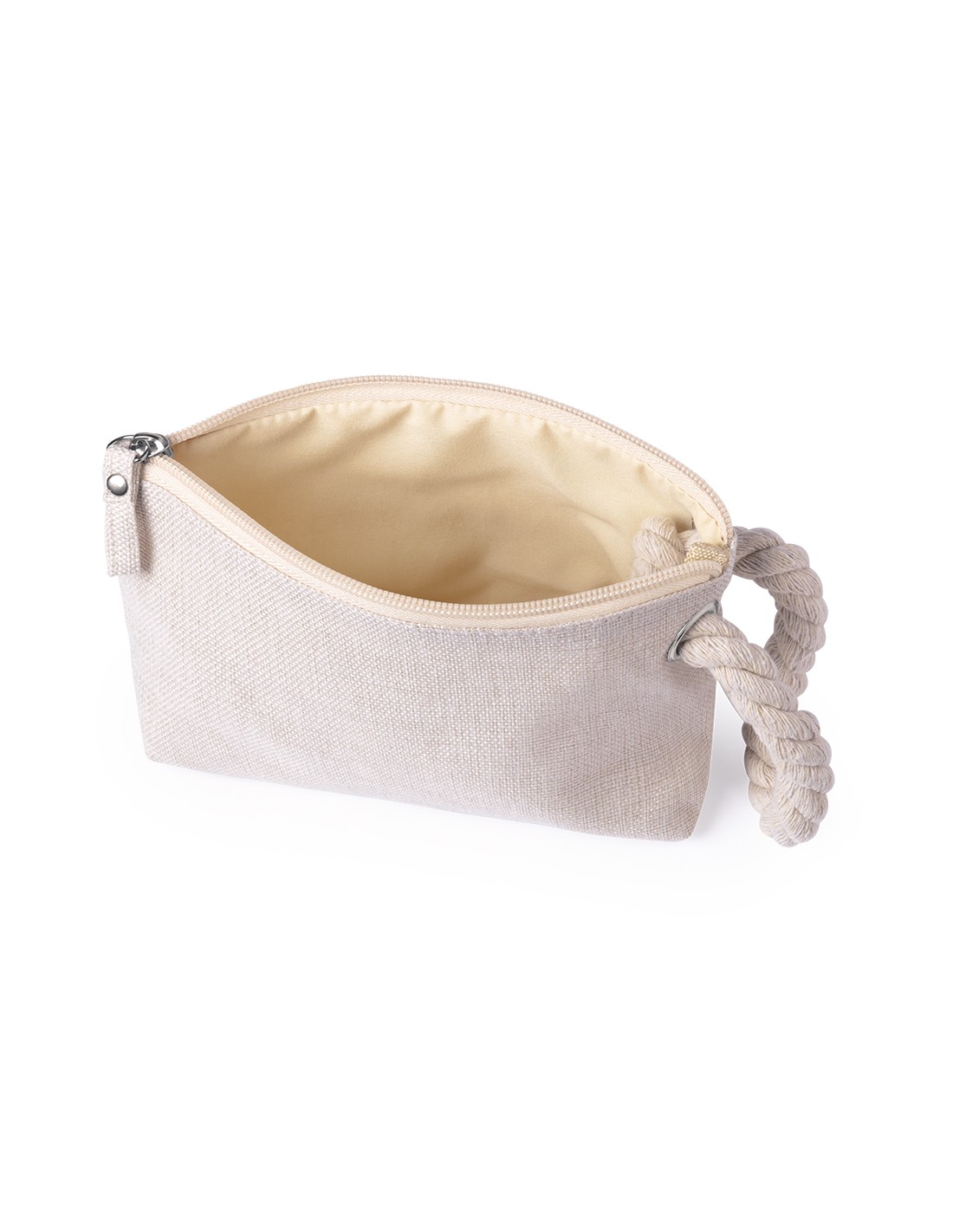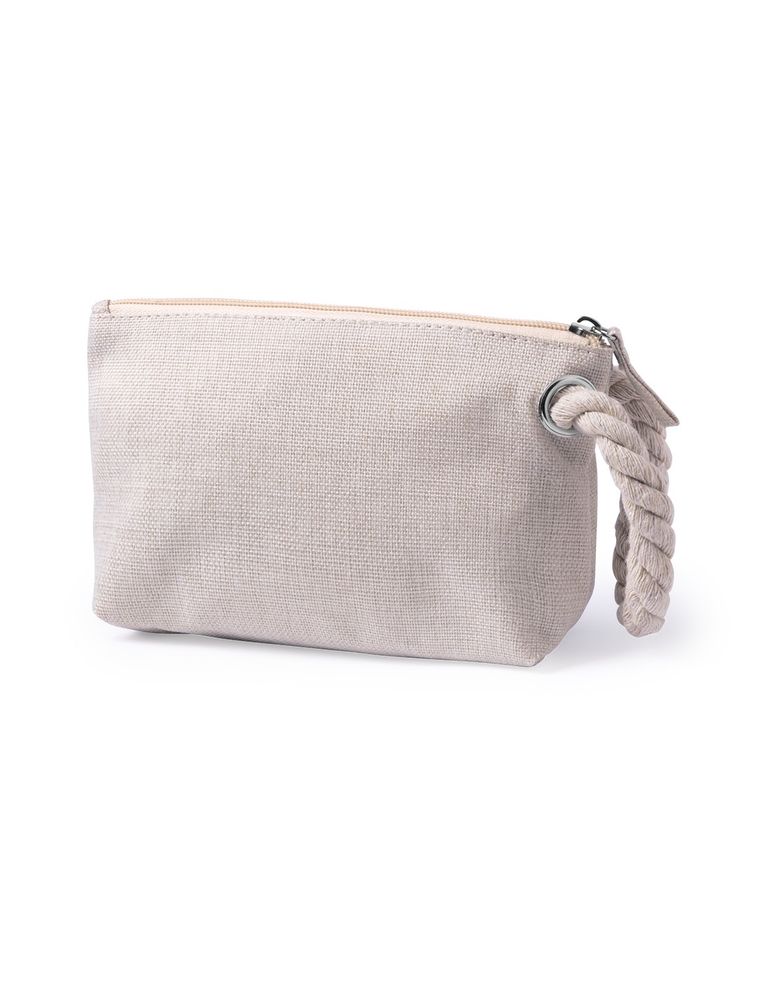 Portatodo multiusos en suave combinación de algodón y poliéster en tonos crudos naturales. Cremallera a juego, con práctica asa trenzada, argolla de refuerzo metálica y suave forro interior en color crudo.