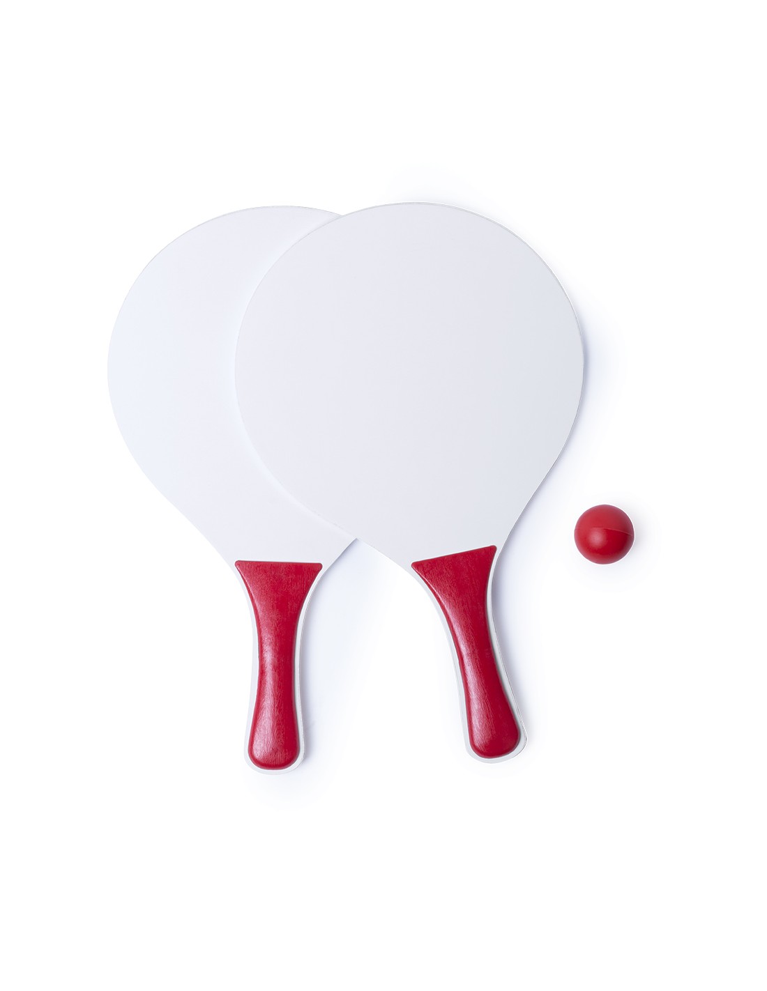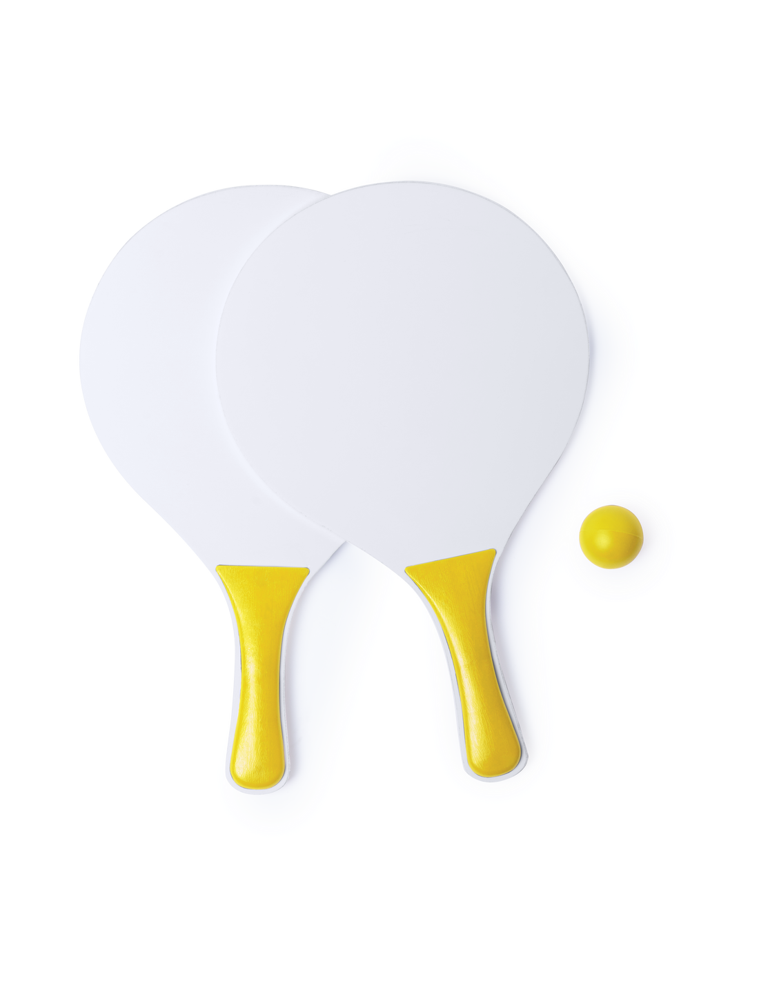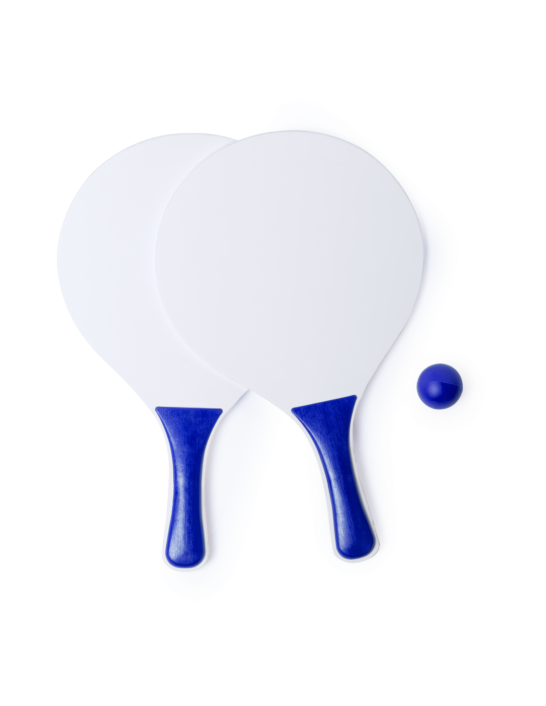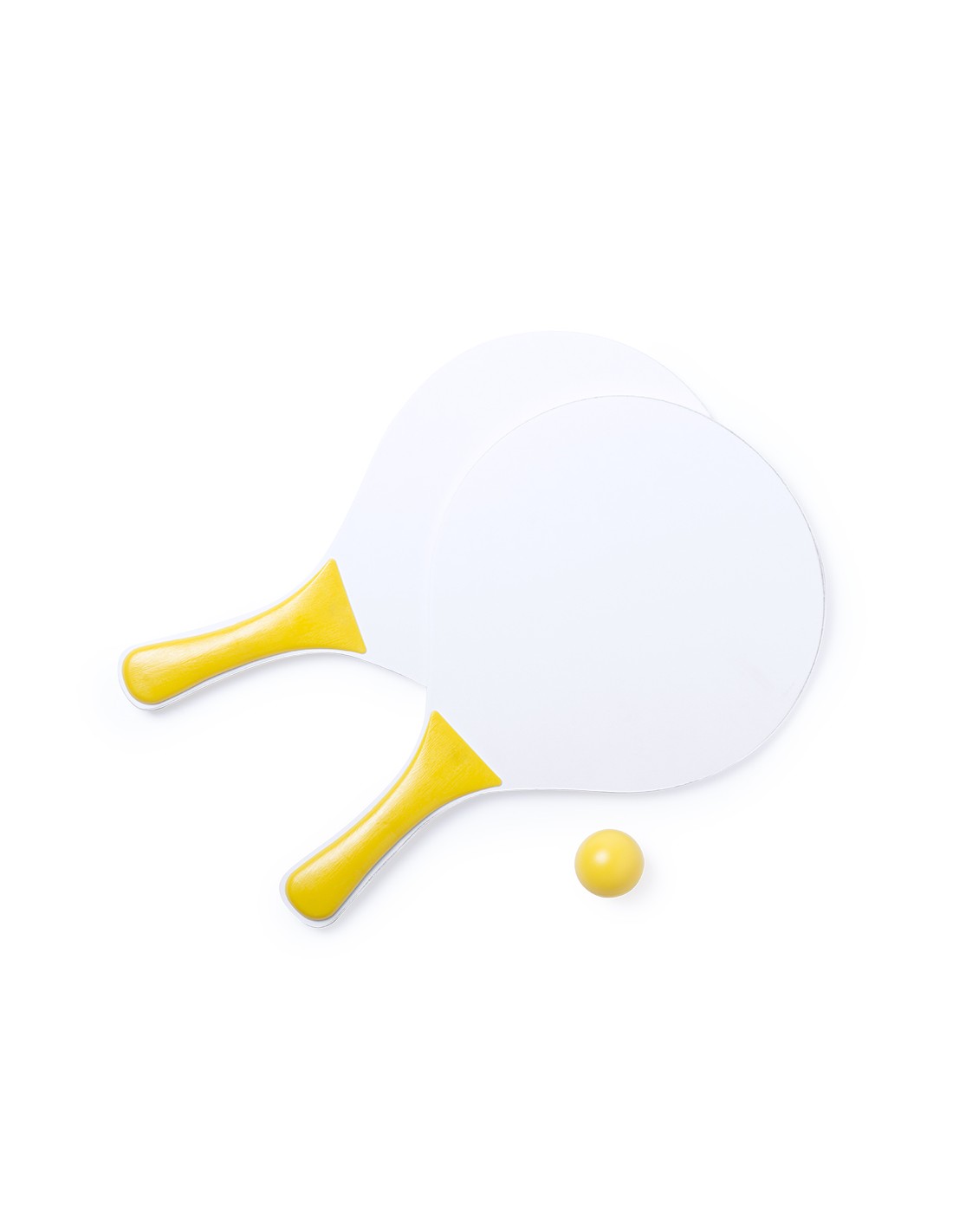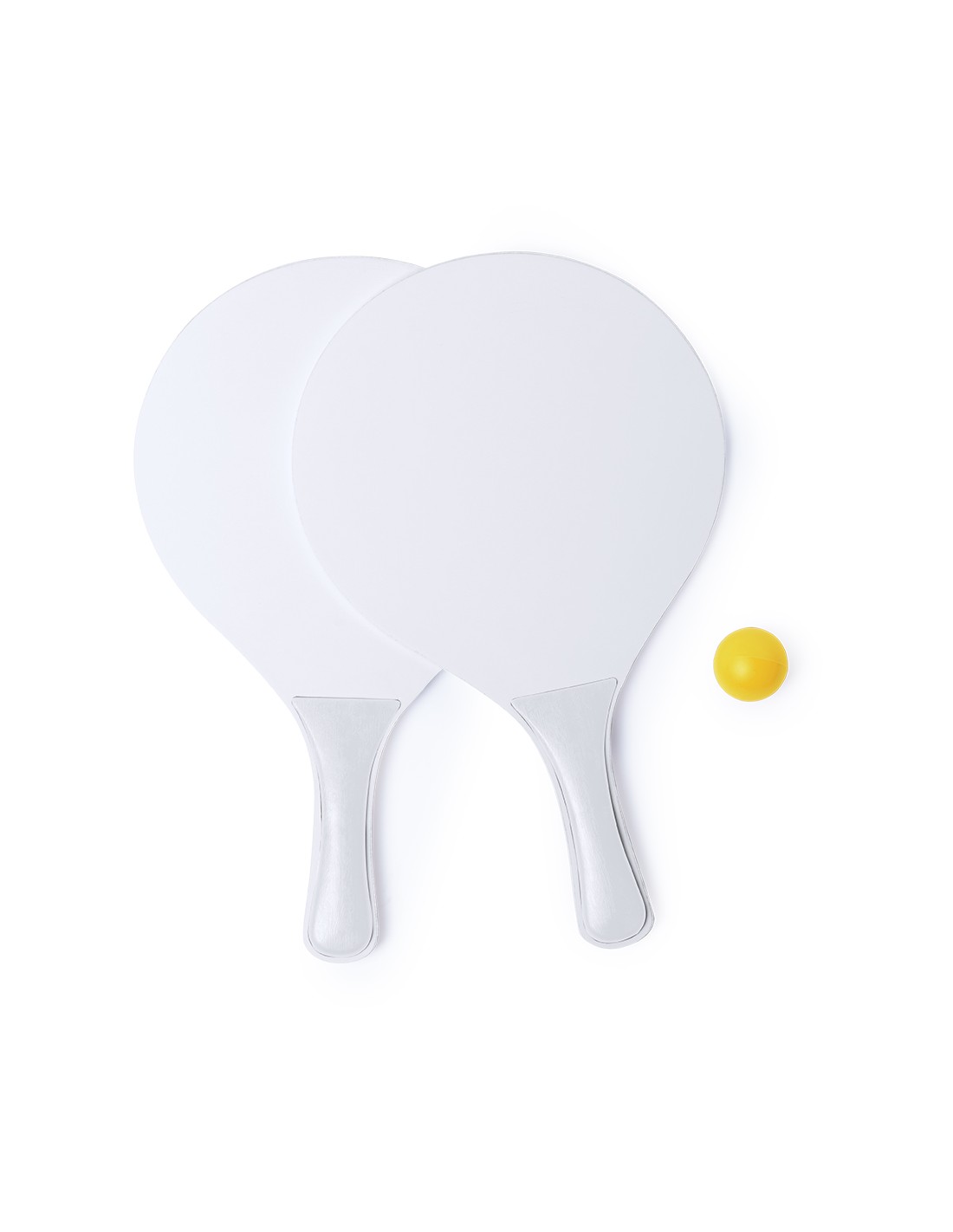 Par de palas de playa en madera natural blanca. Con mango reforzado en variada gama de vivos colores. Presentadas en bolsa redecilla con pelota a juego.