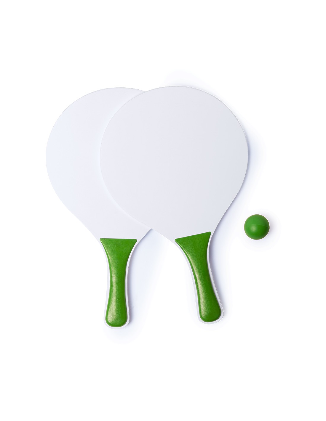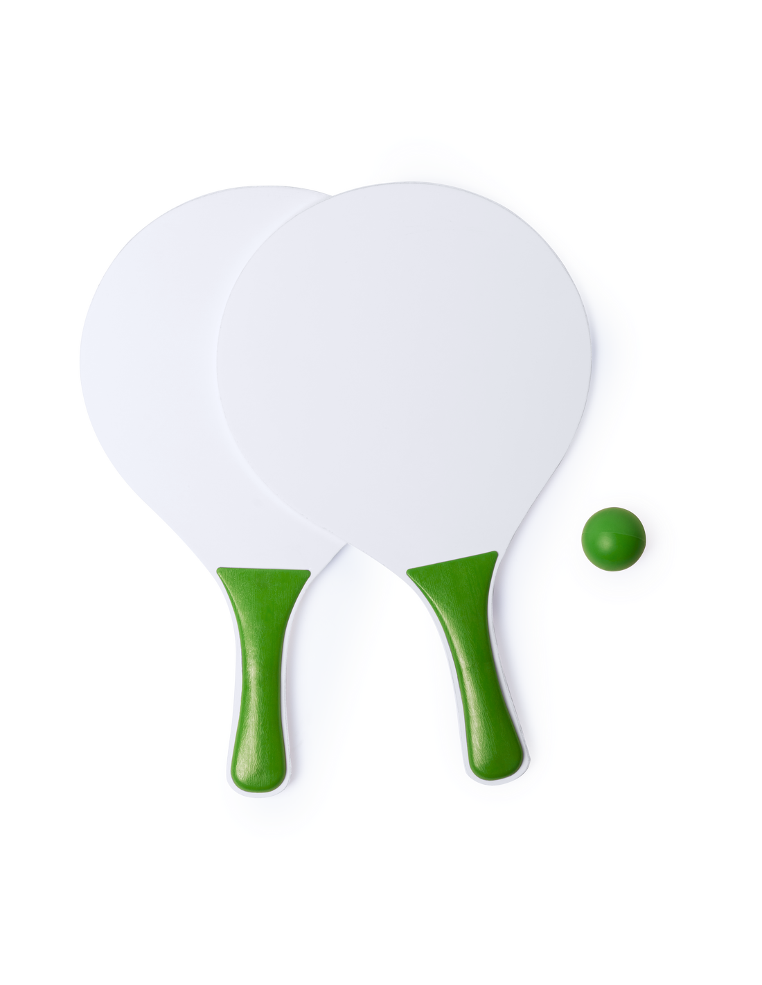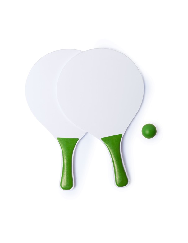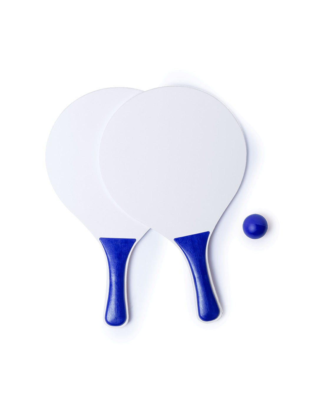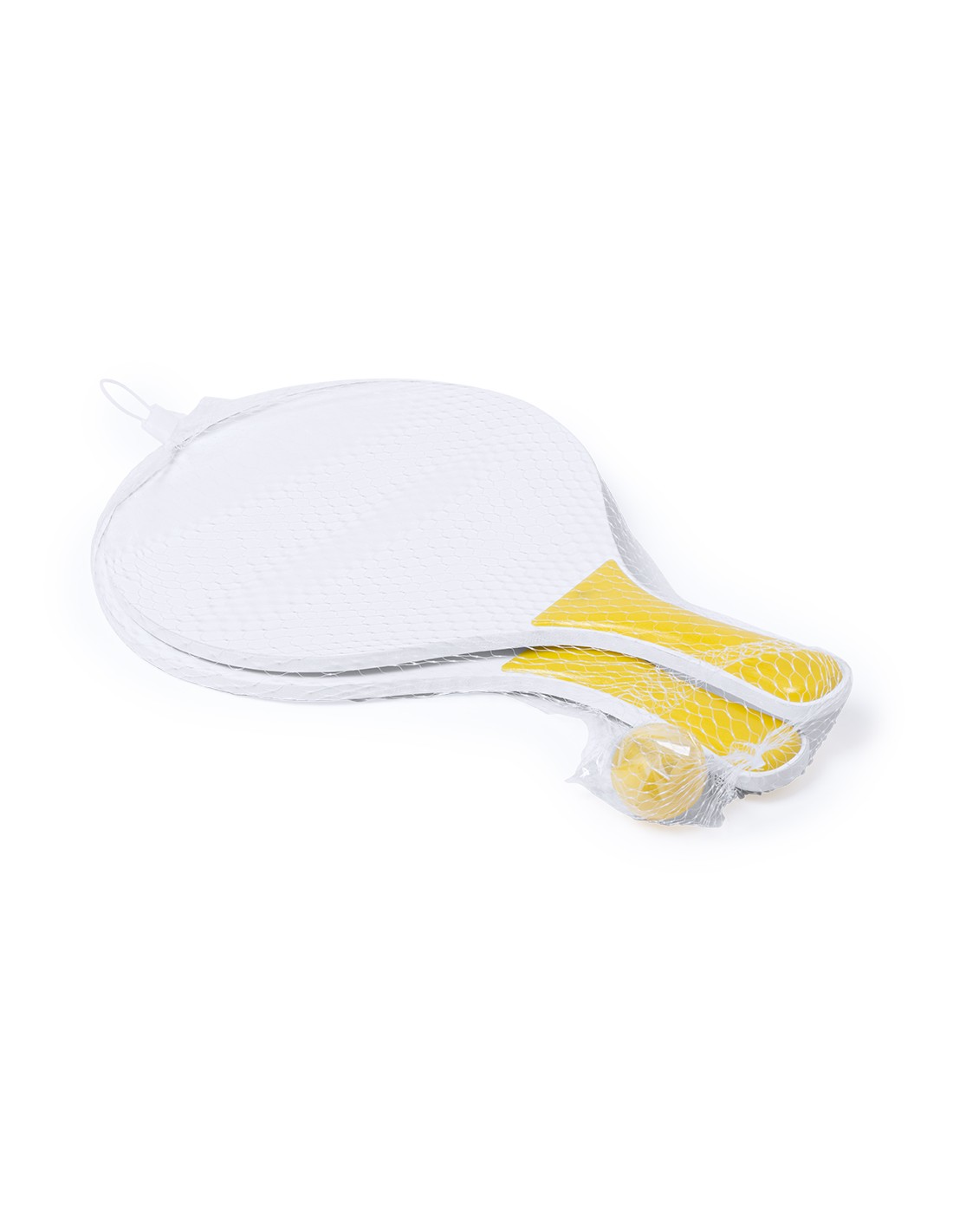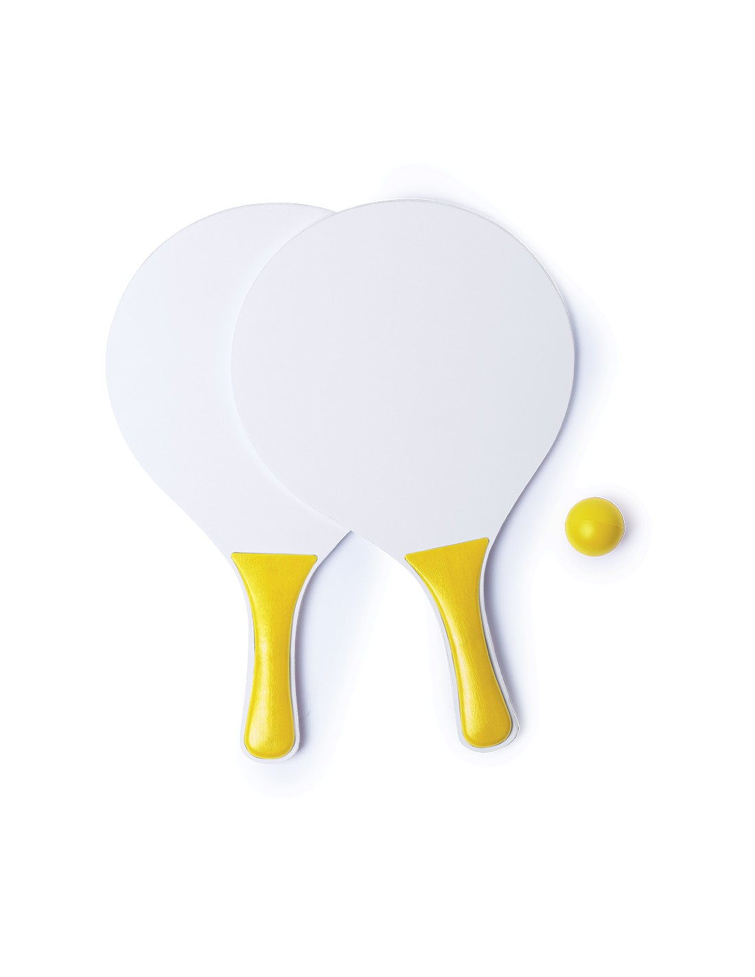 Par de palas de playa en madera natural blanca. Con mango reforzado en variada gama de vivos colores. Presentadas en bolsa redecilla con pelota a juego.