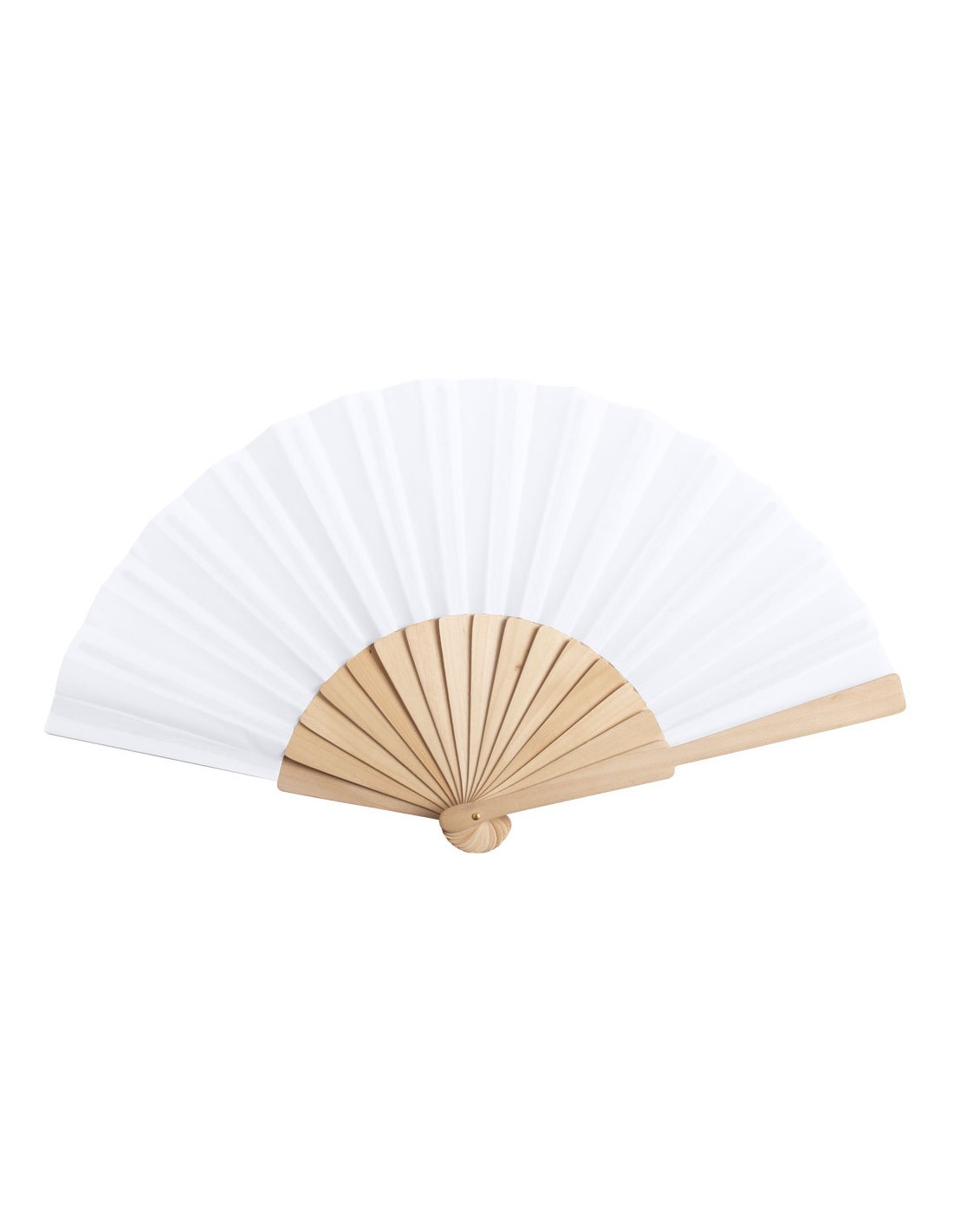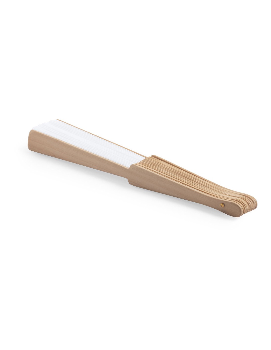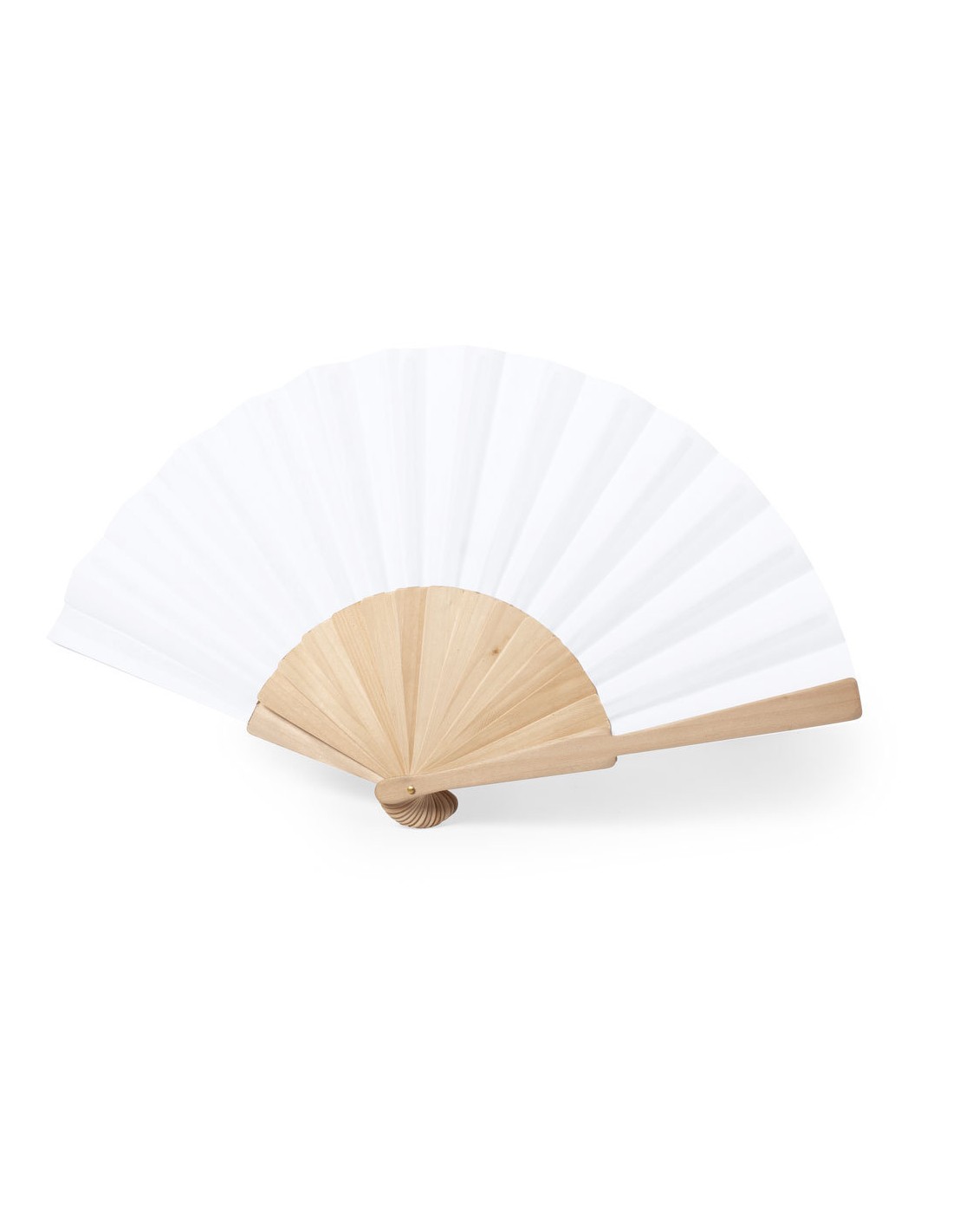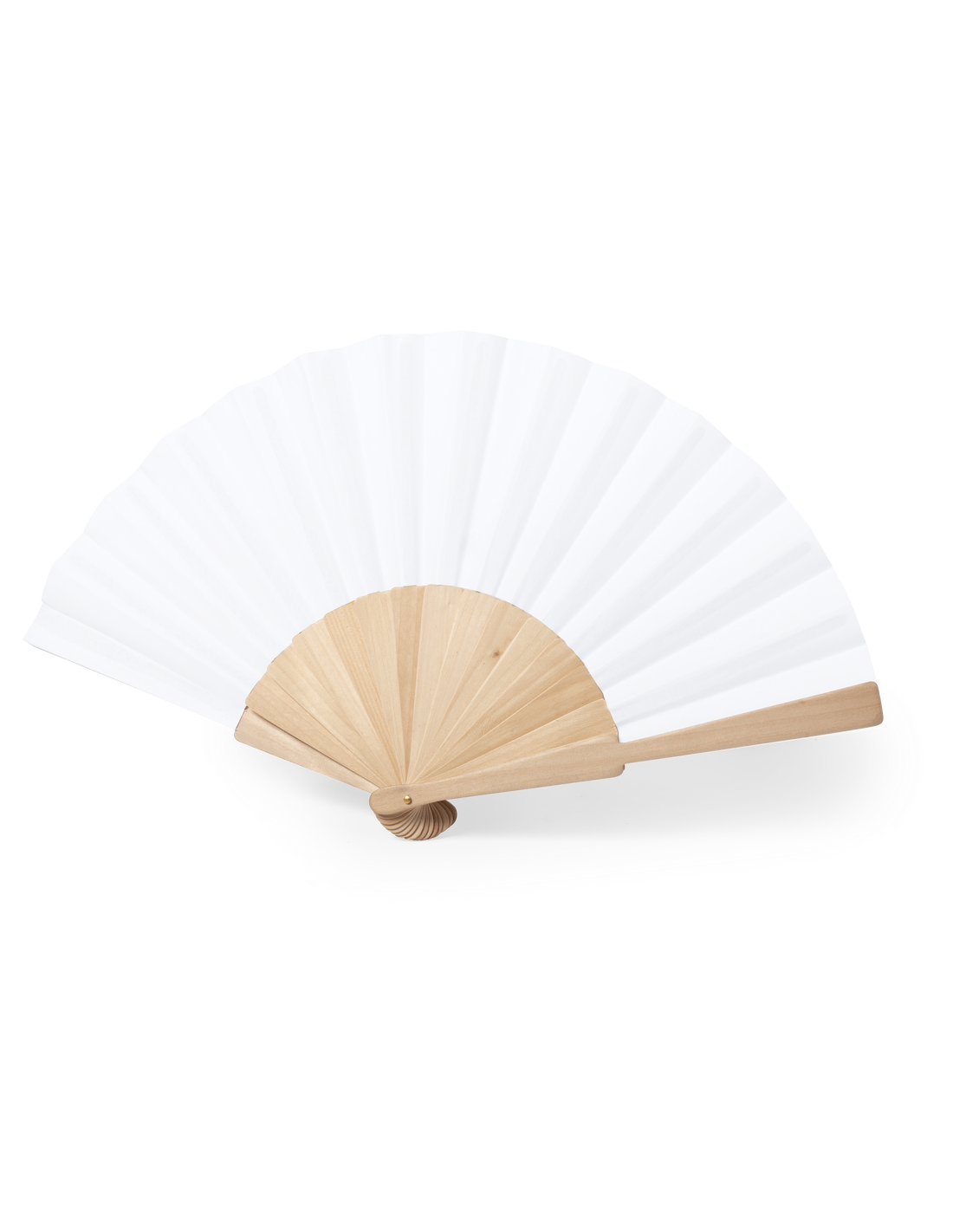 Abanico de línea nature, con varillas de madera y tela en RPET, elaborado a partir de plástico reciclado, para así fomentar la reutilización de residuos plásticos y ayudar a la sostenibilidad del planeta. Presentado en caja individual de diseño eco.