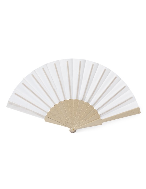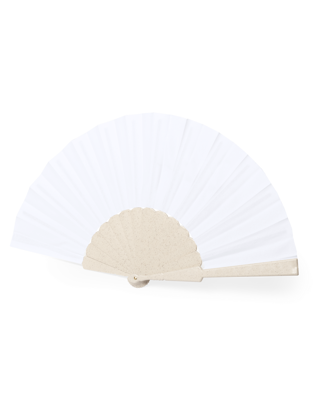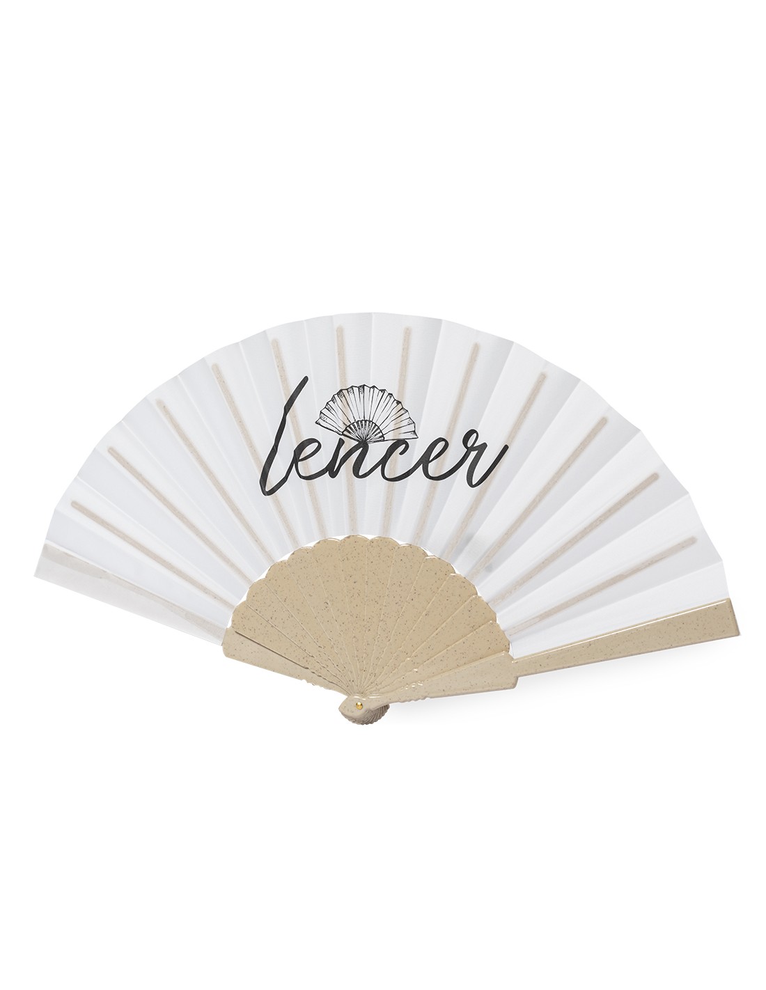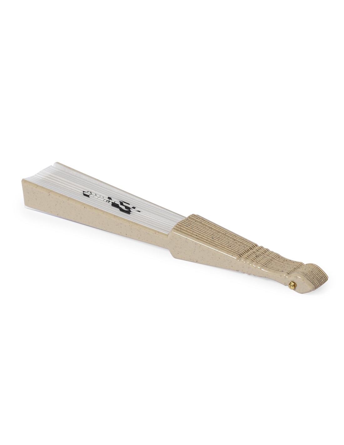Abanico de línea nature, con varillas de fibra de bambú y tela en RPET, elaborado a partir de plástico reciclado, para así fomentar la reutilización de residuos plásticos y ayudar a la sostenibilidad del planeta. Presentado en caja individual de diseño eco.