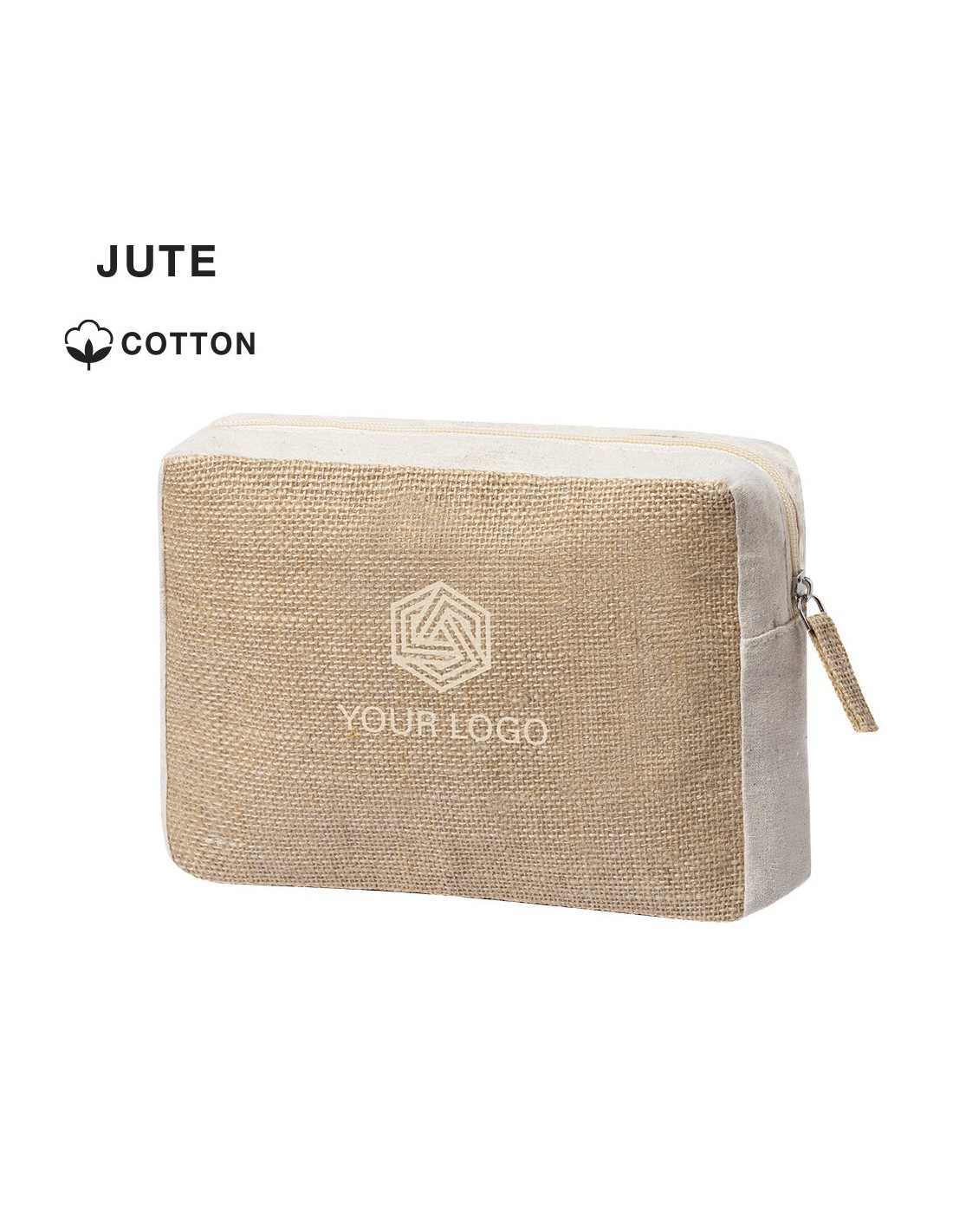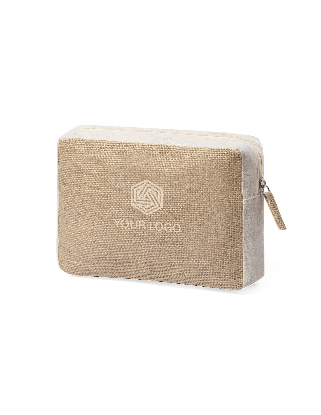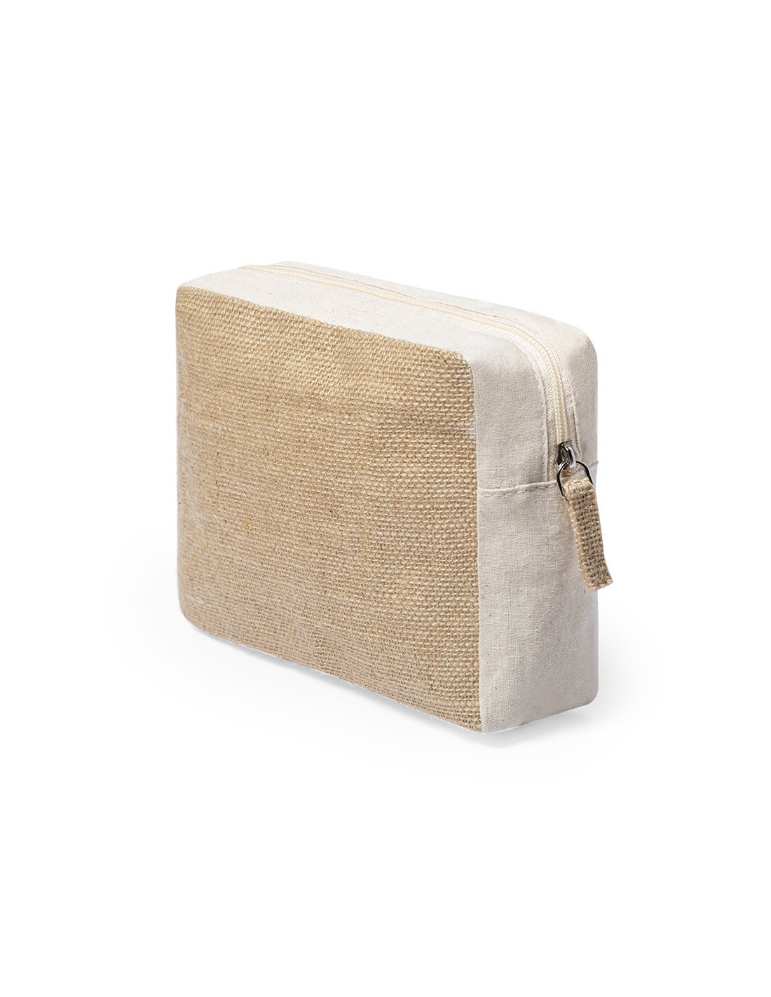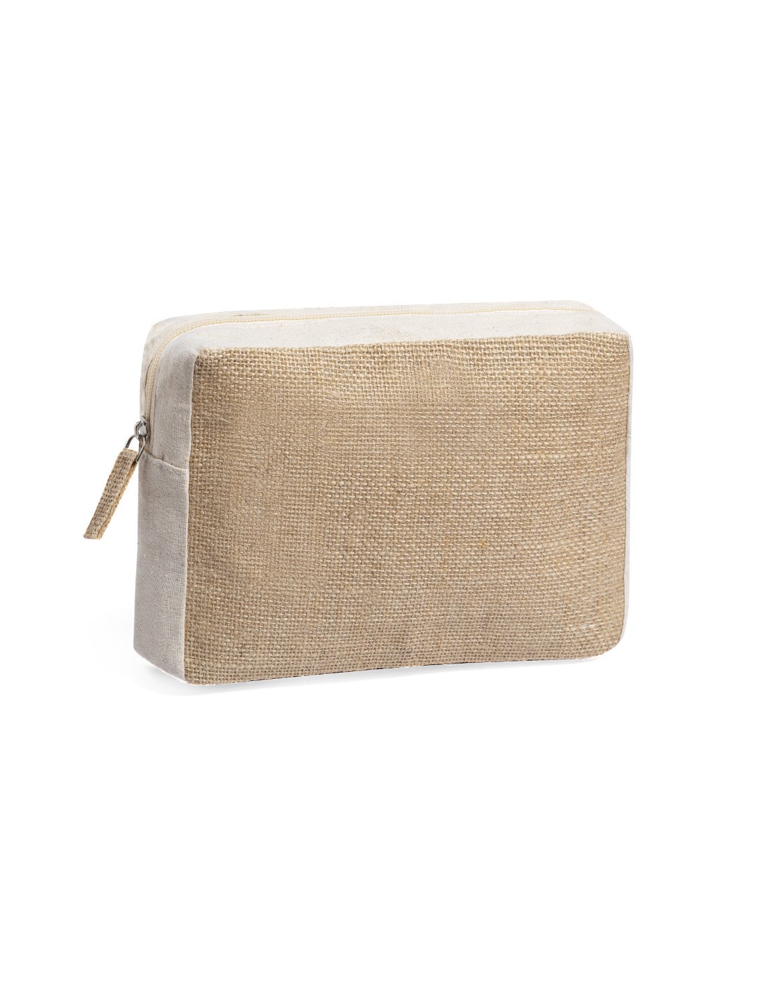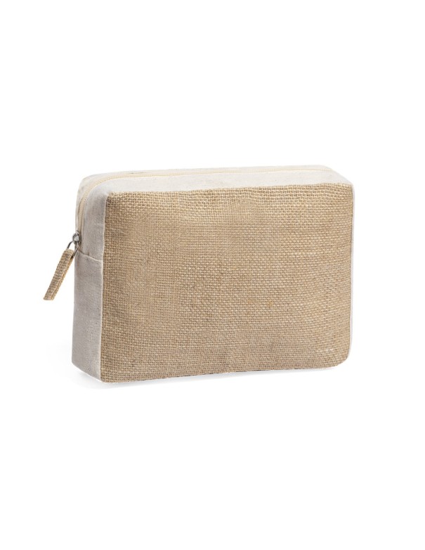Neceser de línea nature en combinación de yute laminado y algodón natural. Con cierre de cremallera y tirador en yute a juego.