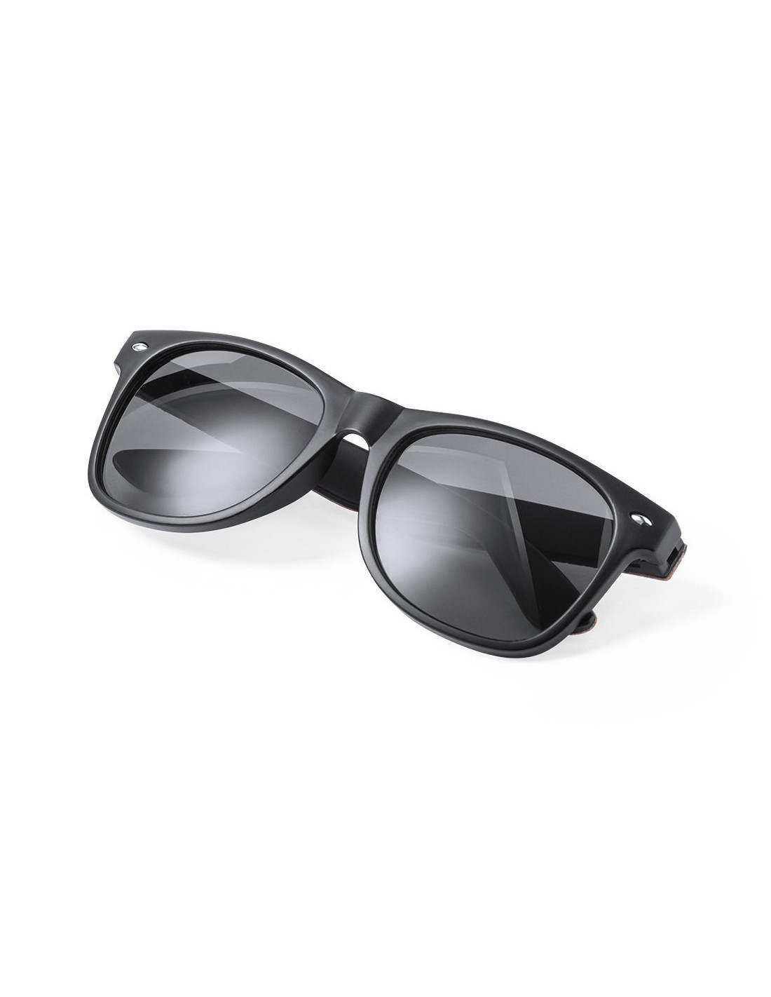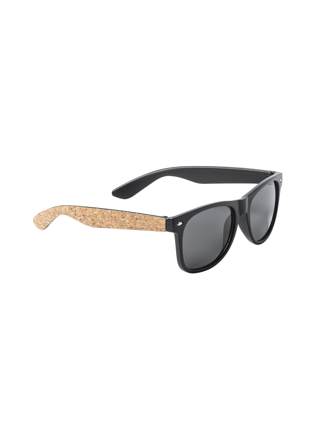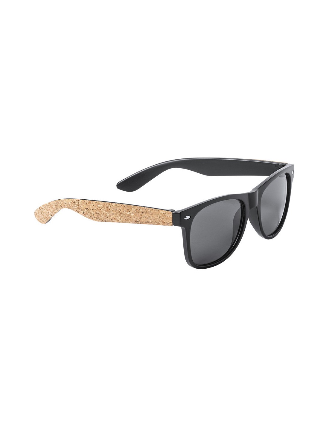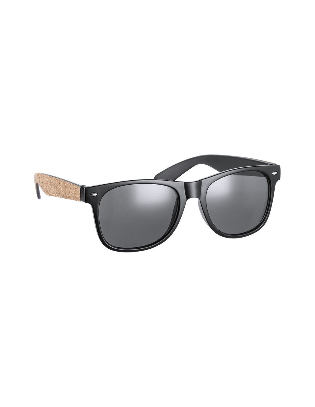 Gafas de sol de línea nature con protección UV400. Montura negra en resistente material PC, con lentes tintadas a juego y patas con recubrimiento de corcho natural. Presentadas en atractivo estuche de diseño eco.