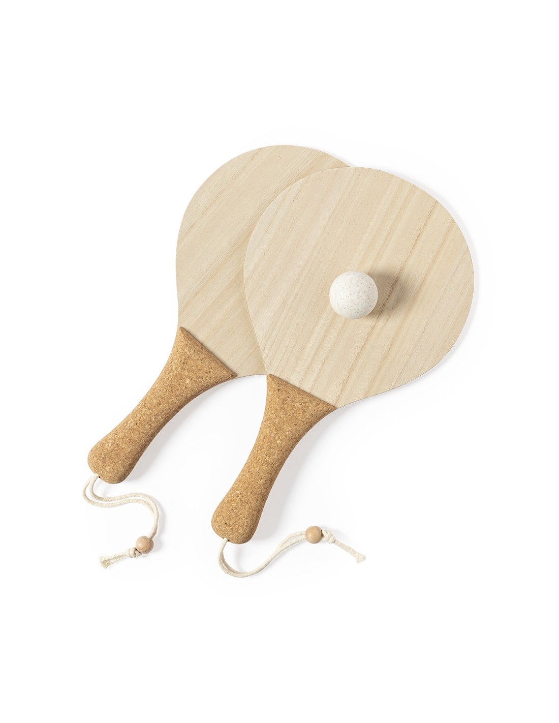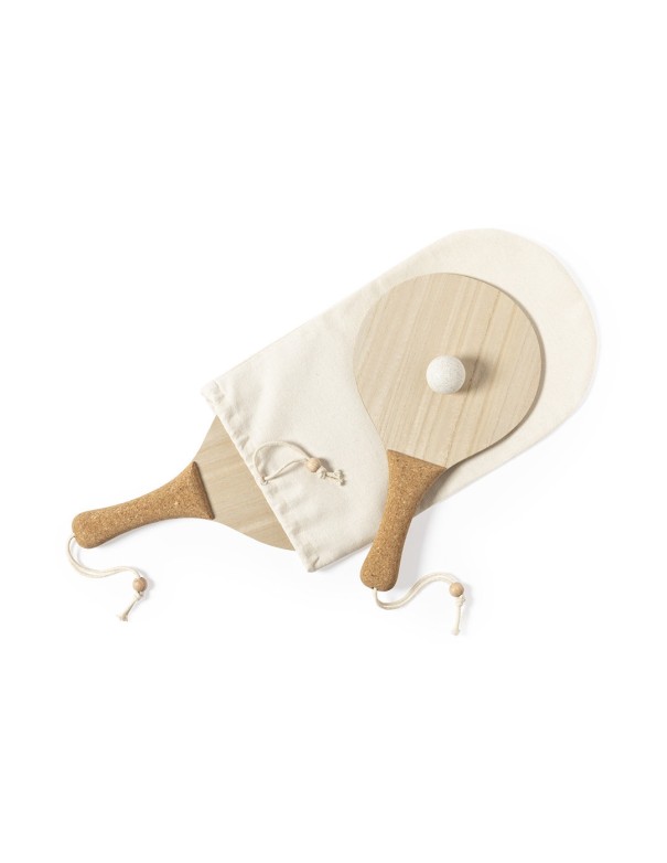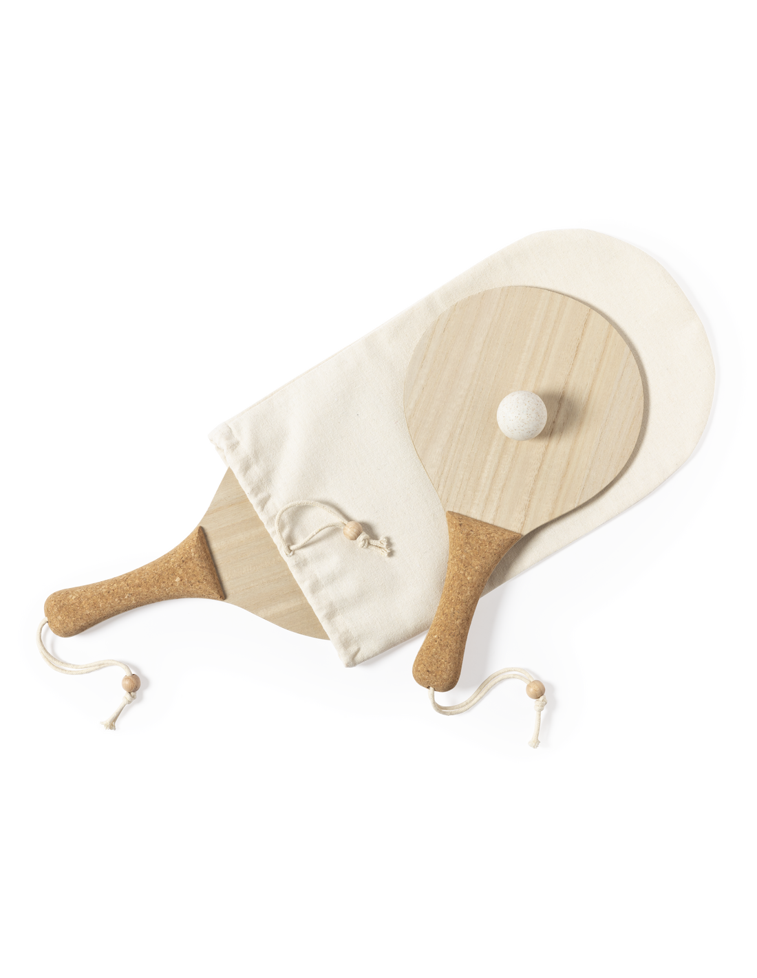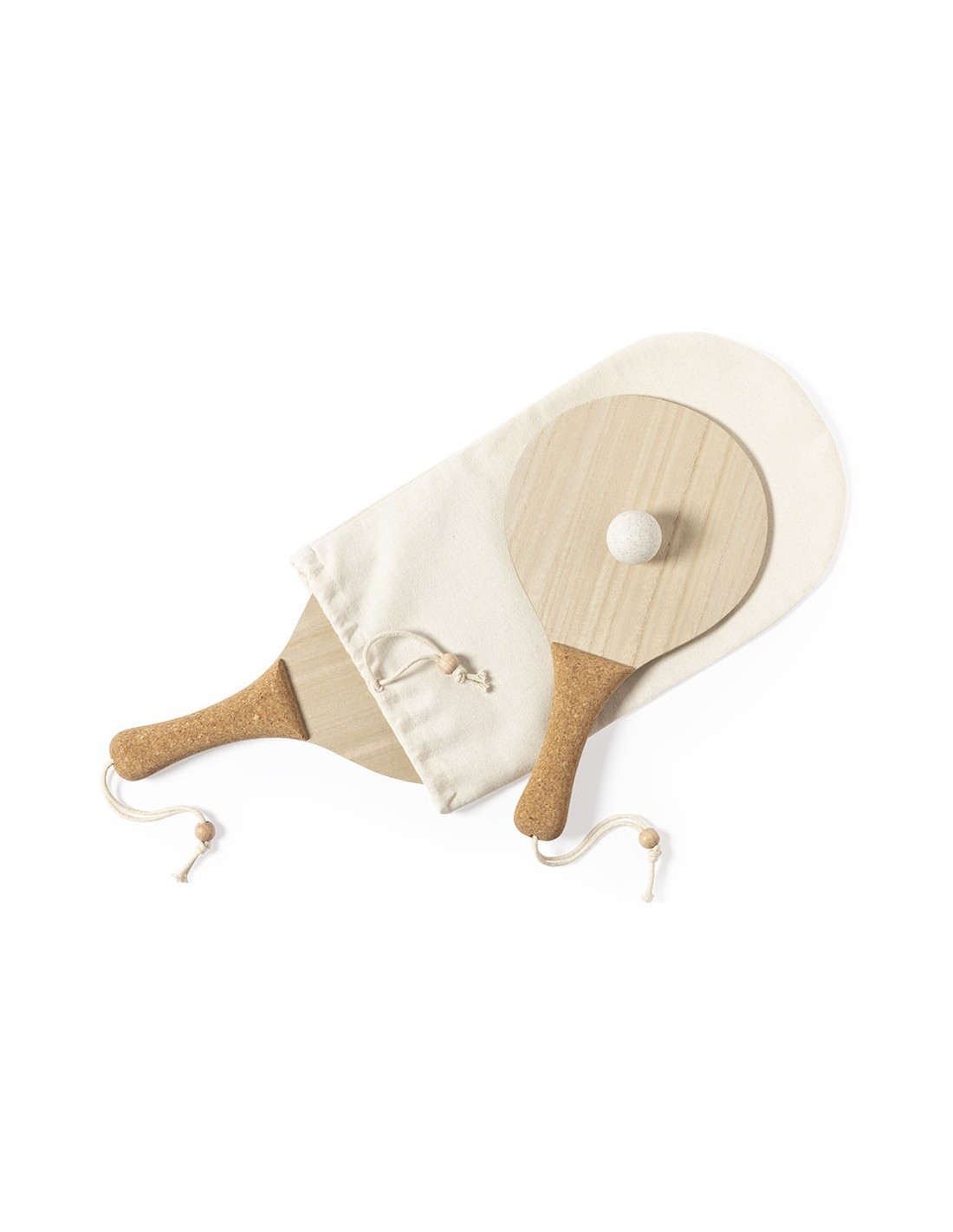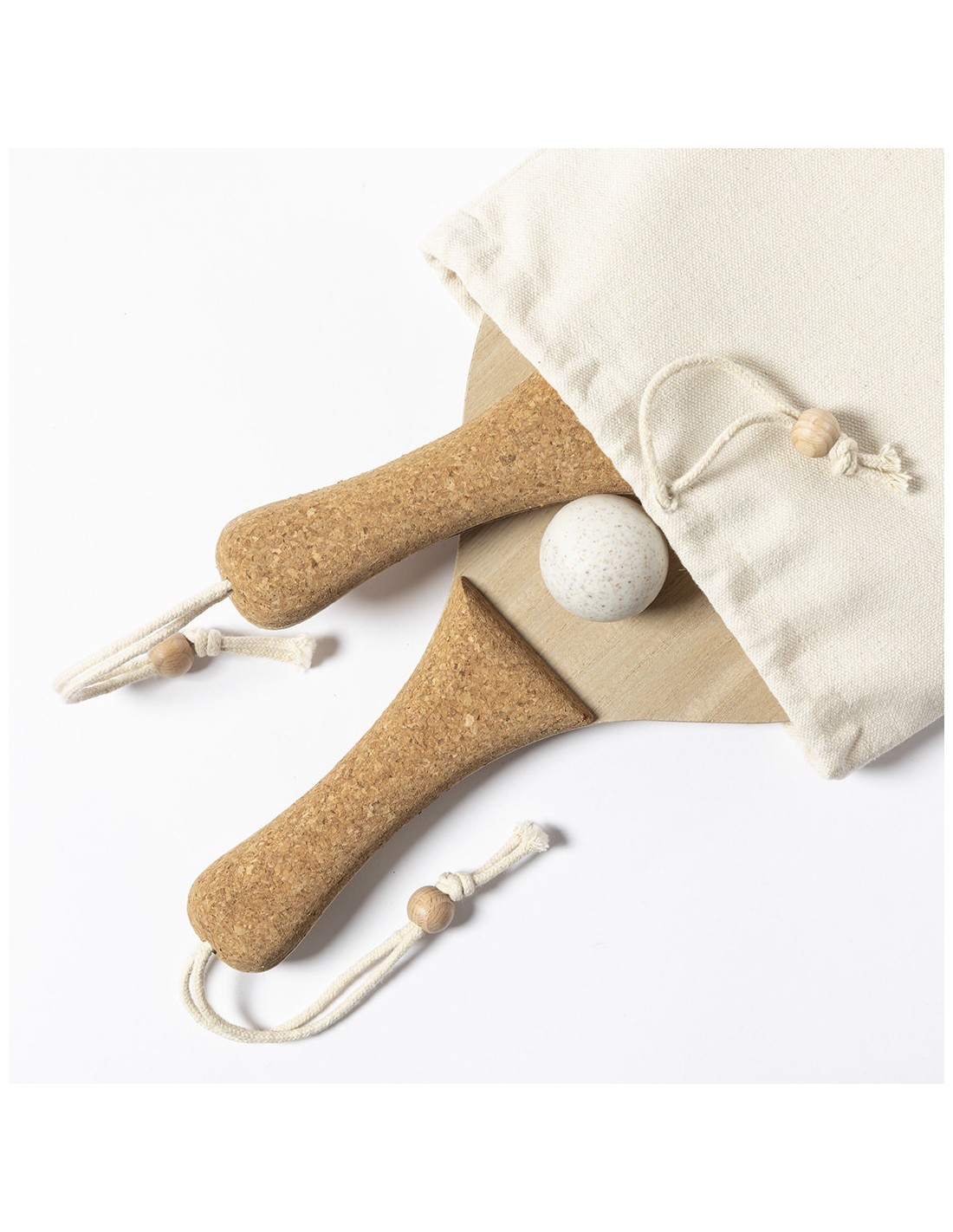 Par de palas de playa de línea nature. Fabricadas en madera, con mango reforzado en corcho natural y cintas para muñeca con ajustador. Presentadas en bolsa de algodón natural con cierre de cordón y pelota en caña de trigo.