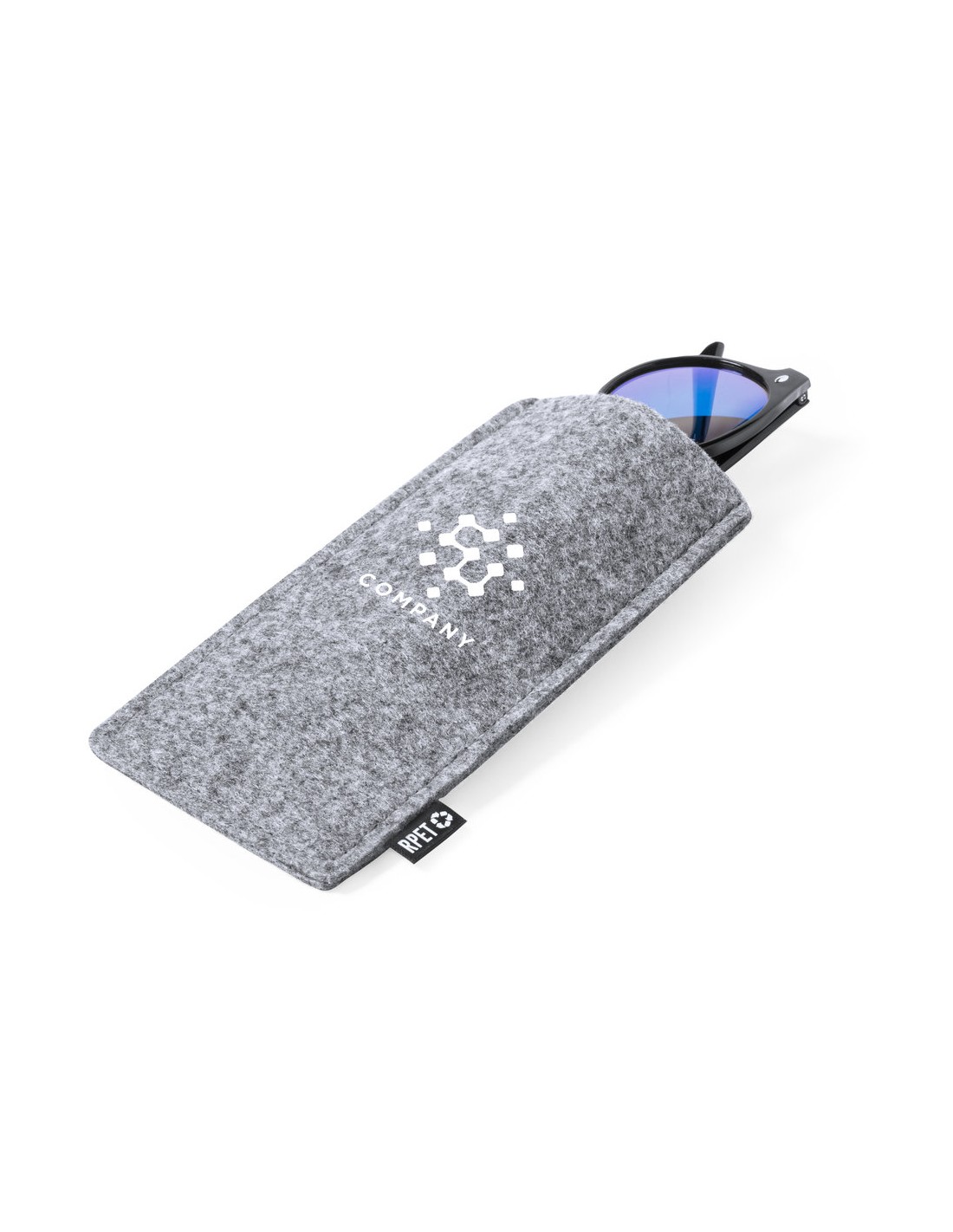 Funda para gafas de sol fabricada en resistente y suave fieltro RPET. Acabado cosido y con distintivo RPET en etiqueta exterior. El fieltro RPET es fruto de la combinación del proceso de reciclaje de materiales plásticos junto con la técnica milenaria de fabricación del fieltro, dando como resultado un material de eco-tendencia que, además de ser de origen reciclado, también se convierte en reciclable.