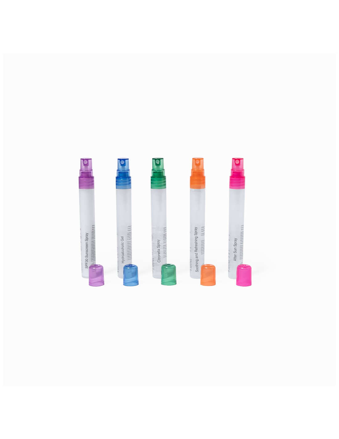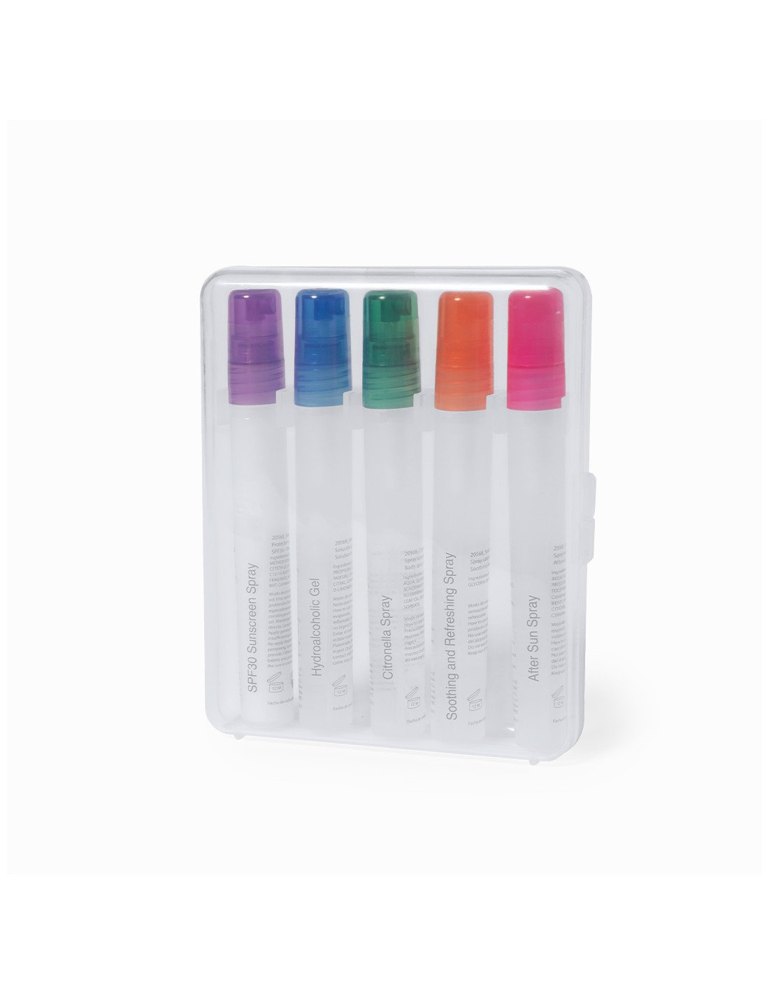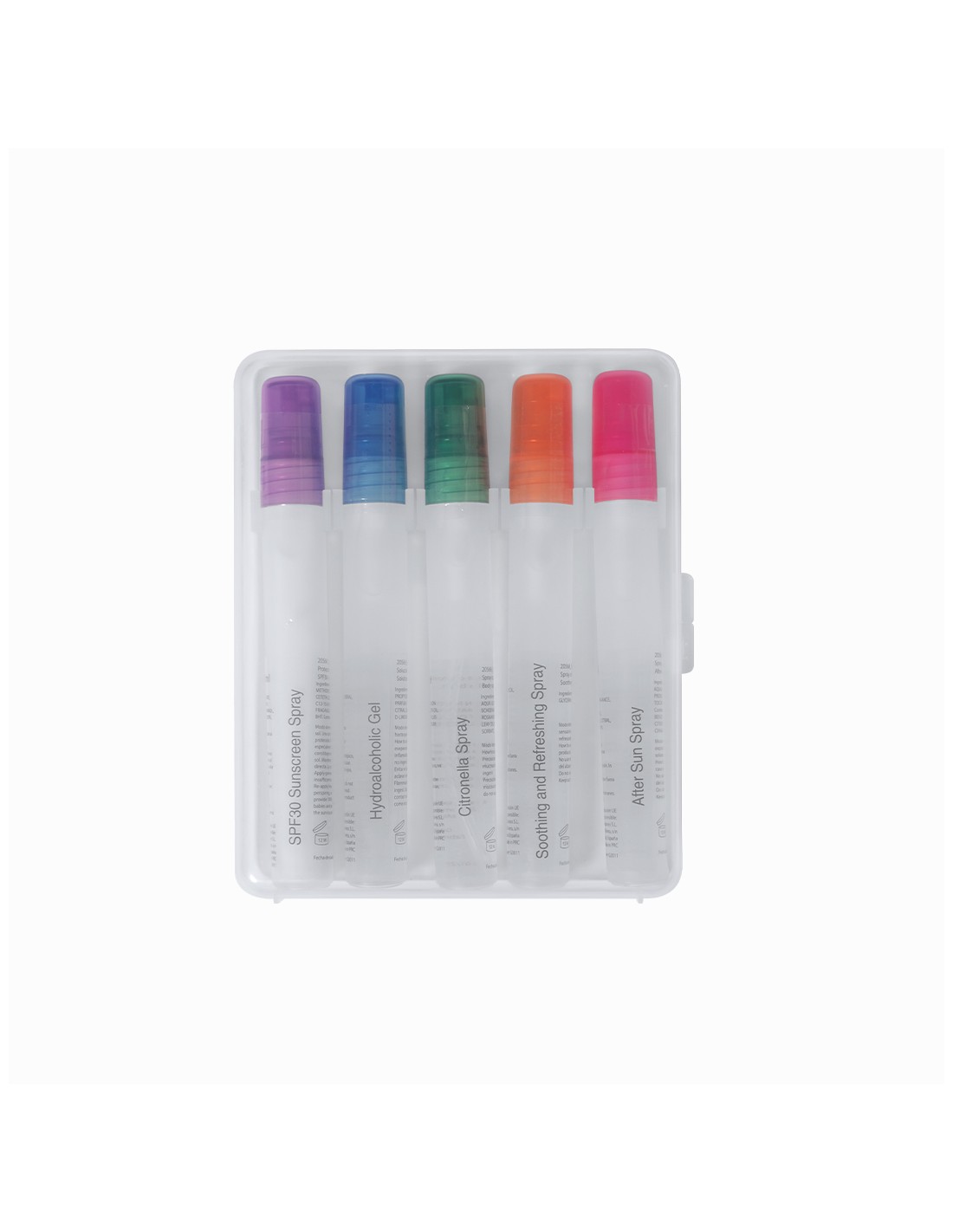 Excelente set de protección solar, muy completo y cómodo de transportar. Contiene 5 sprays, cada uno de ellos identificado y con vaporizador de un color diferente: protección solar SPF30, crema hidratante para después de tomar el sol, gel hidroalcohólico, citronela y solución para aliviar el escozor producido por las picaduras. Dermatológicamente testado y presentado en un resistente estuche de plástico transparente.