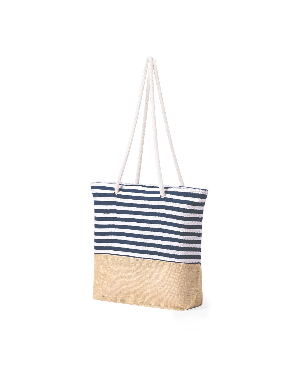 Bolsa fabricada en resistente algodón de 450g/m2 y base de yute. De acabado cosido, cierre de cremallera, con distinguido diseño a rayas blancas y azules. Asas largas hechas en algodón de color blanco en forma de cuerda reforzadas con argollas. Resistencia hasta 13kg de peso.