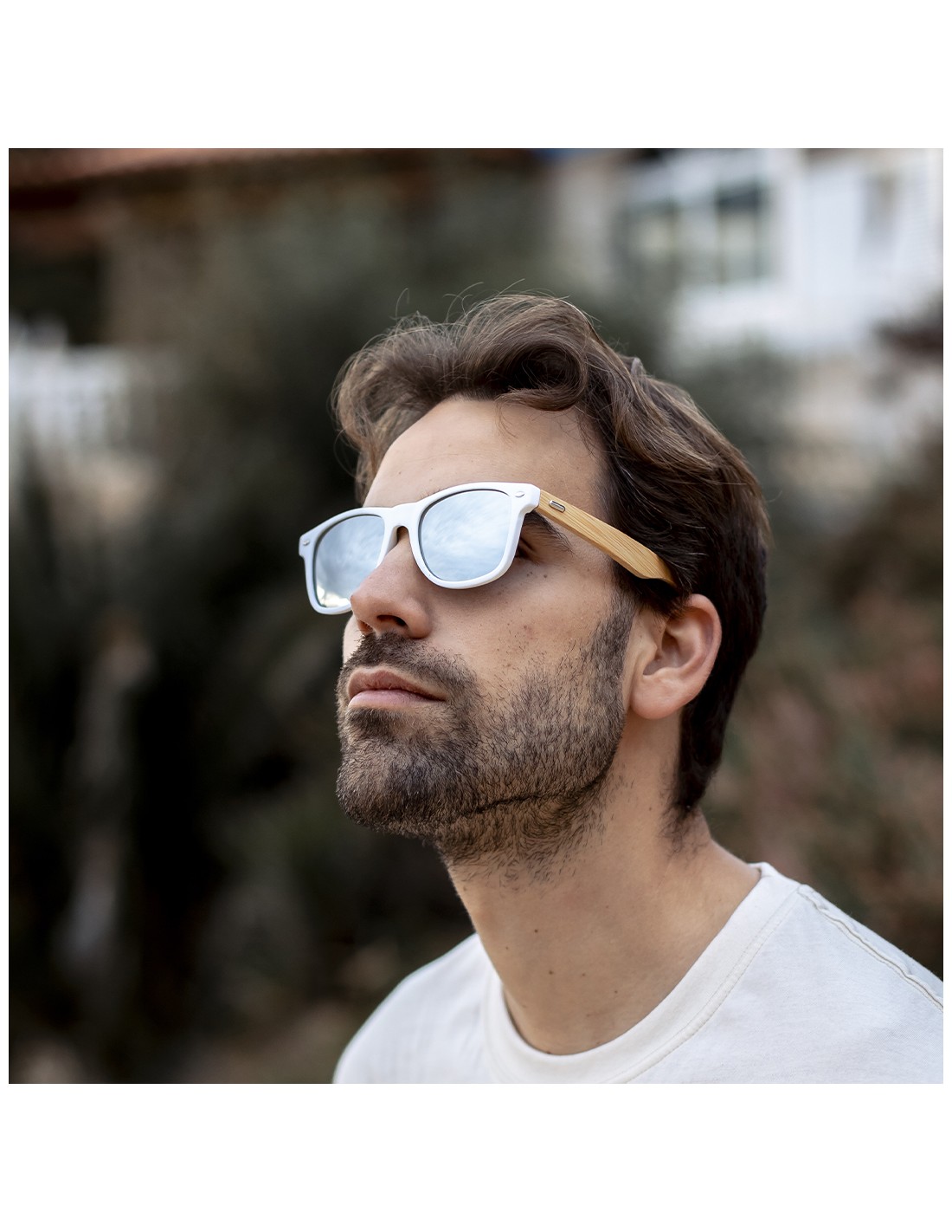 Gafas de sol fabricadas en bambú con protección UV400. Montura de colores en resistente material PC y patillas en bambú. Lentes AC (acetato de celulosa) de acabado espejo, disponibles en variada gama de colores en combinación con la montura. Presentada en atractiva bolsa de papel diseño kraft.Materiales como el bambú fomentan la utilización de materias primas naturales, reduciendo las emisiones contaminantes. Proviene de una planta de gran resistencia y versatilidad, con crecimiento y regeneración rápidos, siendo una excelente alternativa al uso de madera tradicional.