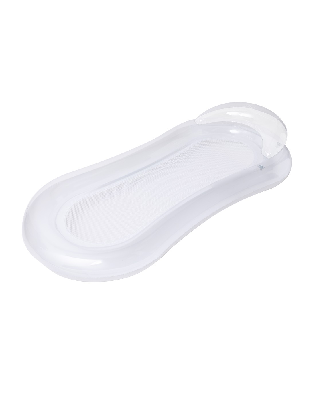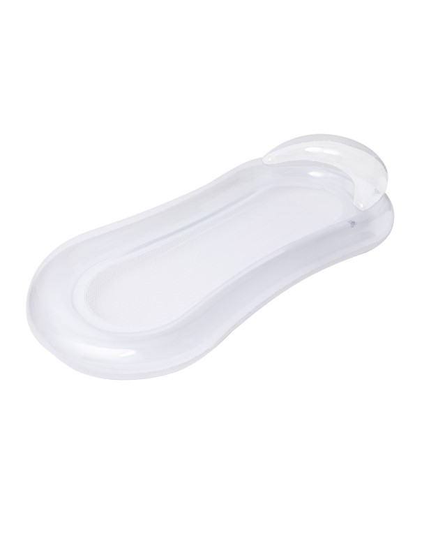 Original colchoneta en resistente PVC. Incluye una cómoda almohada para la cabeza, con diseño bitono, en colores transparente y blanco. Incluye una resistente redecilla central en poliéster de color blanco. Con plegado especial para fácil impresión. Se sirve desinflada y en una práctica bolsa individual reciclada.