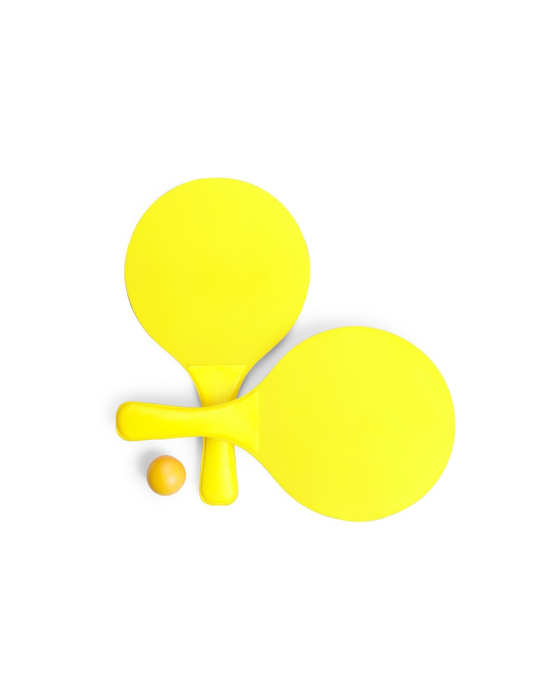 Par de palas de playa de alta calidad en madera natural de variada gama en vivos colores. Con mango reforzado a juego y presentadas en bolsa redecilla con pelota.