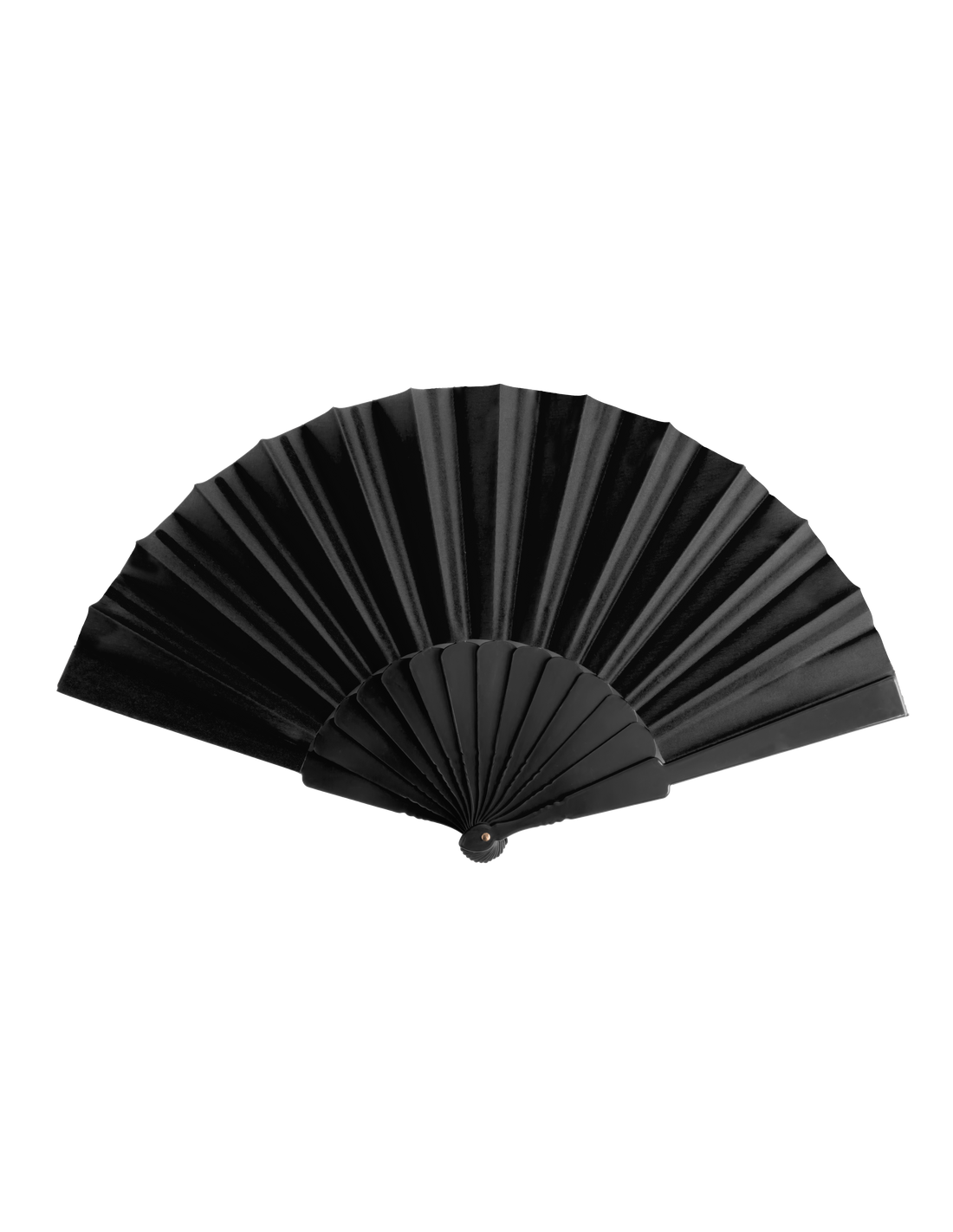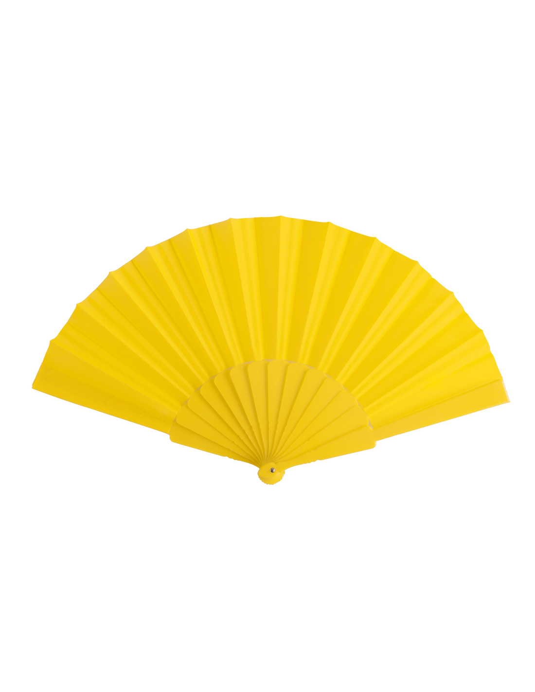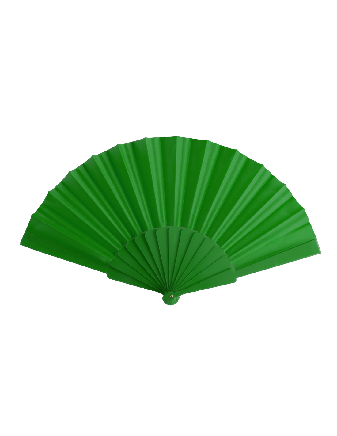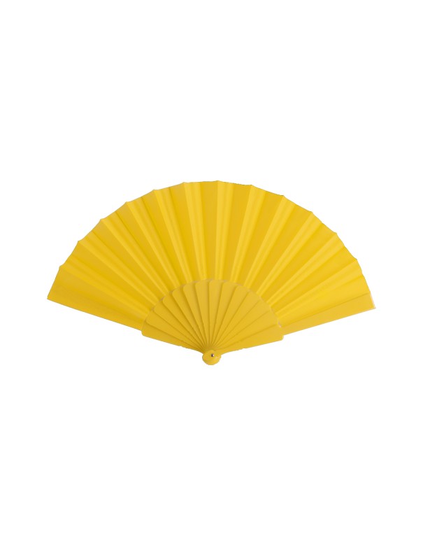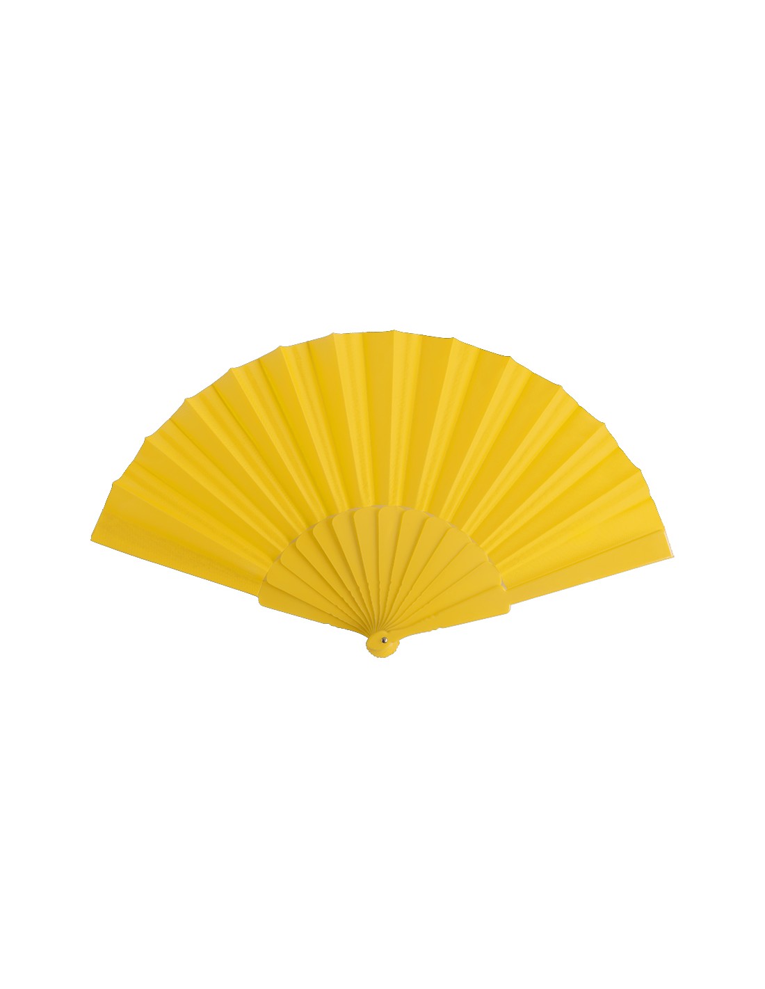 Abanico con varillas fabricadas en resistente plástico y tela en poliéster. Varillas y tela a juego, disponible en variada gama de colores. Presentado en caja individual blanca con ventana.