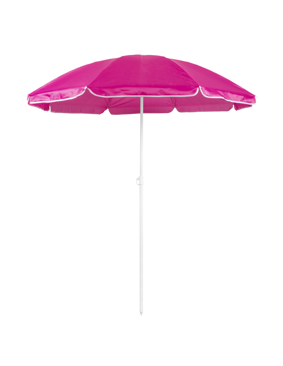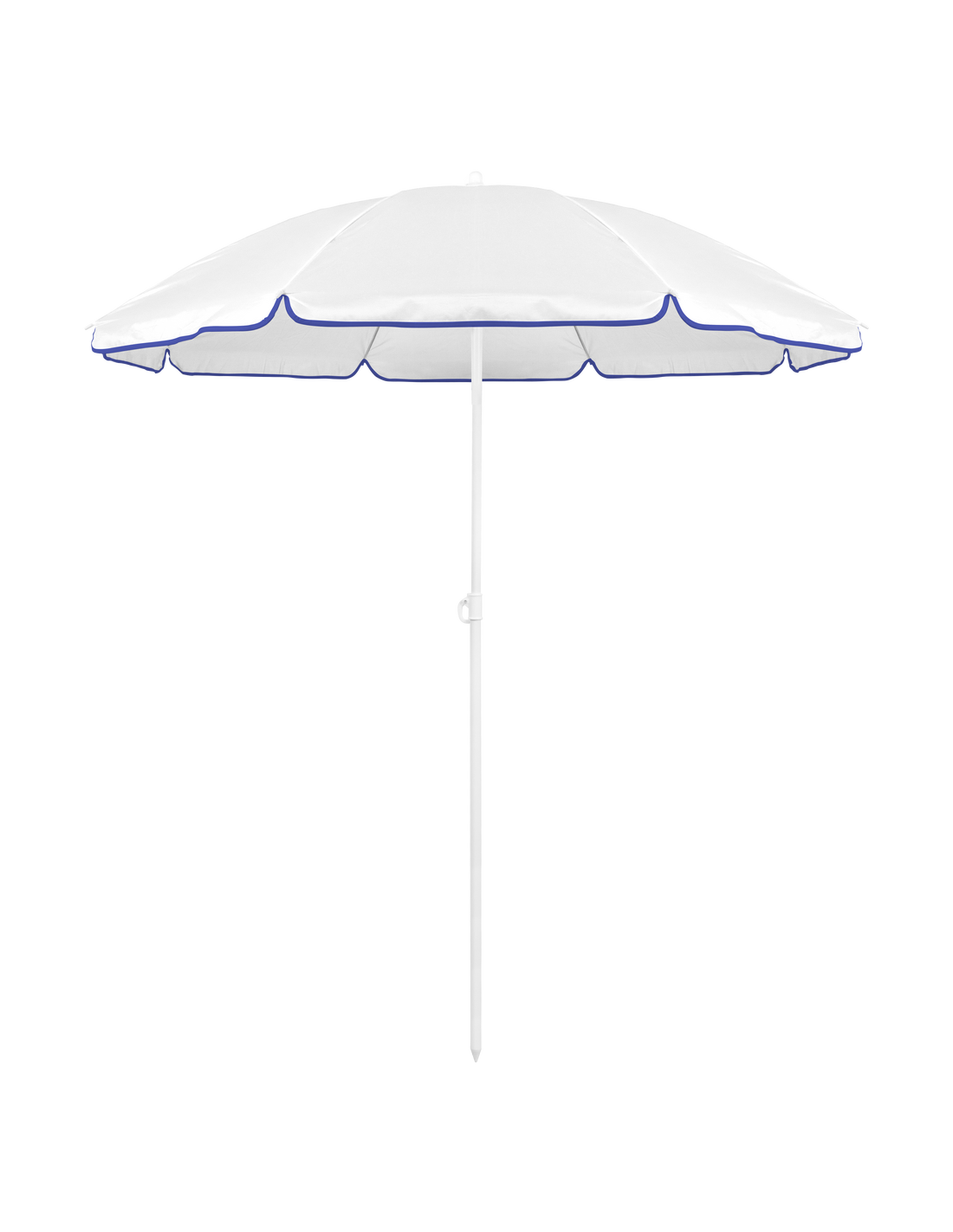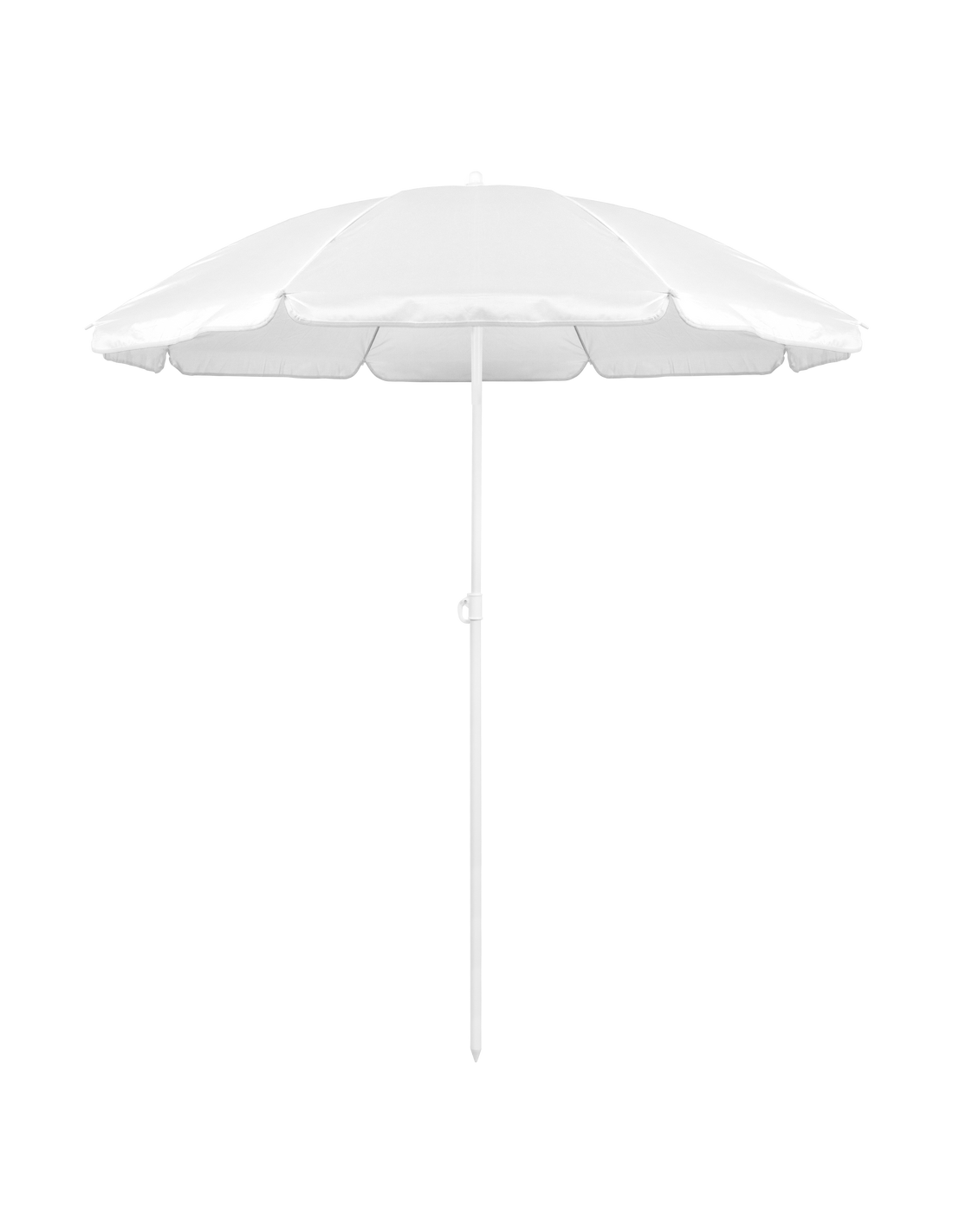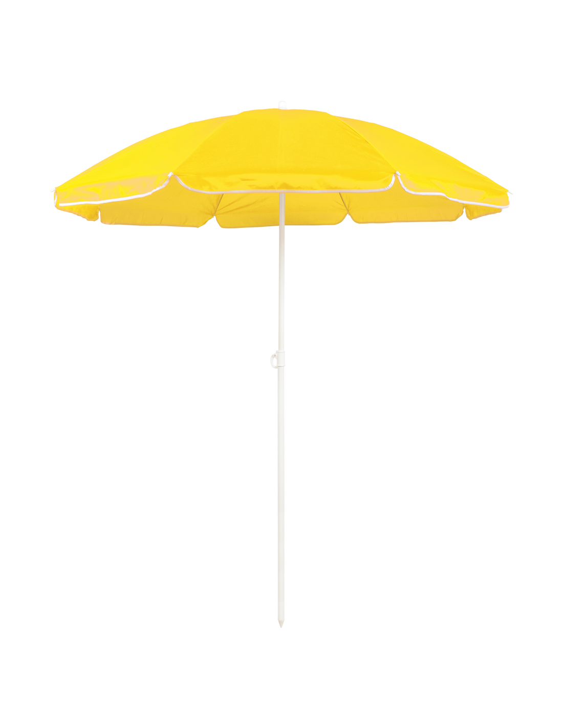 Sombrilla de playa de 8 paneles de resistente nylon en variada gama de vivos colores. De 150cm de diámetro, con faldones laterales ribeteados, tubos metalizados en color blanco y ajustable en altura. Presentada en funda de PVC con cinta de transporte para hombro.