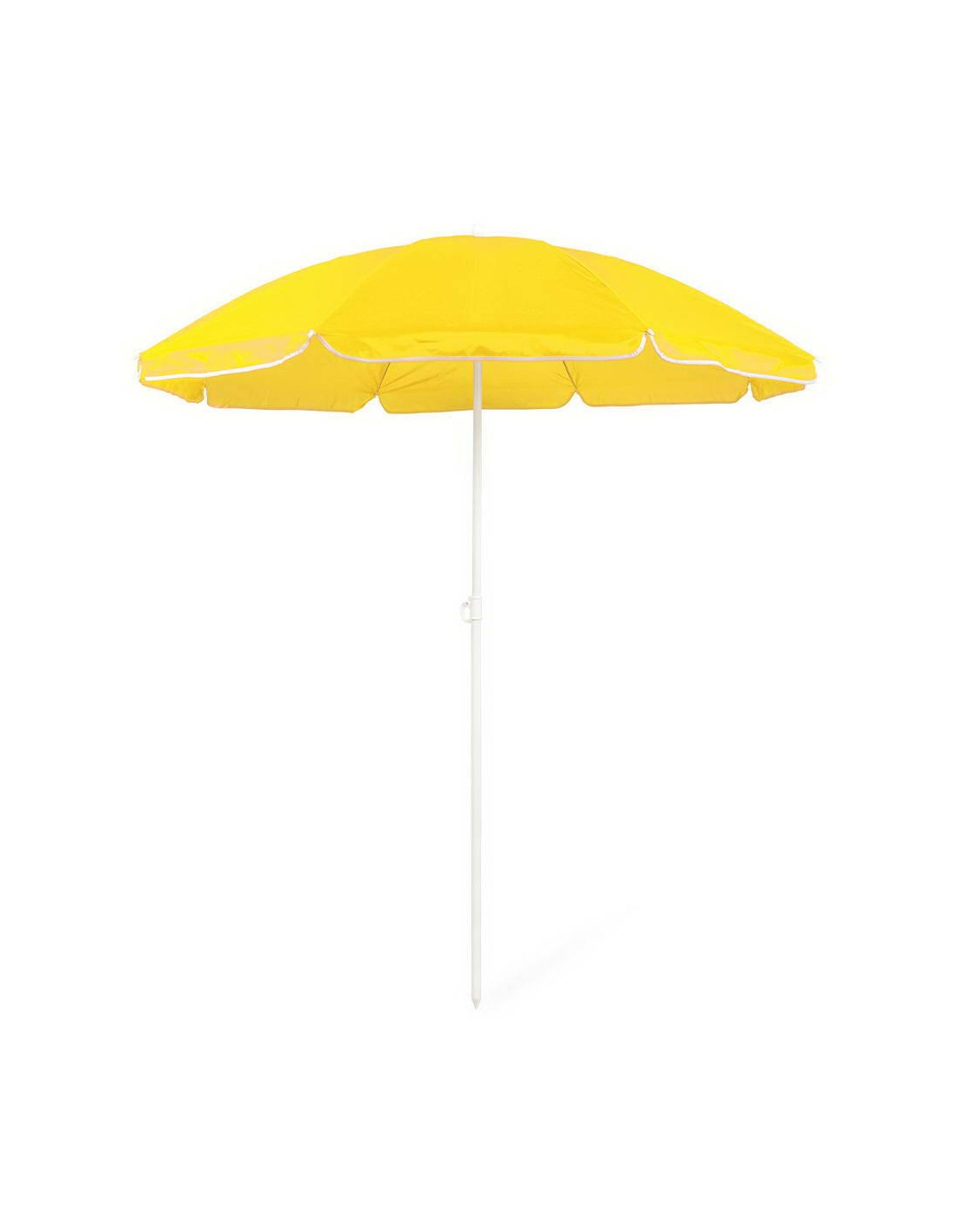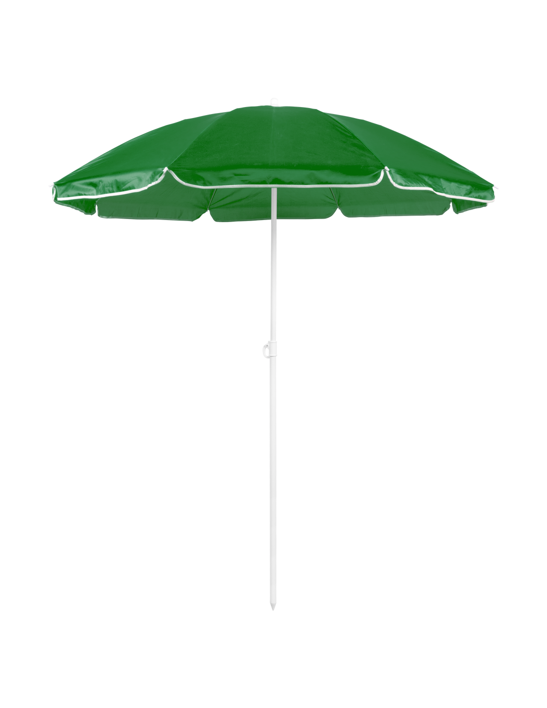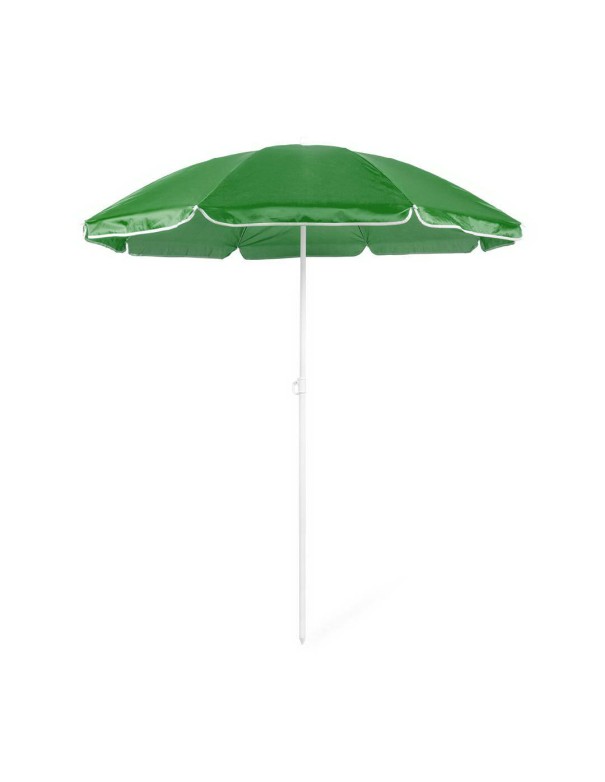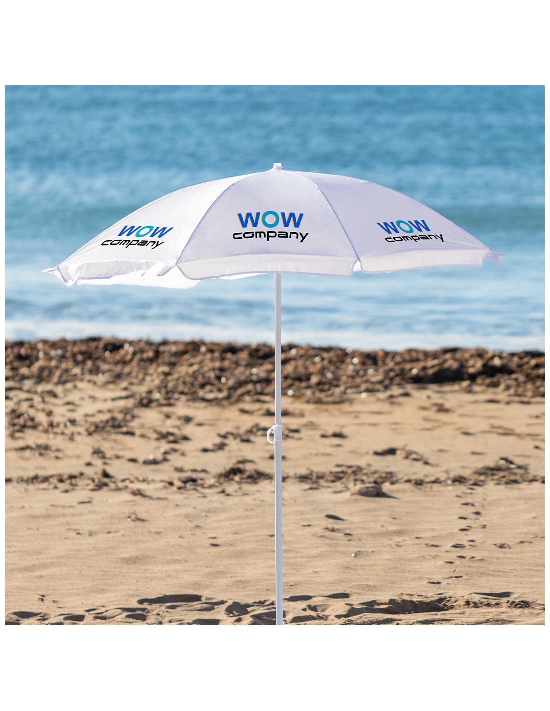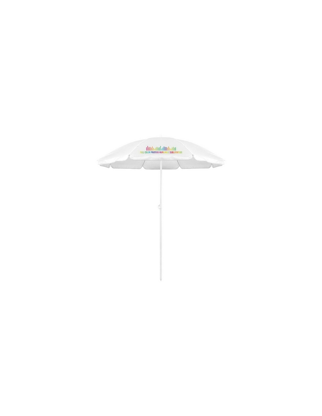 Sombrilla de playa de 8 paneles de resistente nylon en variada gama de vivos colores. De 150cm de diámetro, con faldones laterales ribeteados, tubos metalizados en color blanco y ajustable en altura. Presentada en funda de PVC con cinta de transporte para hombro.