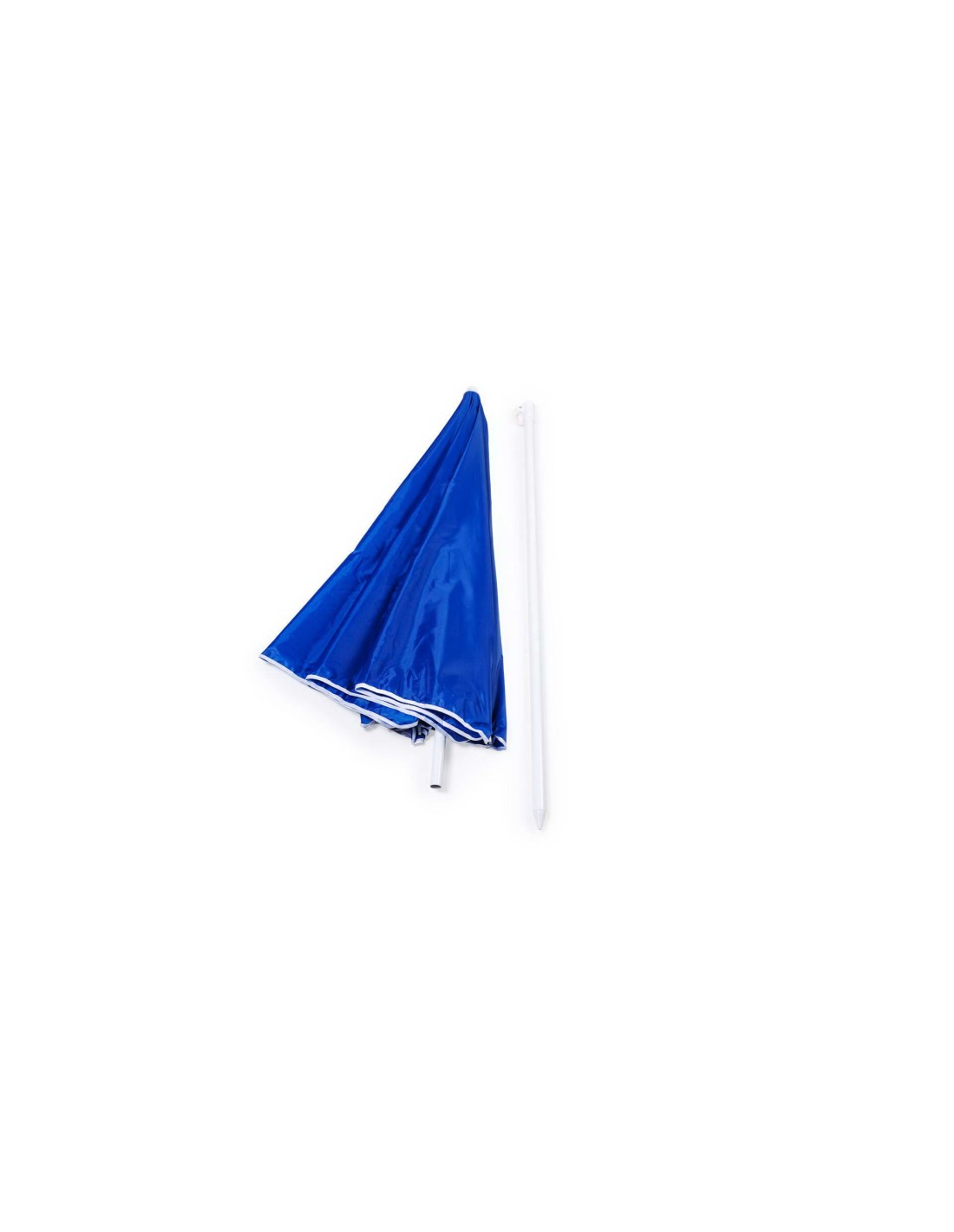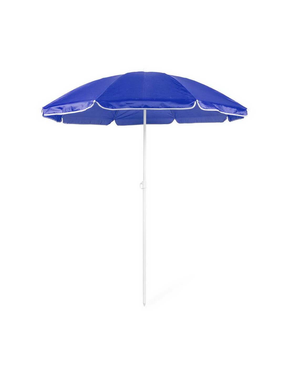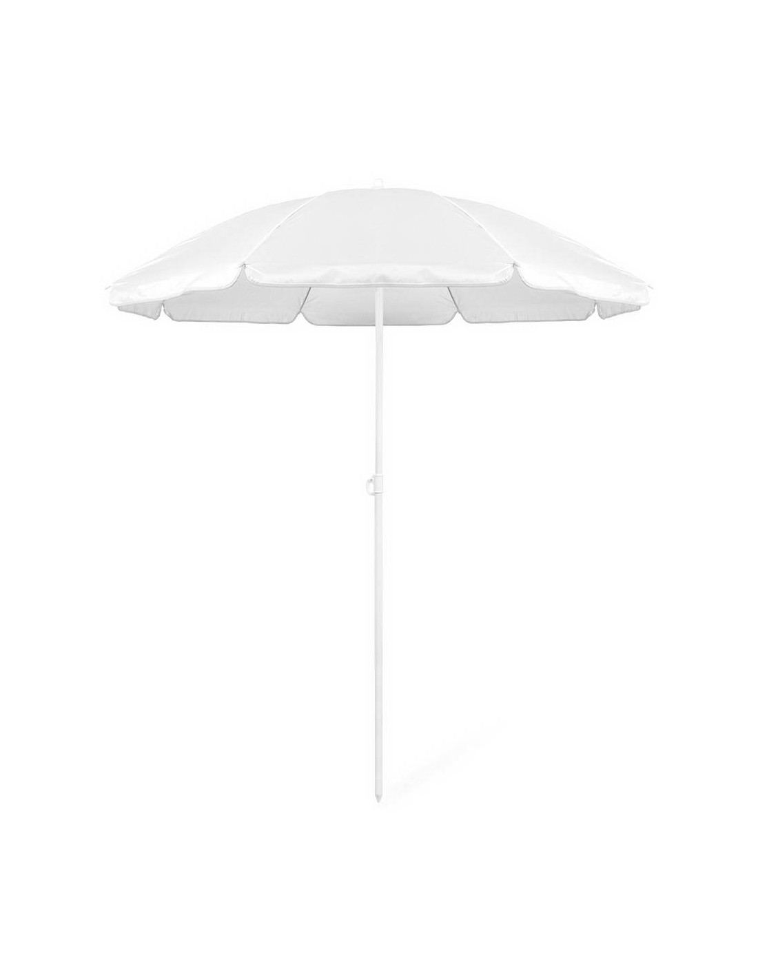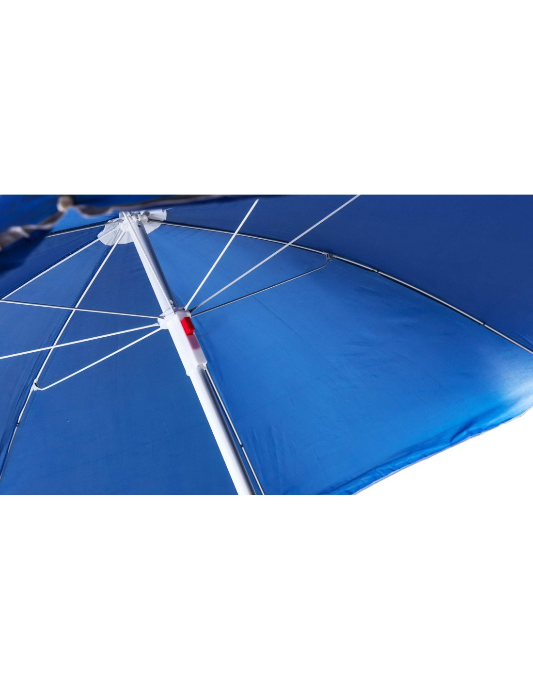 Sombrilla de playa de 8 paneles de resistente nylon en variada gama de vivos colores. De 150cm de diámetro, con faldones laterales ribeteados, tubos metalizados en color blanco y ajustable en altura. Presentada en funda de PVC con cinta de transporte para hombro.