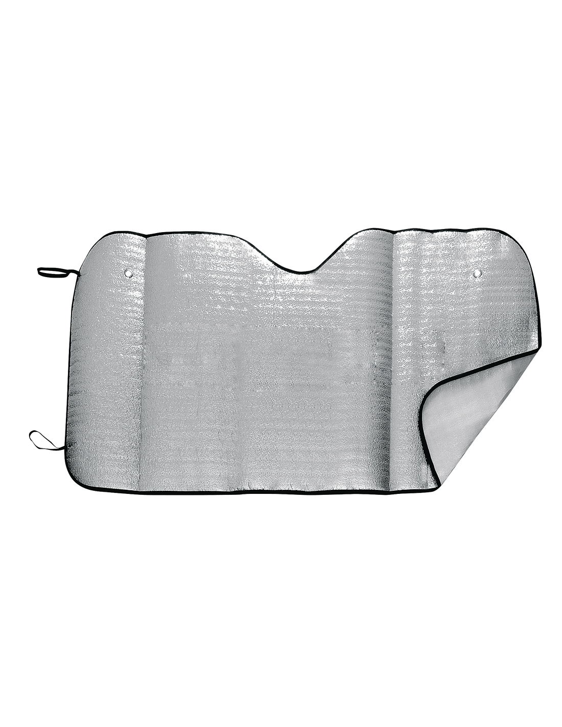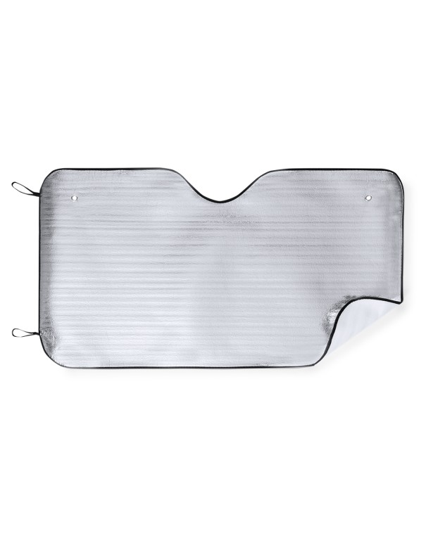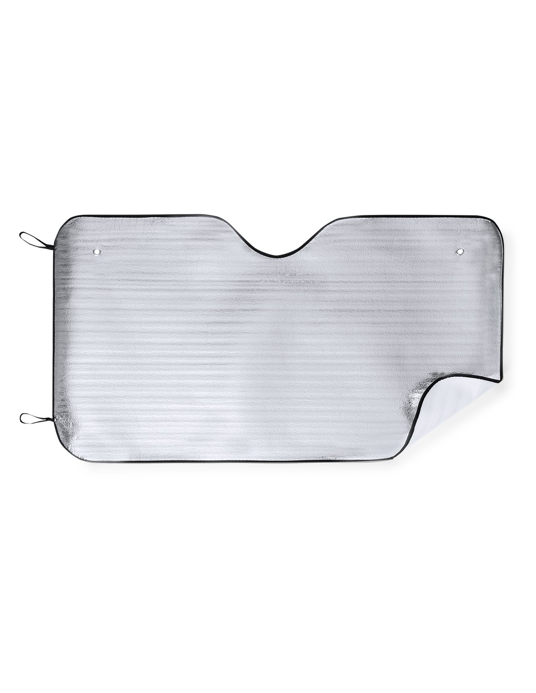 Parasol en aluminio a una cara en color plateado de acabado metalizado con ribetes de poliéster en color negro. De tamaño 130x70cm y espuma en el reverso. Cintas elásticas de plegado con argollas metálicas de refuerzo, dos ventosas para ajuste en luna y presentación desplegado en plancha para fácil impresión.