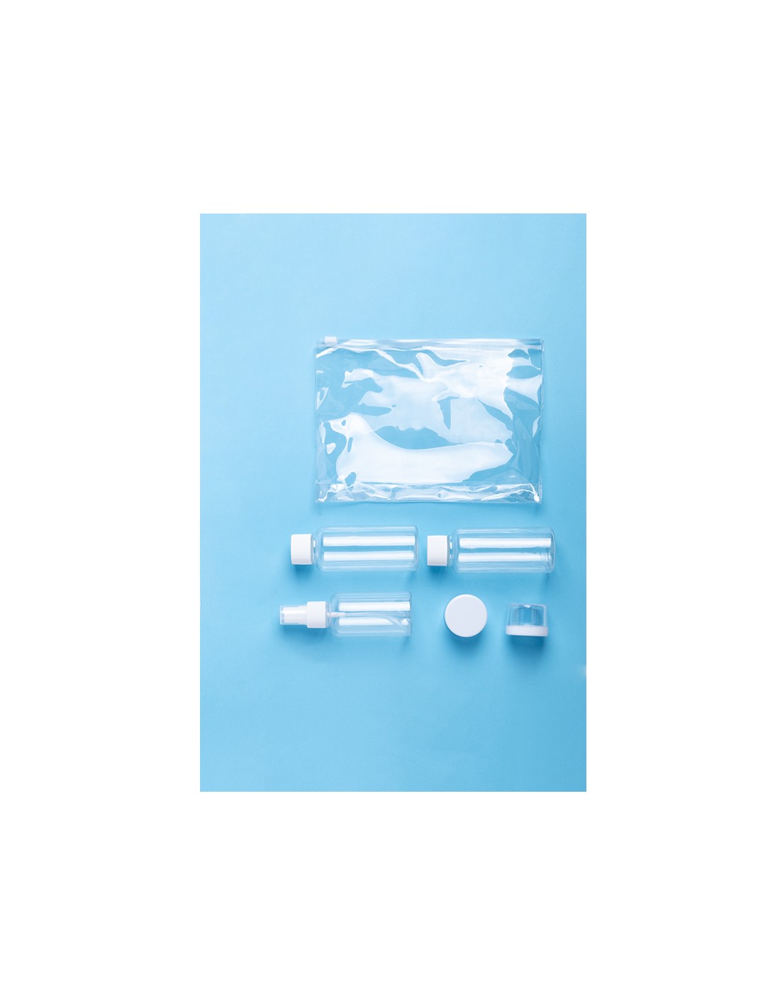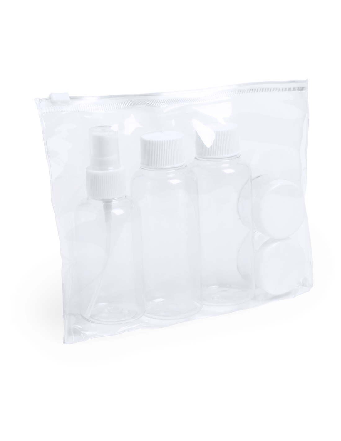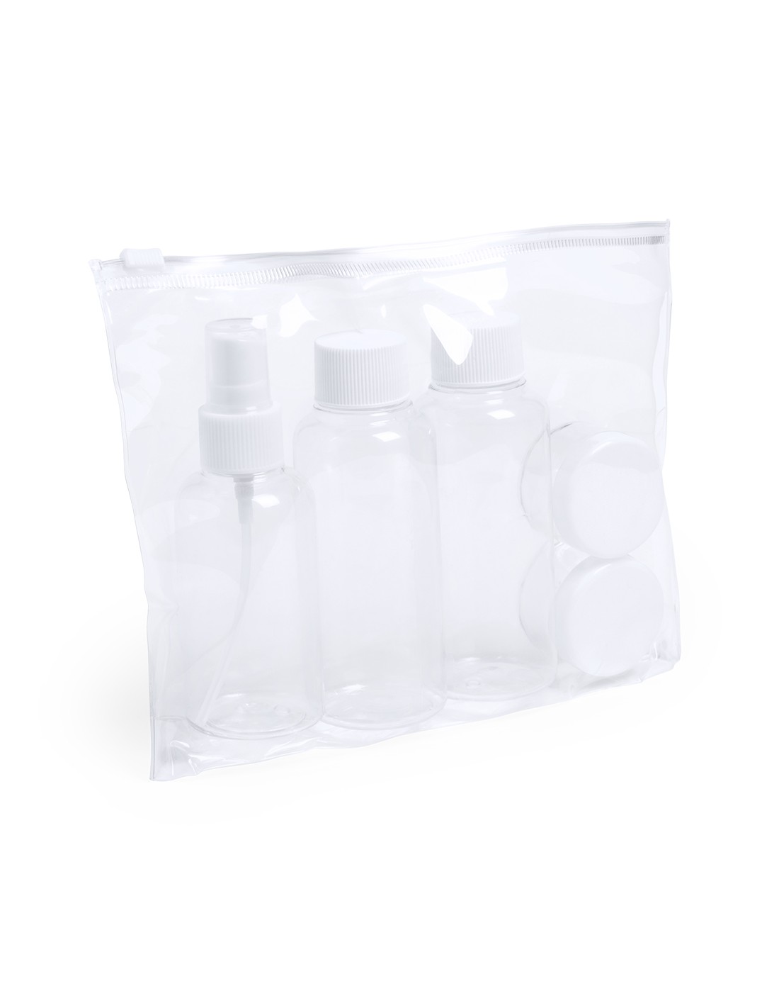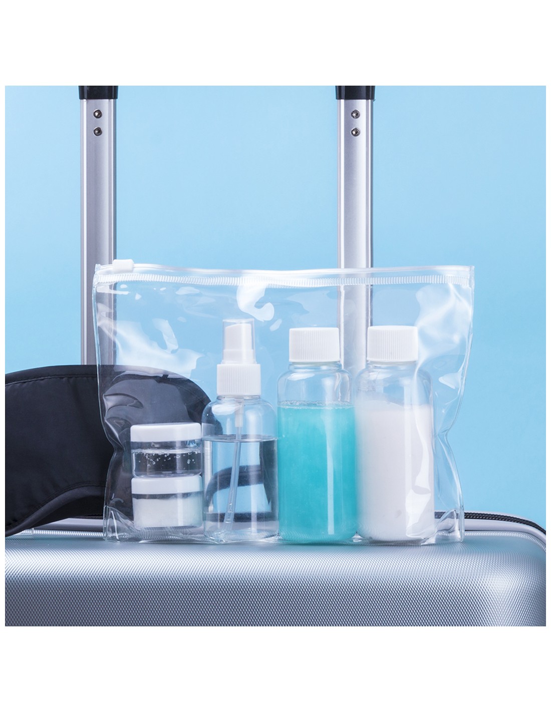 Set neceser de viaje de 5 accesorios en diseño transparente. Incluye dos botes para gel y champú con tapón a rosca, perfumador y dos tarritos para crema. Presentado en estuche de PVC con cierre hermético a juego.