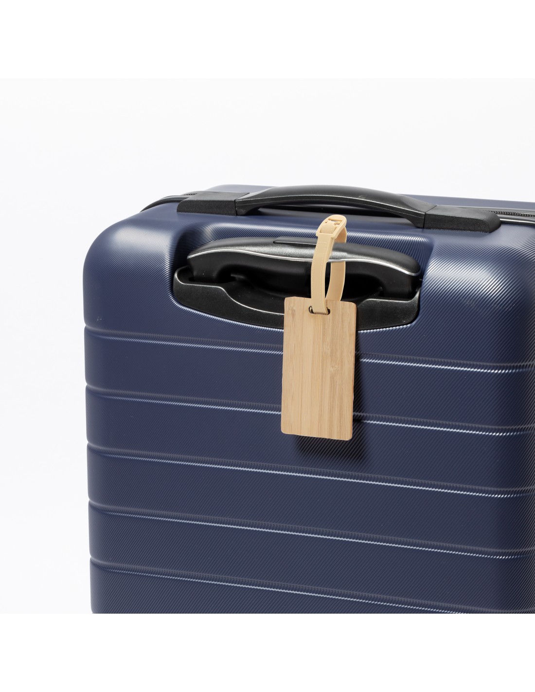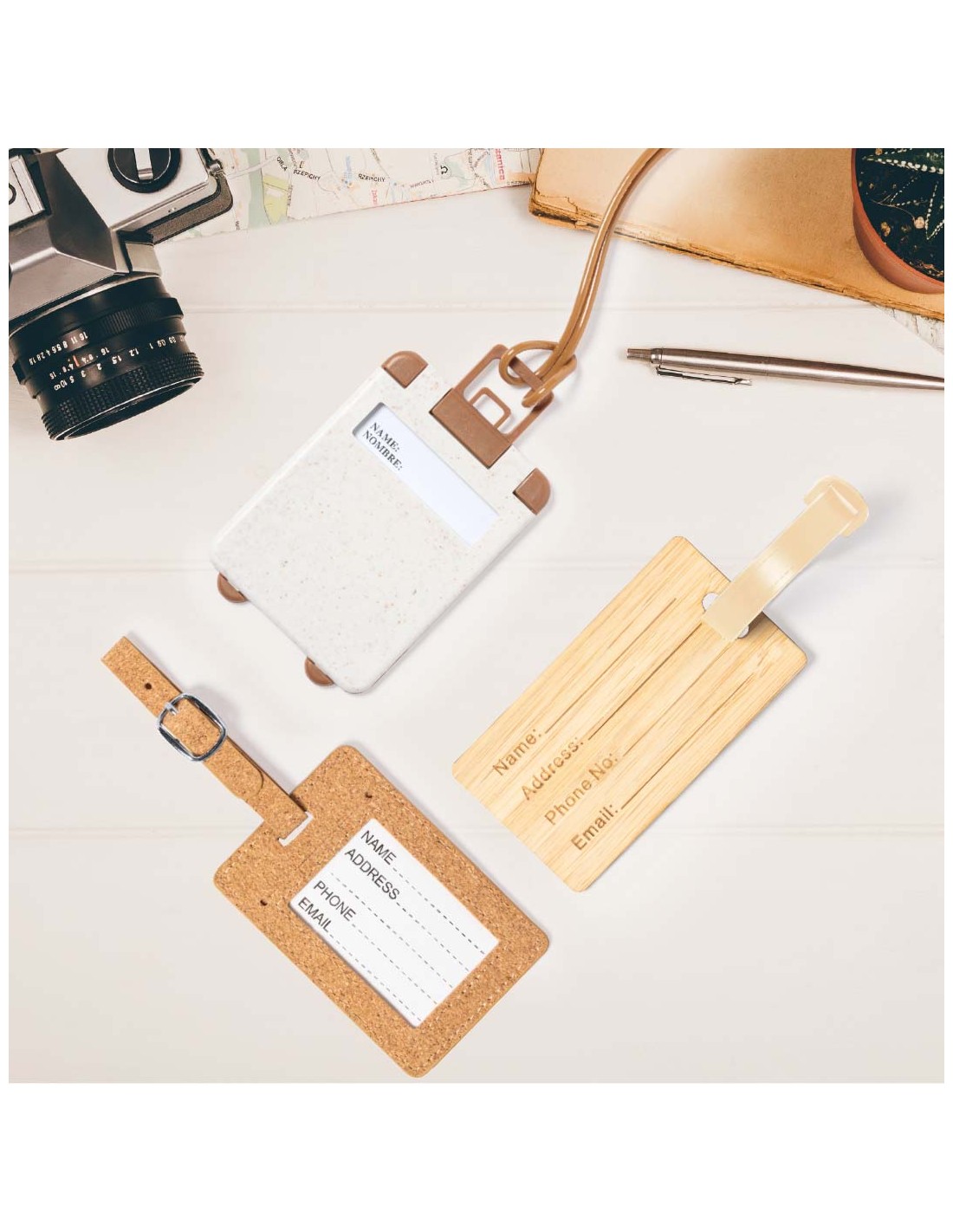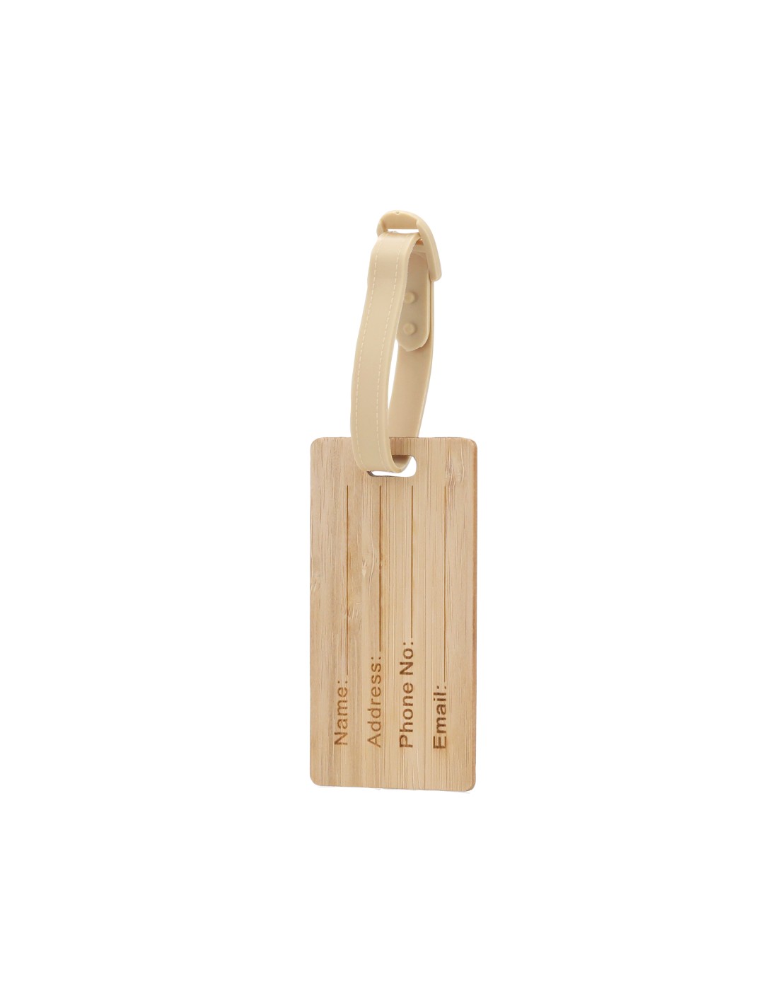 Identificador para maletas de línea nature fabricado en bambú. Cinta de acople con cierre de hebilla y datos de identificación en inglés, con cara opuesta lisa para marcaje.
