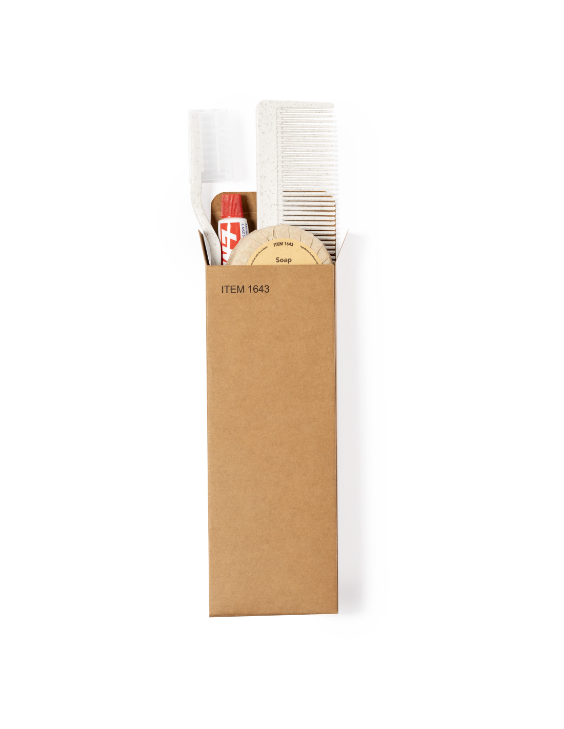 Set de aseo esencial con cepillo de dientes, pasta de dientes, peine y jabón. Contenido: Cepillo de dientes y peine fabricados en caña de trigo, para así fomentar la utilización de materias primas naturales y reducir las emisiones contaminantes. Pasta dentífrica en tubo de 6 gr, con tapón a rosca. Pastilla de jabón de 20 gr. Set presentado en caja individual de diseño kraft.