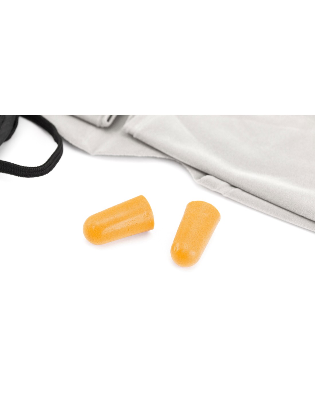 Set de viaje de 3 accesorios presentado en funda suave antelina en vivos colores. Incluye mascarilla en suave y confortable microfibra de acabado en color negro con doble elástico de ajuste a juego, almohadilla inflable para cuello en antelina y tapones en confortable material EVA de color naranja.