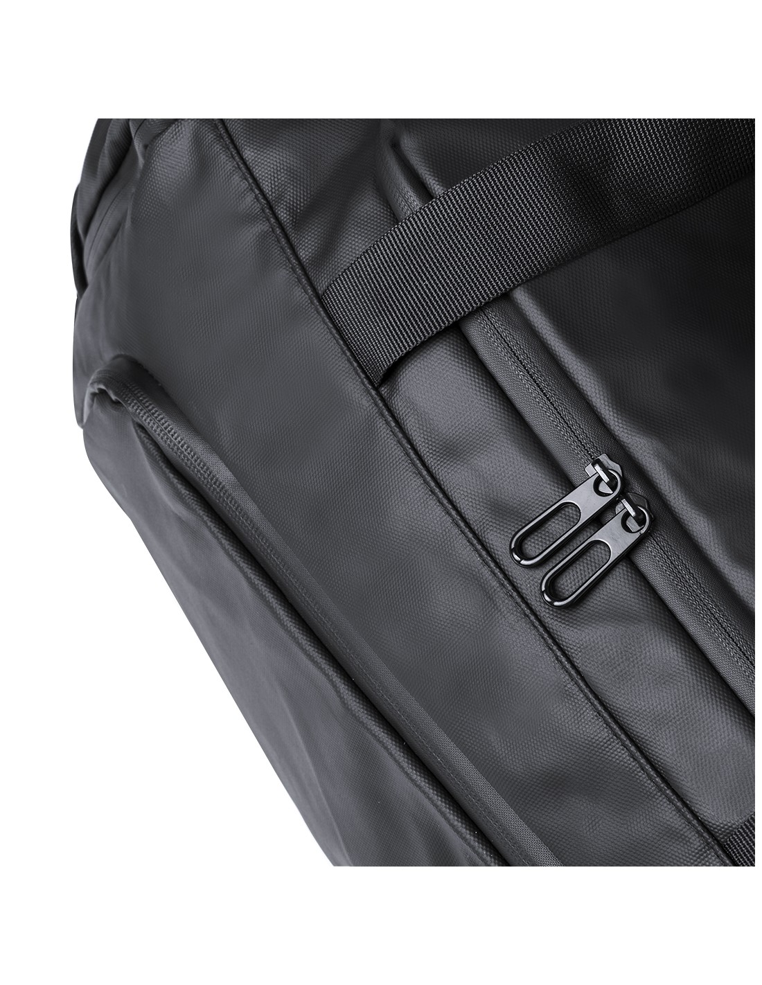 Bolso mochila confeccionado en resistente y suave polipiel. Su compartimento central se cierra mediante cremallera de doble tirador. Además, presenta un bolsillo lateral independiente y uno más en el otro extremo, ambos con cierre de cremallera; y en la base uno especialmente diseñado para zapatos. También incluye bolsillo exterior de rejilla. Ofrece tres opciones de transporte: como mochila, gracias a las asas acolchadas y plegables; como bolso de mano; o bien como bandolera gracias a su cinta para el hombro ajustable. Las cremalleras están discretamente ocultas para un diseño más elegante. Presentado en bolsa individual.