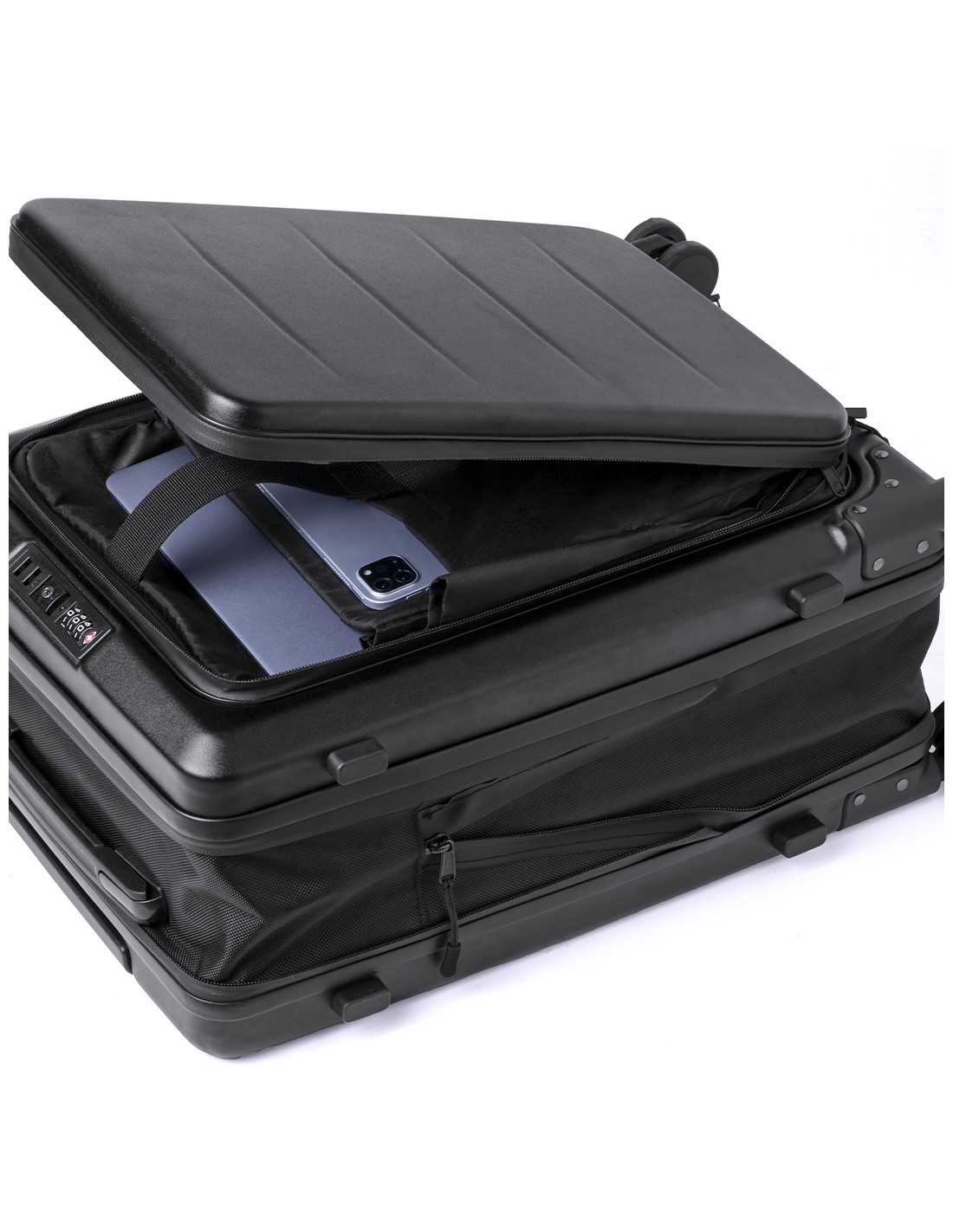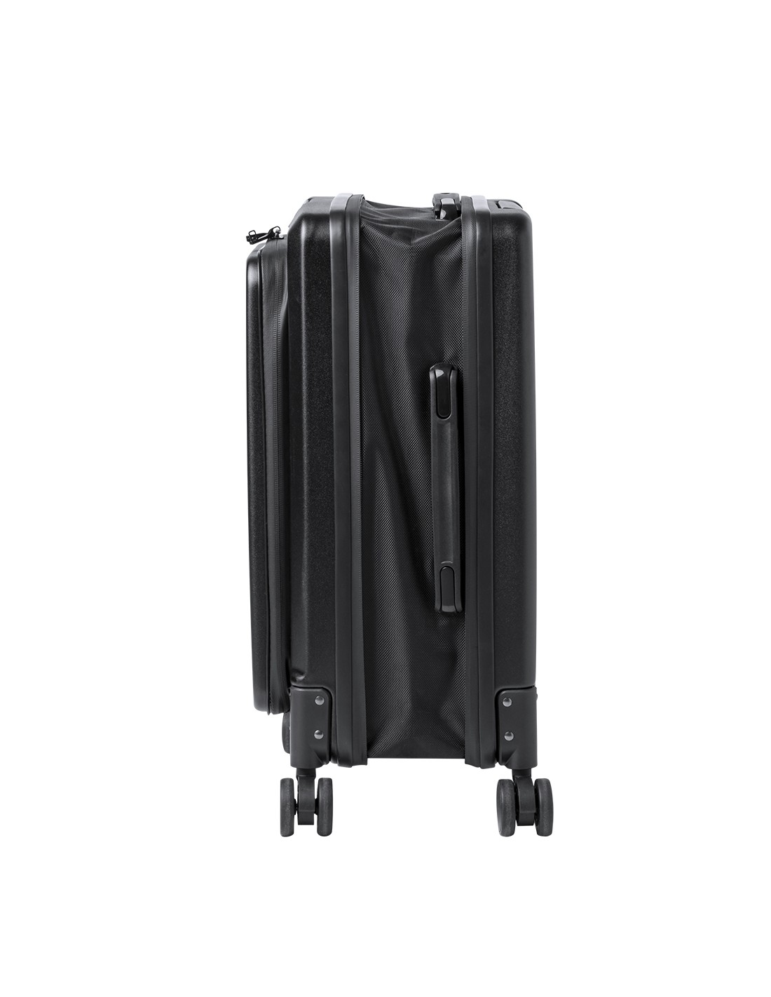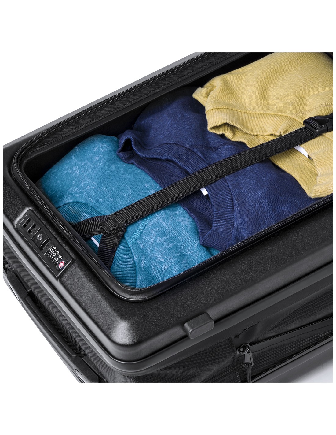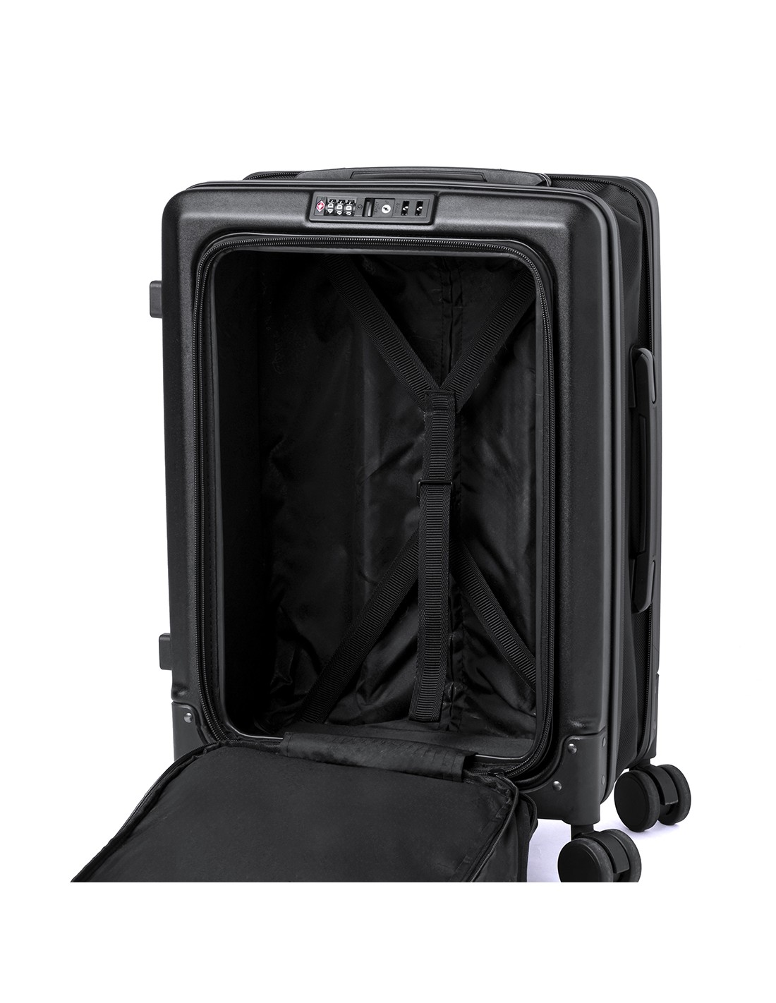 Práctico trolley plegable de 4 ruedas giratorias, en rígido ABS. Con la posibilidad de poder ampliar su capacidad por su parte central extensible, con cierre de cremallera de doble tirador. Equipado con un bolsillo acolchado para portátil de hasta 15 pulgadas y bolsillo para tablet de hasta 10 pulgadas, en la parte frontal. Cierre conforme a los estándares TSA -Administración de la Seguridad en el Transporte-, que permite a las autoridades de aduanas inspeccionar el contenido del equipaje sin tener que forzar o romper el cierre, a traves de una llave especial a disposición de la autoridad.
