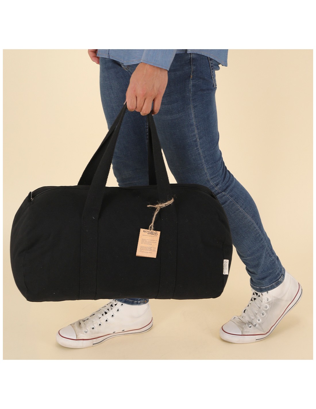 Bolso fabricado en material 100% canvas reciclado. Con resistentes asas alrededor del bolso y compartimento principal con cierre de cremallera. Etiqueta exterior con logotipo Algodón Reciclado.