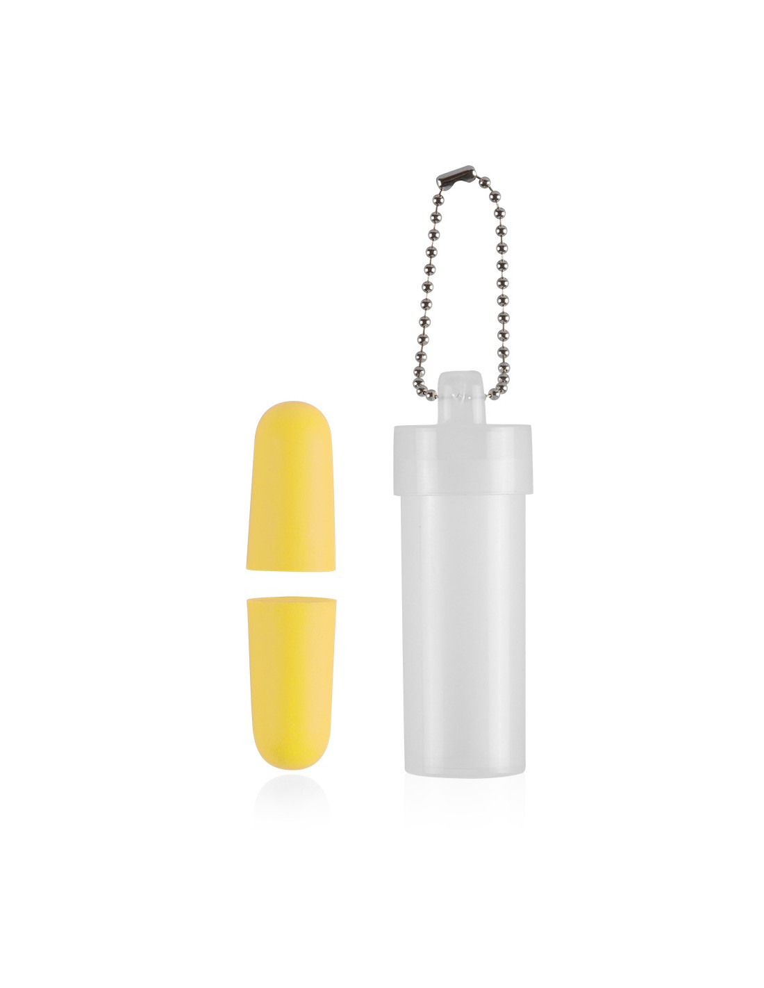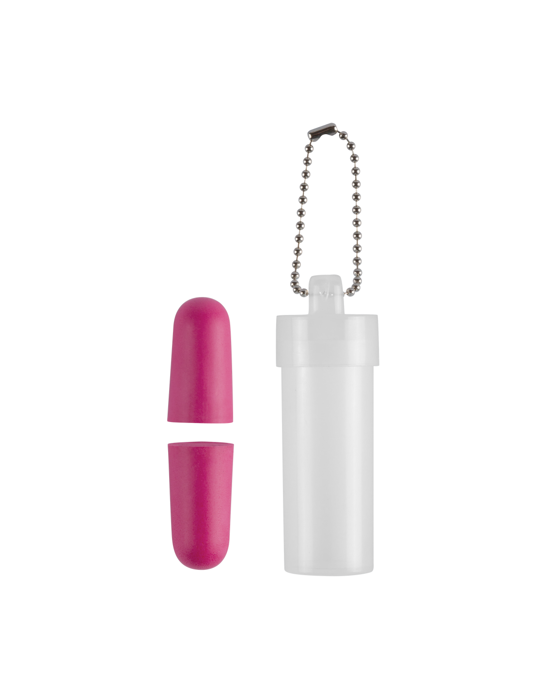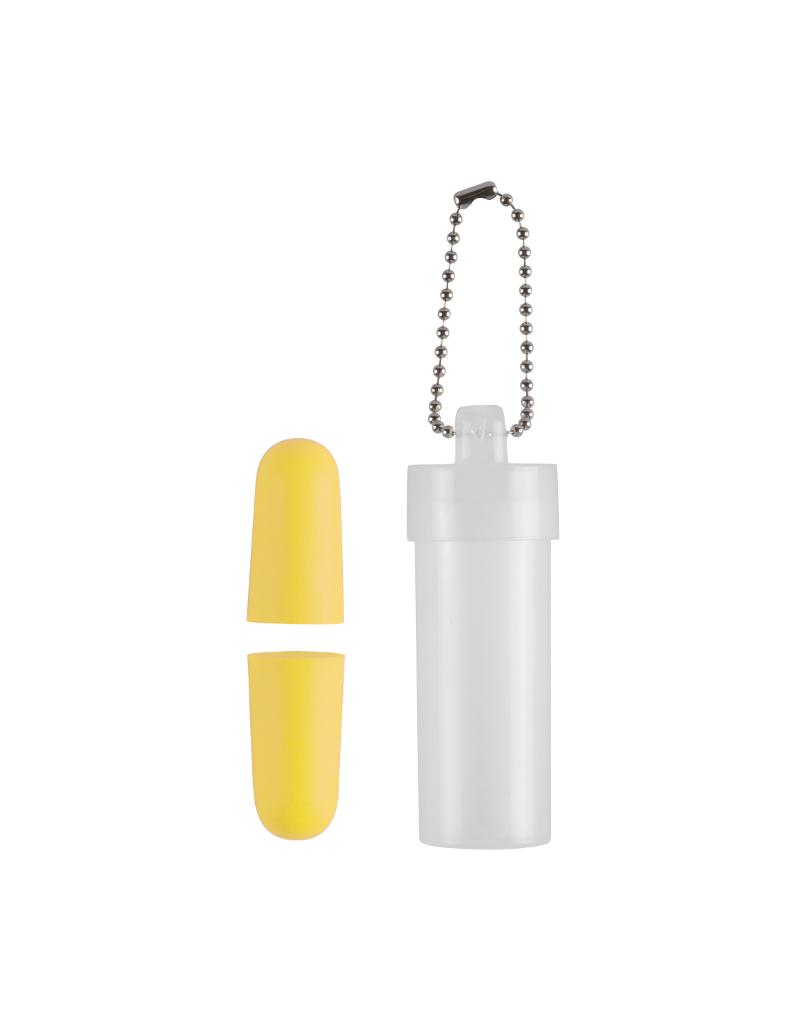 Confortables tapones para oídos en confortable material EVA de vivos colores. Presentados en estuche individual transparente con cadenita de transporte
