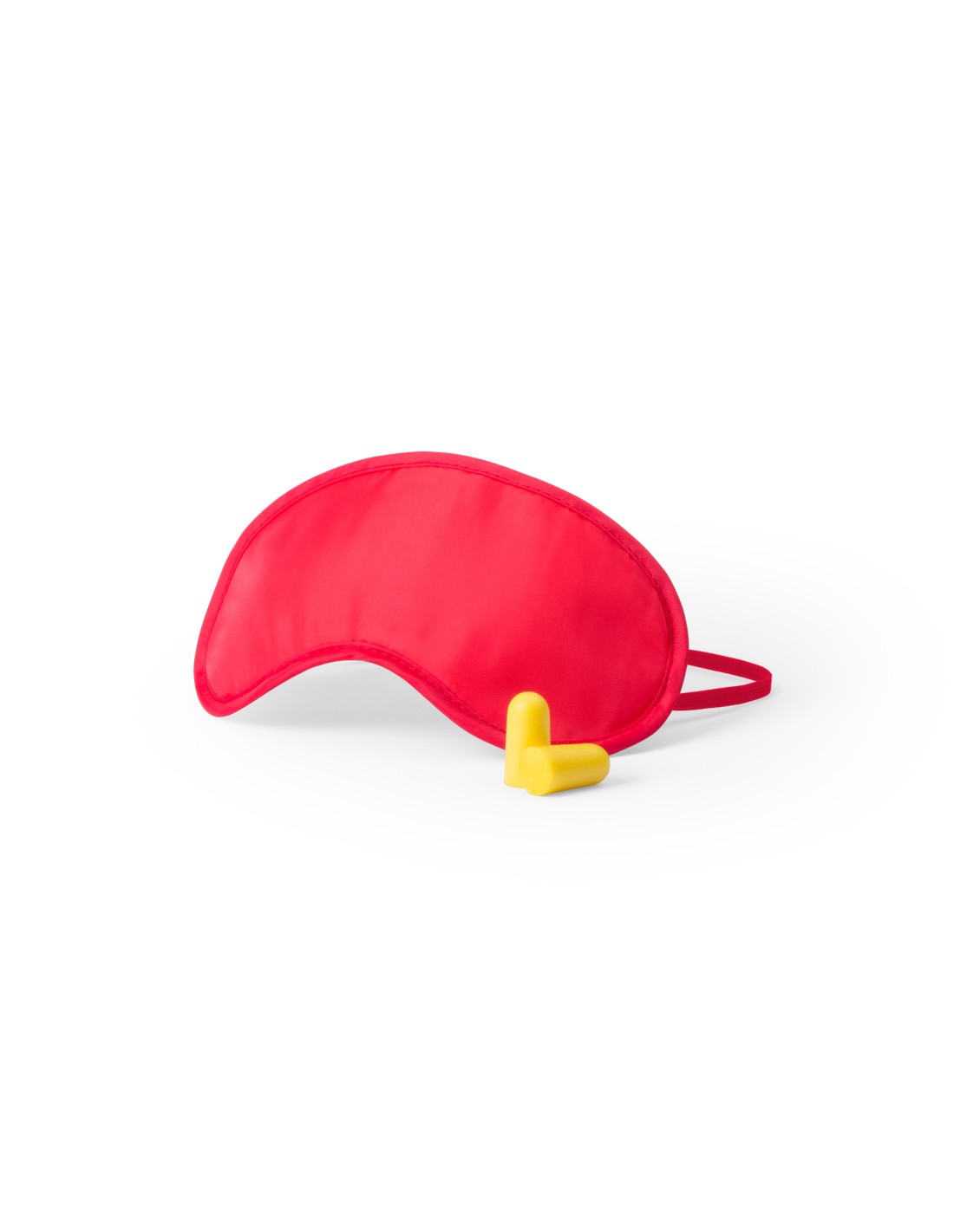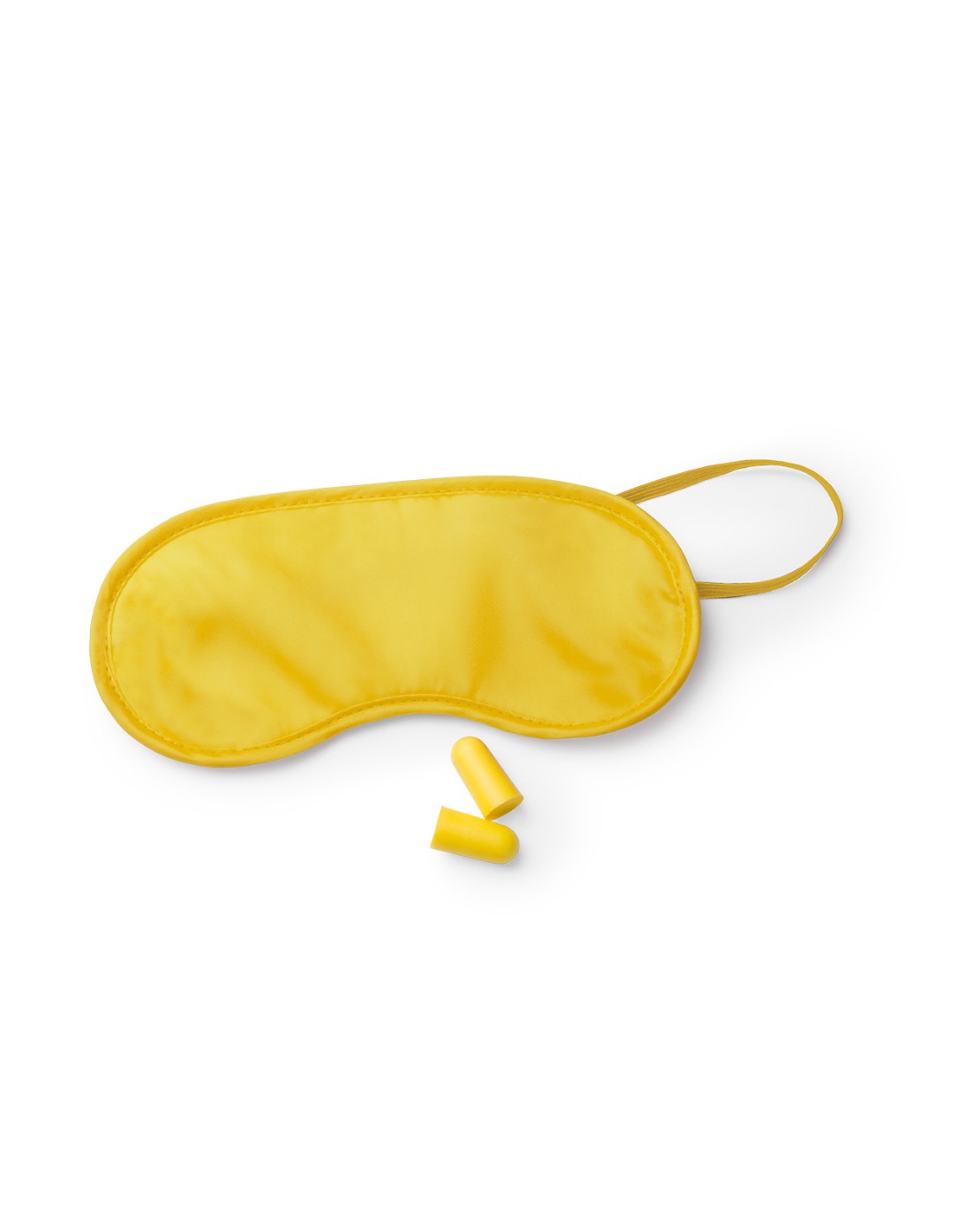 Set de viaje de mascarilla y tapones para oídos. Mascarilla en suave y confortable microfibra de vivos colores con elástico de ajuste a juego. Tapones en confortable material EVA de color amarillo. Presentado en bolsa individual.