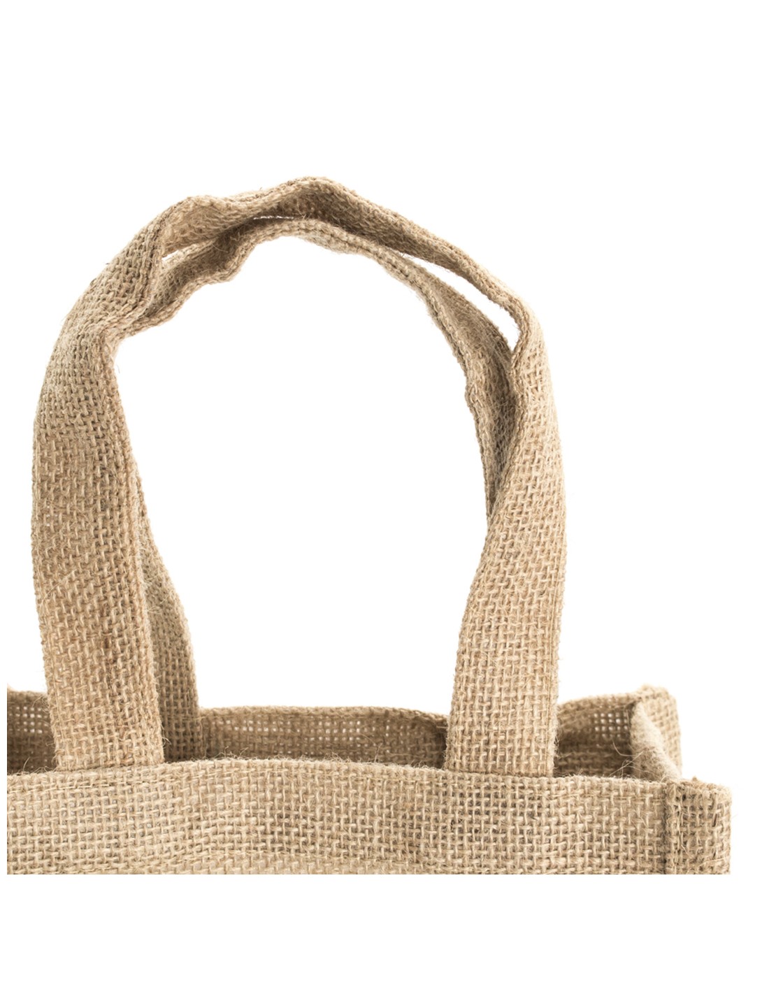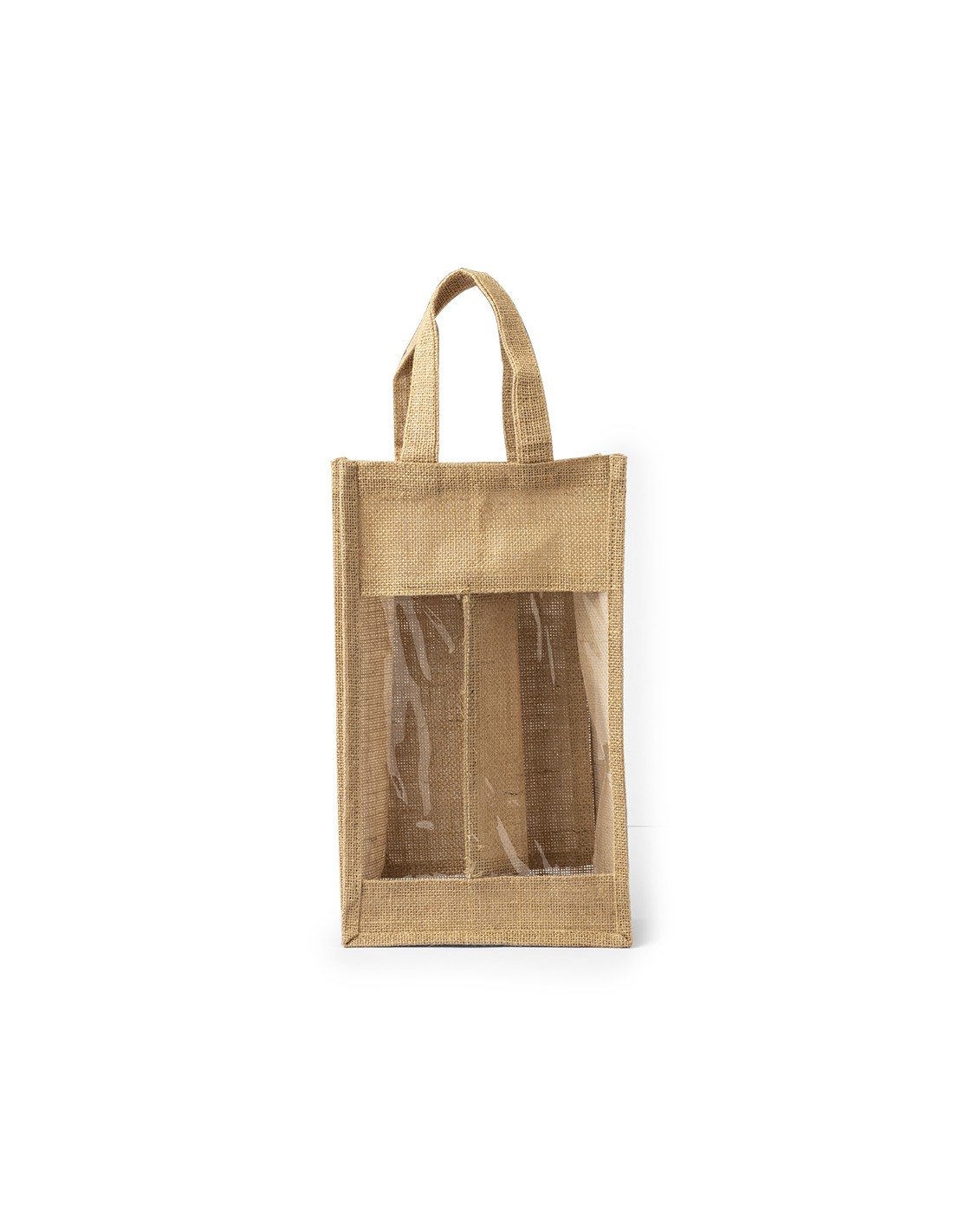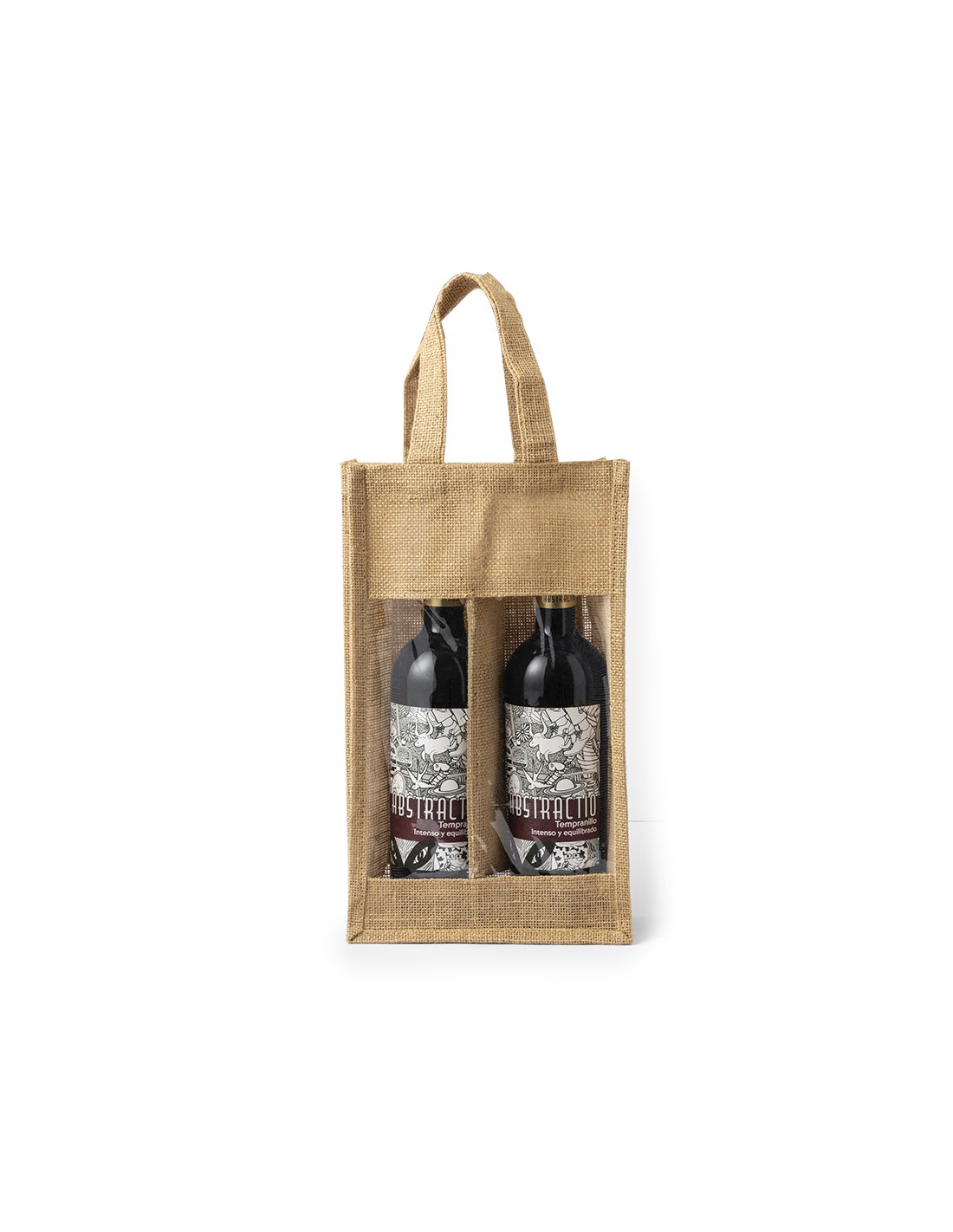 Resistente bolsa de yute laminado con compartimento individual para 2 botellas de vino de 75 cl. Con ventana transparente, ribetes y asas reforzadas.