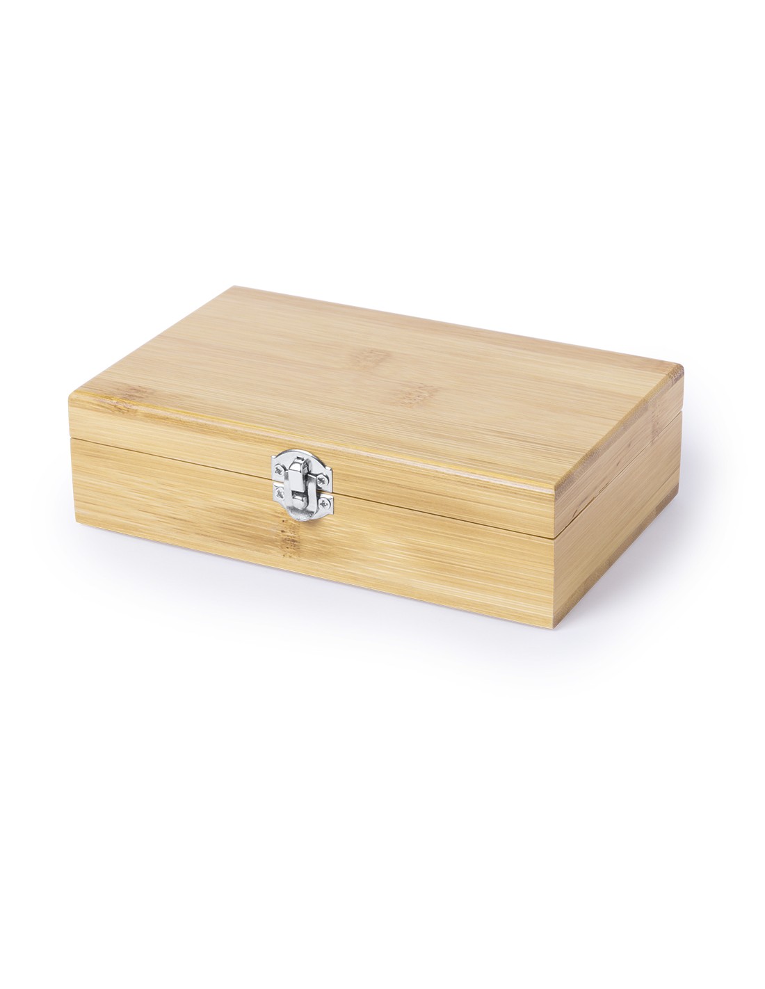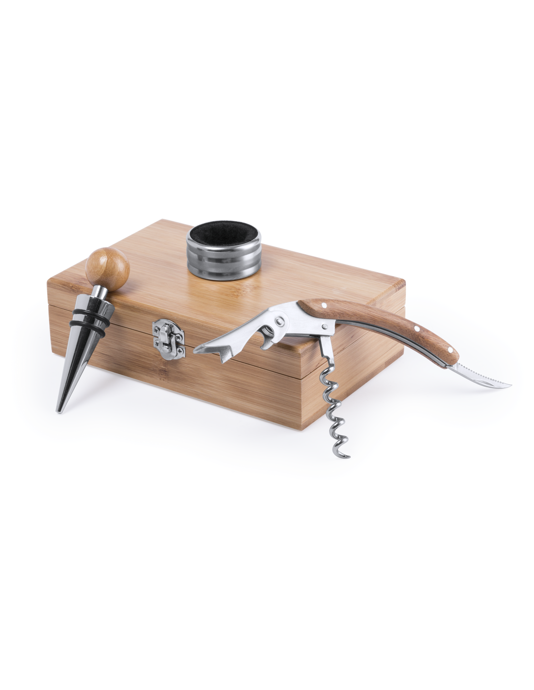 Set de vinos acabado en madera bambú. Accesorios de acero inox. Incluye sacacorchos, dosificador y recogegotas. Presentado en estuche individual de madera de bambú, con interior troquelado.