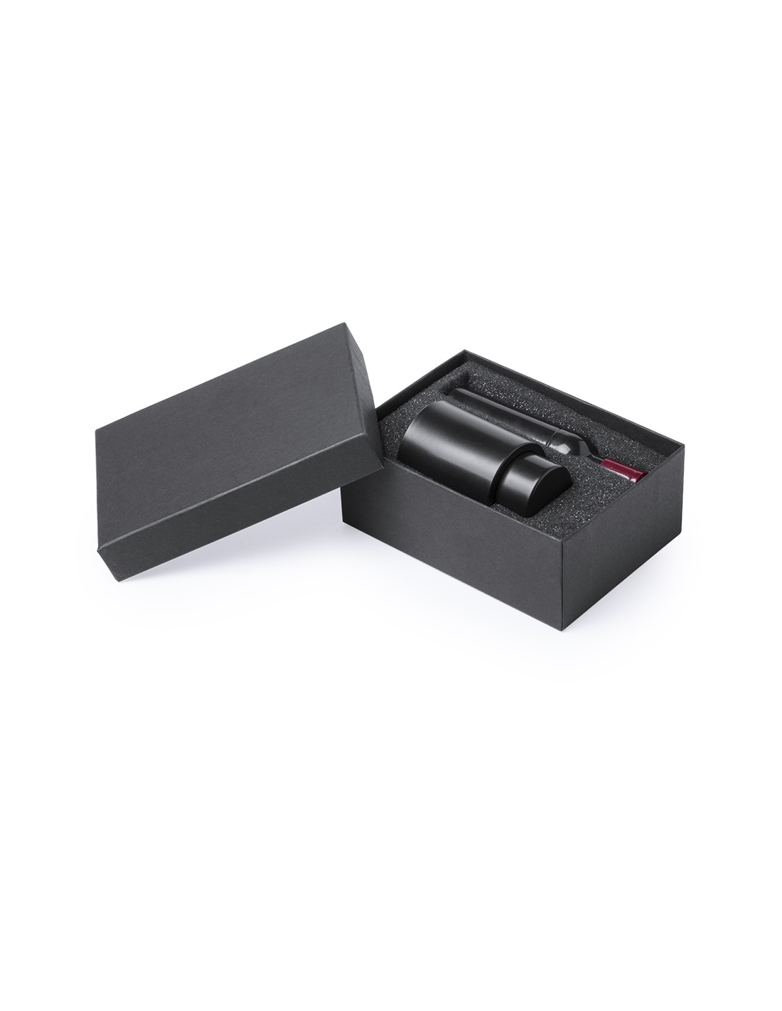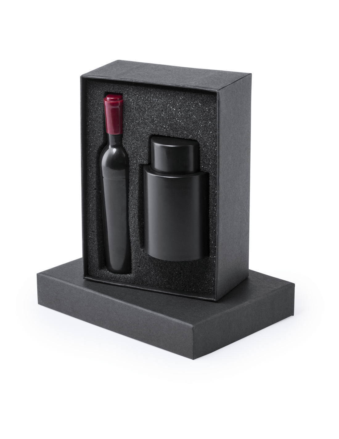 Original set de vinos con sacacorchos en forma de botella de vino y tapón con bomba de vacío. Presentado en estuche individual de cartón negro con interior en suave espuma troquelada.