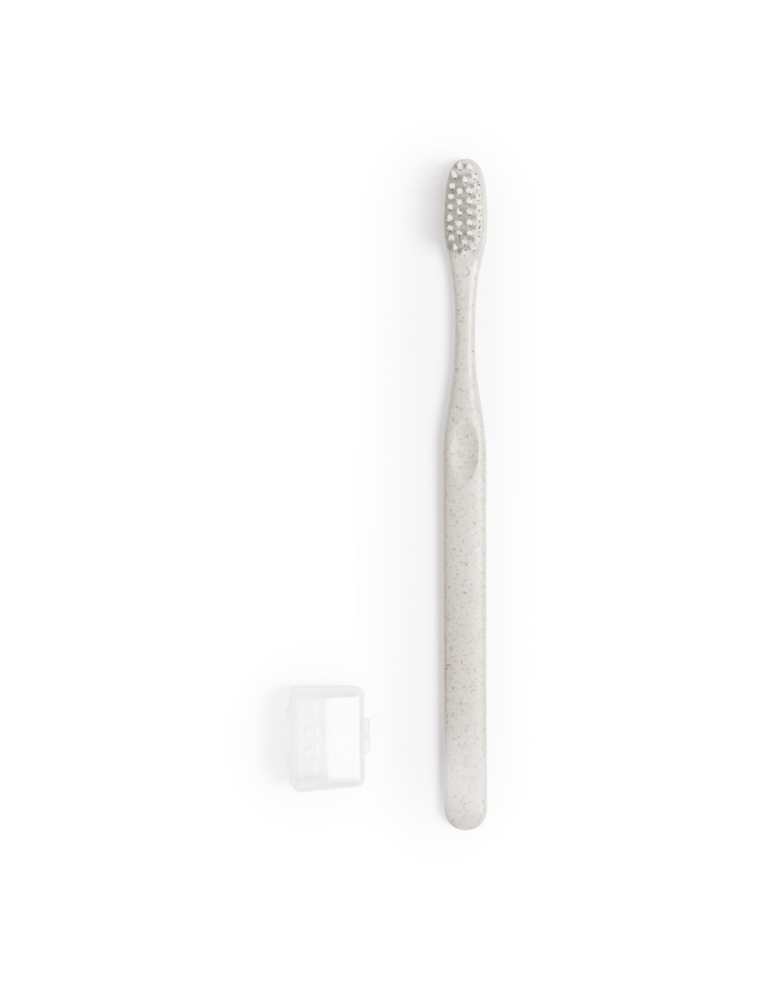 Cepillo de dientes de línea nature. Fabricado en caña de trigo, para así fomentar la utilización de materias primas naturales y reducir las emisiones contaminantes. Con capucha de protección.