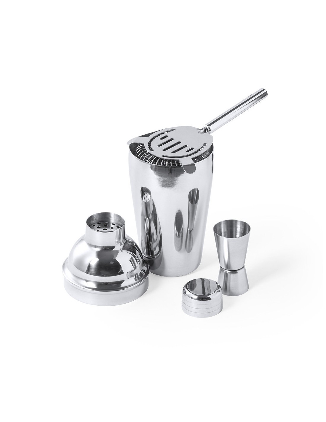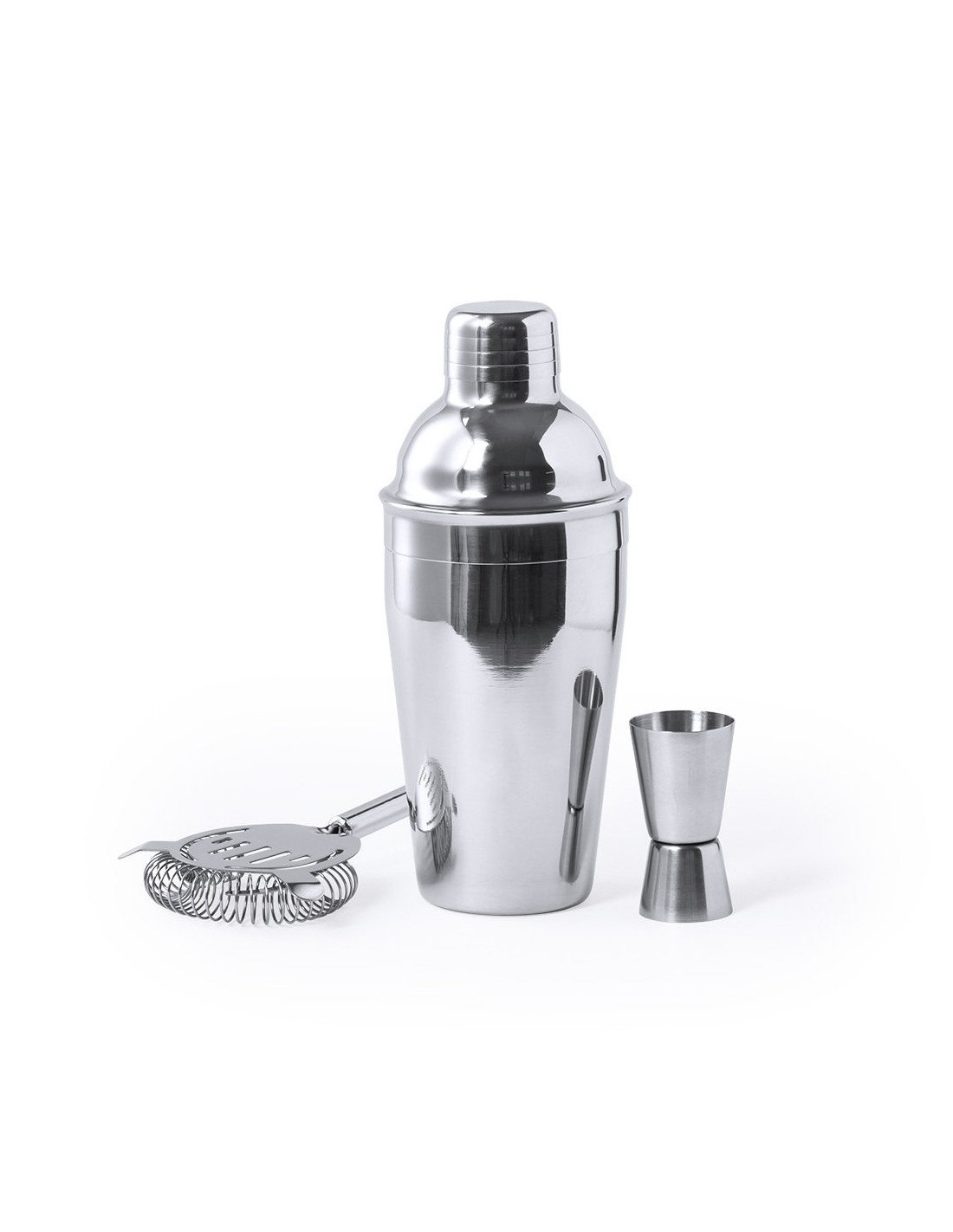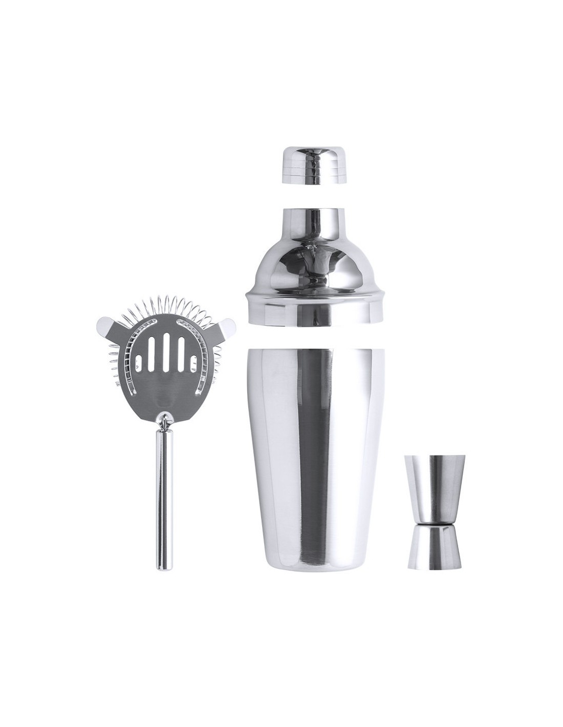 Set cóctel de 3 accesorios, fabricado en acero inox de acabado cromado. Incluye: Cocktelera de 550ml de capacidad, con cierre de seguridad y tapón dosificador en parte superior.Colador con asa.Medidor single/double.