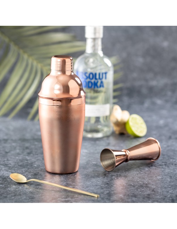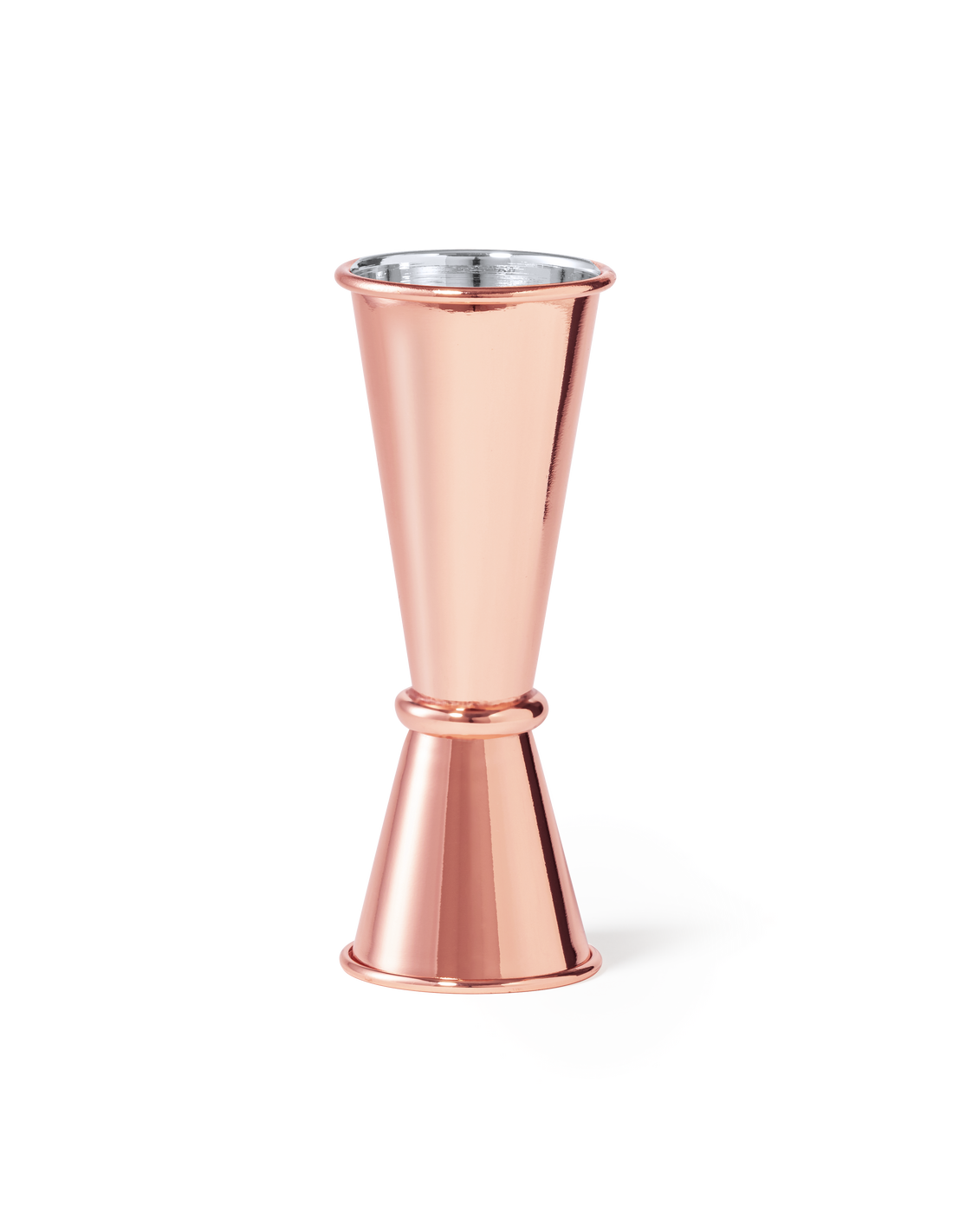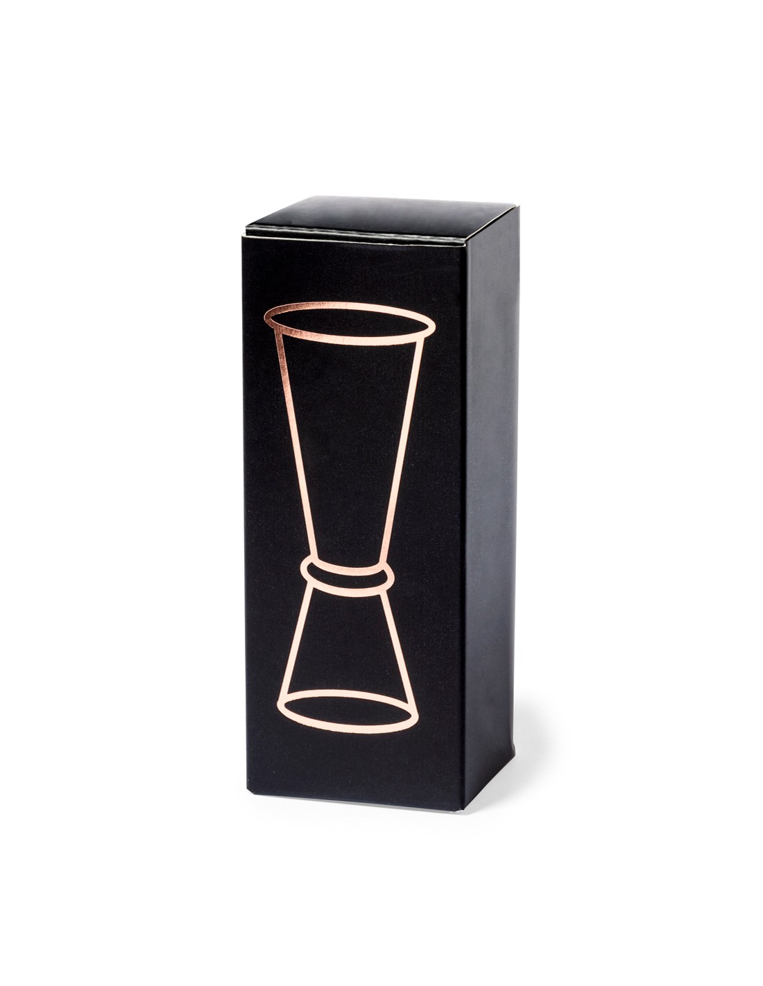 Medidor de bebidas fabricado en acero inox con recubrimiento exterior de cobre galvanizado. 2 dosificadores: sencillo 25ml y doble 50ml. Presentado en atractiva caja individual de diseño.